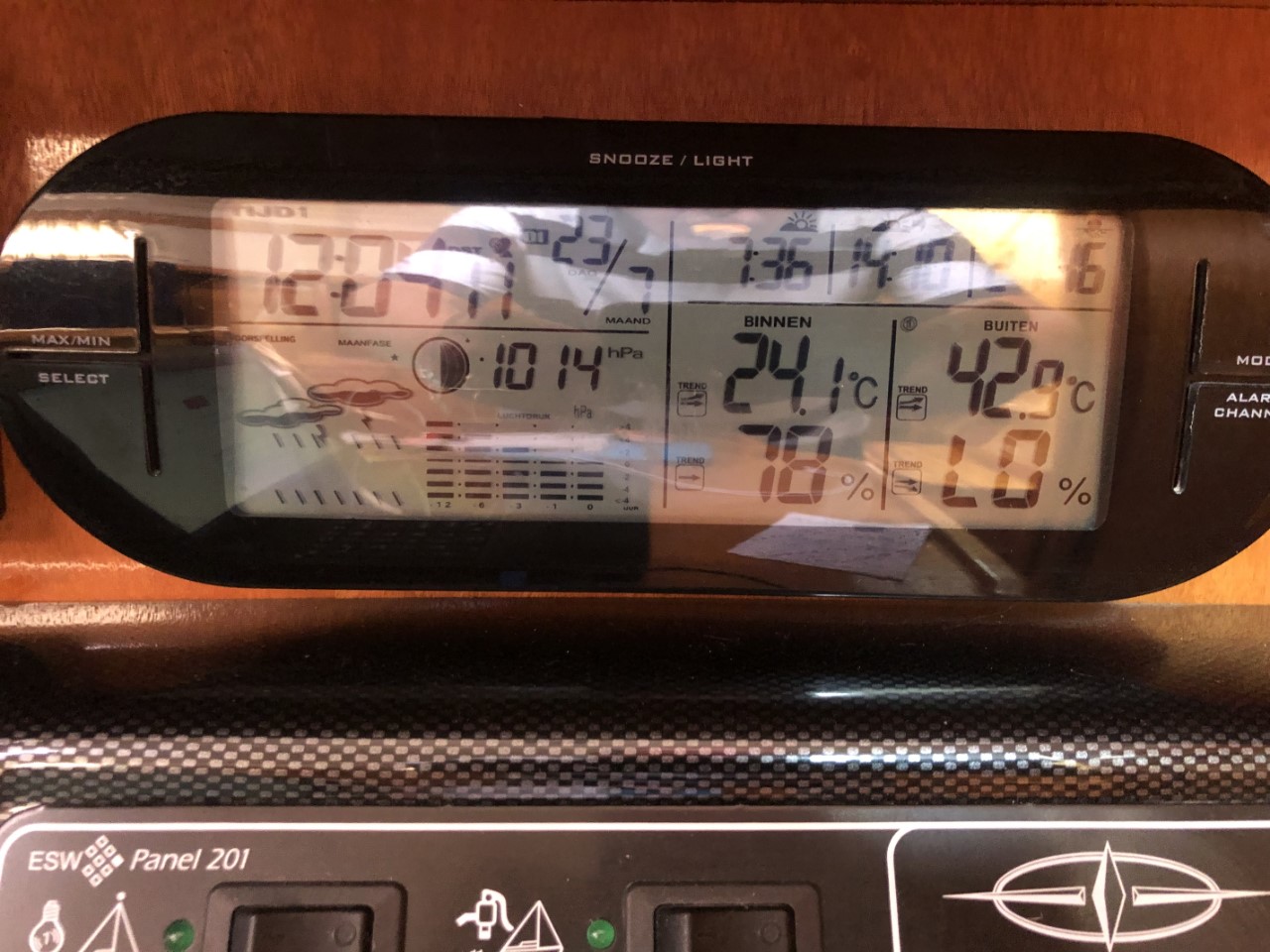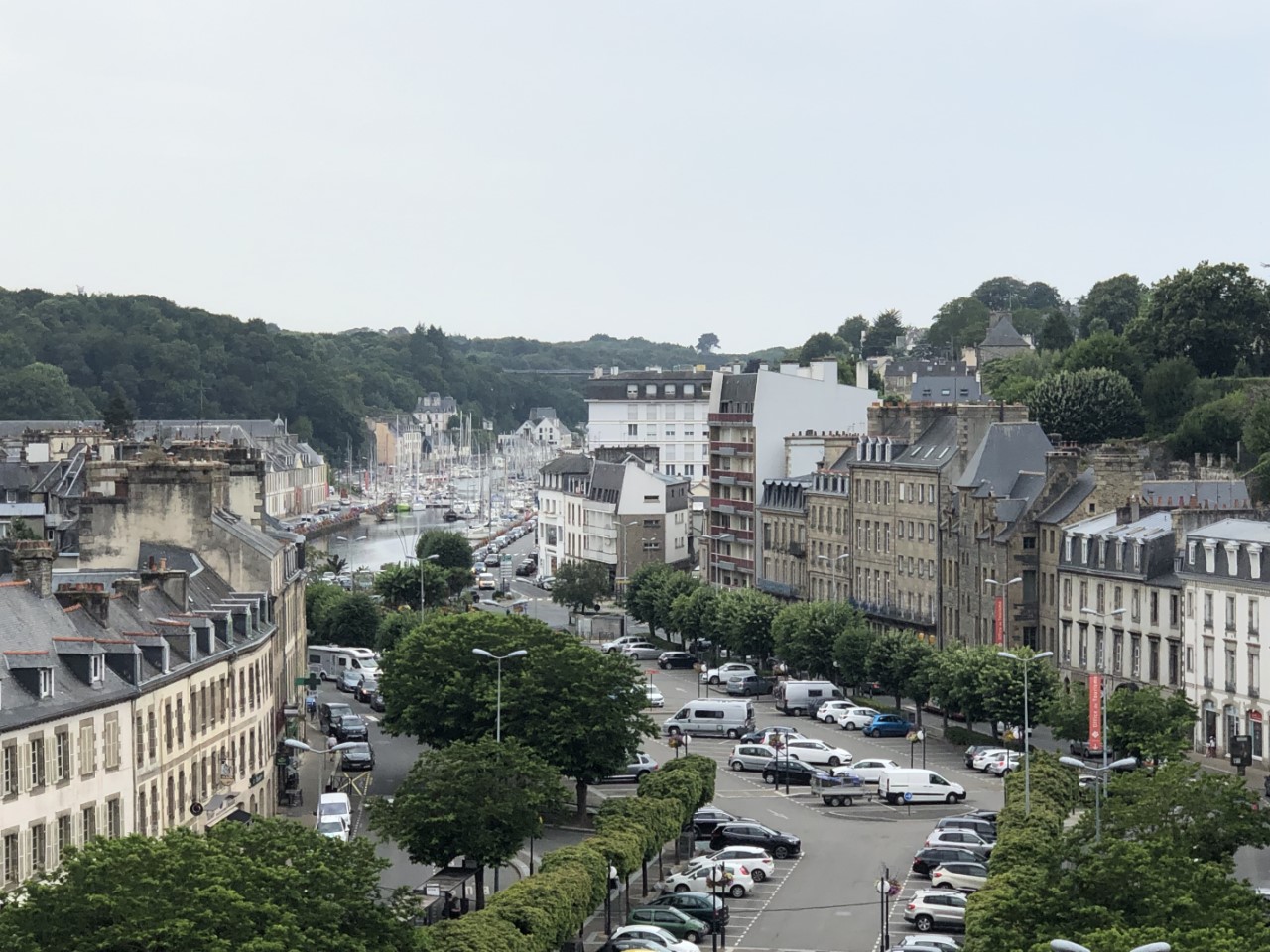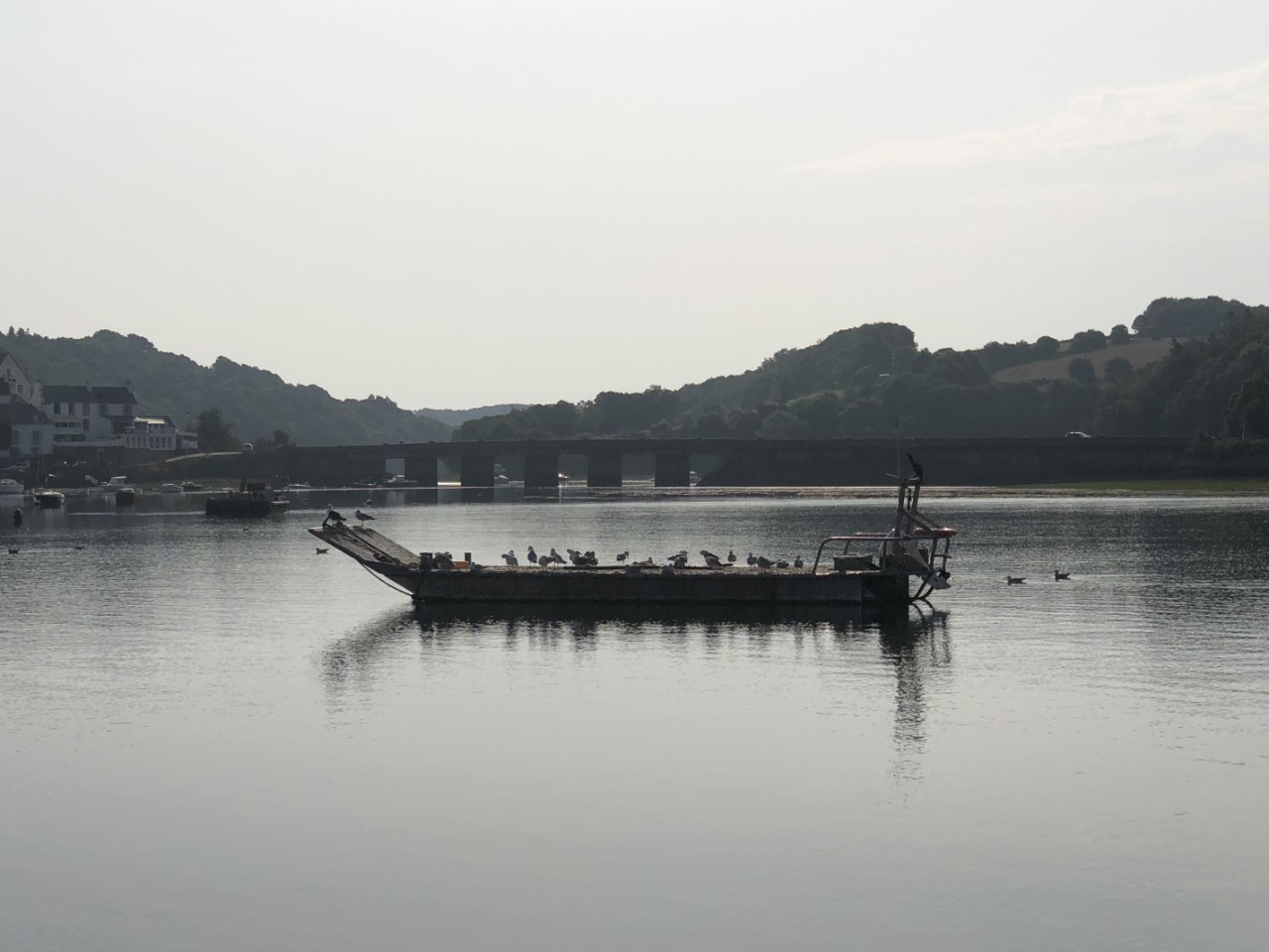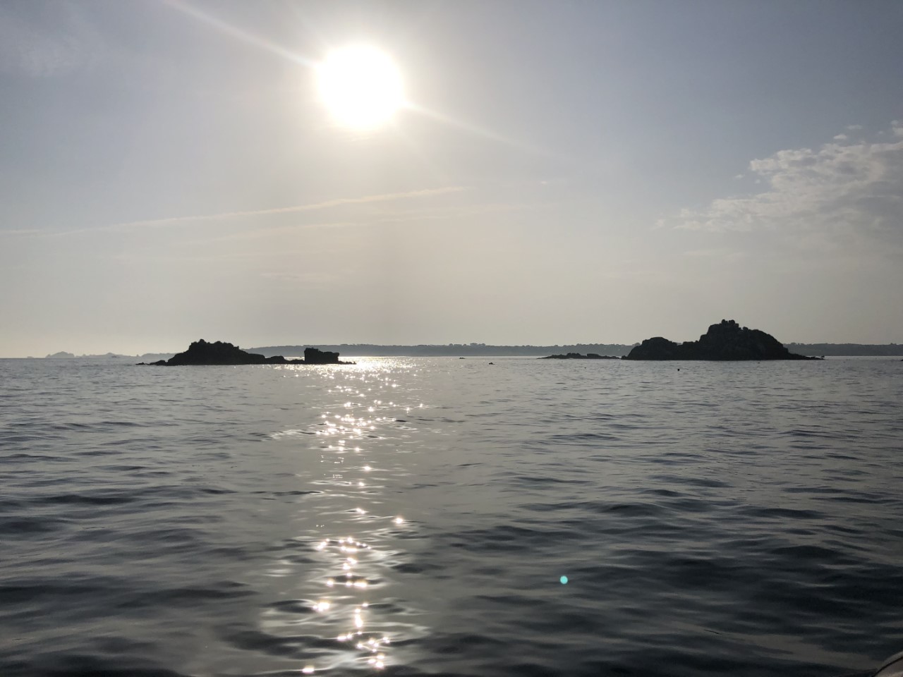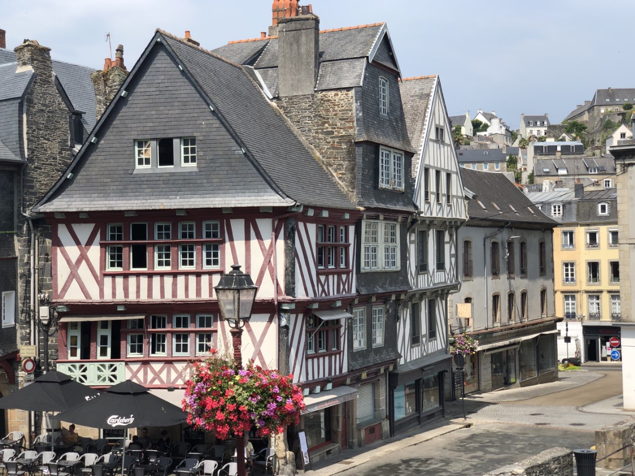 We vertrekken in de ochtend naar Morlaix. Een klein stukje over zee tussen de rotsen laverend kwamen we op een nu nog brede rivier. Op de rivier hadden we de stroming mee, maar we bleven netje tussen de boeien. Marianne had de havenmeester gebeld en had 3 tijden doorgekregen dat de sluis bediend zal worden. Wij gingen voor 10:31 uur, of 10 minuten later zoals de havenmeester zei. Door de mooi kronkelende rivier vaarden we rustig langs kleine dorpjes, grote landhuizen en donkere bossen. De rivier werd steeds smaller en de rode en groene tonnetjes leiden ons slingerend naar de sluis. Het laatste groene tonnetje dacht ik te kunnen afsnijden. De rode, groene en rode ton stonden bijna in een lijn. Een verkeerde keus. De Just kwam langzaam tot stilstand, beetje dom, maar we waren snel weer los van de bodem en we vervolgden de laatste 2 tonnetje braaf aan de juiste kant. We waren een kwartiertje te vroeg bij de sluis. In de sluis werden we keurig opgevangen en de lijntjes werden belegd, wat een service. We hebben in de box snel de bimini opgezet, want het was bloedje heet in de kuip. De buiten temperatuurmeter gaf 42 graden Celsius aan. Na een korte siësta hebben we het stadje bezocht. We hebben eerst een stadsmap gehaald en daar mee ook een stadstour met alle hoogtepunten. Een tegenvaller waren de hoge trappen van het viaduct, maar daar hadden we wel een mooi uitzicht over het stadje. Via allemaal kleine straatjes met een aparte bouwstijl qua huizen. Er waren veel leuke winkeltjes met snuisterijen, brocante en streekproducten. Aan de inrichting was veel zorg besteed. We kwamen op een pleintje waar we een 15e eeuws huis van binnen hebben bekeken. We zagen een grote openhaard en schoorsteen en een mooie hout bewerkte draaitrap met overlopen naar het voor- en achterhuis. We hebben ook een leuk restaurantje gezien met een aantrekkelijk menu. Dus wij rond 19:00 uur op pad om eerst langs de havenmeester te gaan, maar die doet alles tranquille en ook nu was hij er niet. Ook het restaurantje was nog gesloten en plan B eten aan boord, hadden we geen zin meer in. Dus zijn we de plaatselijke Fat-Kee maar binnen gelopen voor ons maaltje, een prima keus. Ook op de terugweg was ons plan A nog steeds gesloten. De havenmeester was nu wel in z’n kantoortje en hebben we de administratie afgewerkt op zijn manier tranquille. Een flink half uur later stonden we buiten. Morgen kunnen we pas om 11:22 uur de sluis nemen om weer de open zee te bereiken. Het is hier een leuk Frans plaatsje voor een dag.