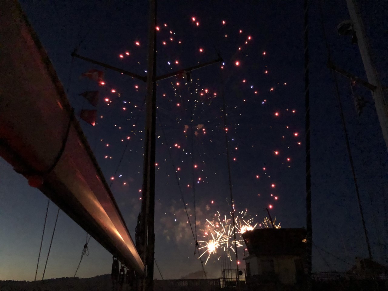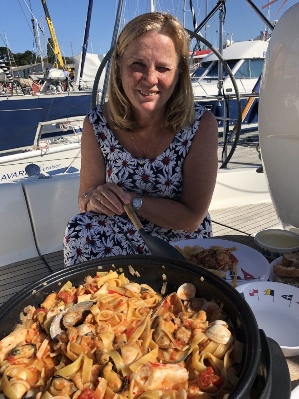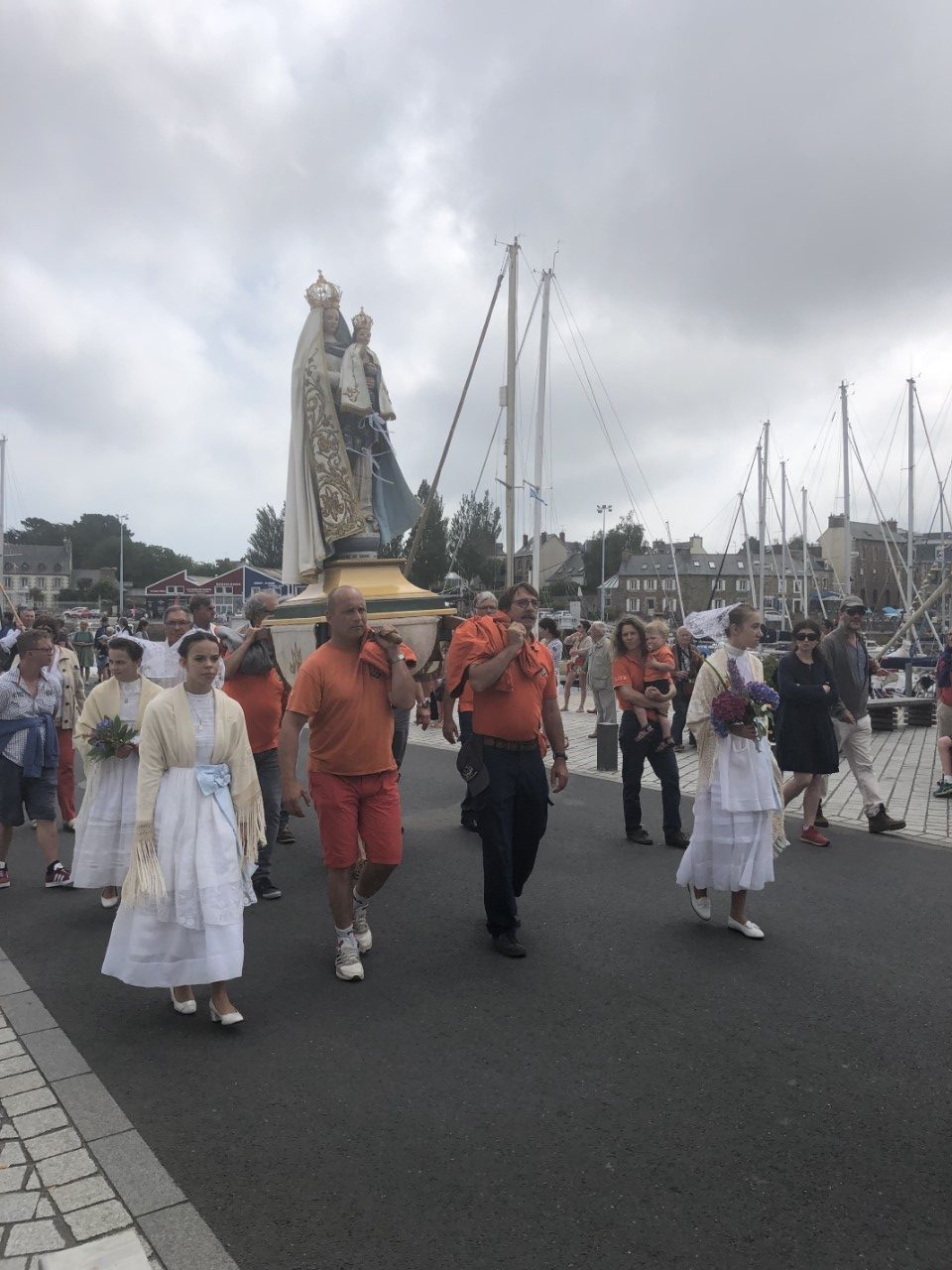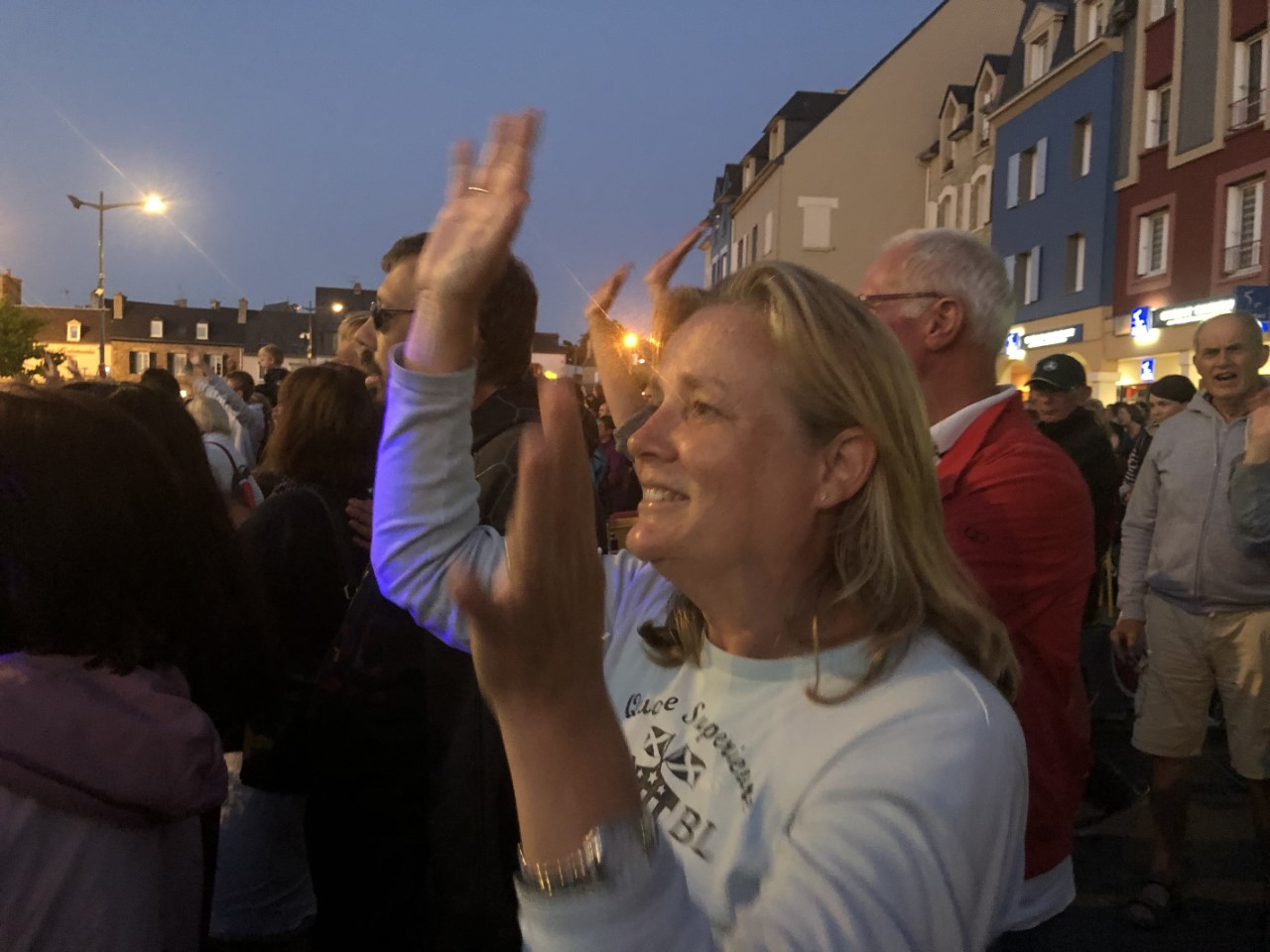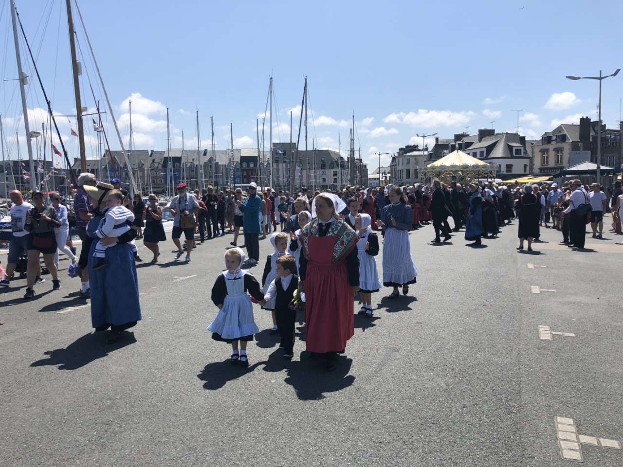 We gingen vroeg naar bed 22:00 uur. Rond 22:30 belden Daniel, Mark & Marion voor een praatje en dat ze naar Alladin waren geweest. Het was een hele leuke film. Wij weer omdraaien en snel slapen. Barst er even na 23:00 uur een groot vuurwerk los boven het strandje vlak bij de haven. Wij waren verbaasd, want meestal is er vuurwerk op 14 juli. Om 23:30 was de vuurwerkshow voorbij en wij snel naar bed, we lagen nog niet of ze begonnen weer met vuurwerk. Dat hebben we niet meer gezien, we moeten nu echt snel slapen, want over 3 uurtjes gaat de wekker. Om 03:30 vaarden we haven uit met een ondergaande maan aan bakboord en een mooie sterrenhemel boven ons. De Melkweg was goed zichtbaar en vele andere sterren. Wij zetten koers naar het steelpannetje. Marianne kreeg slaap van alle sterretjes en ging in de kajuit even haar oogjes sluiten. Langzaam verdwenen de sterren en kwam de zon op. Tussen de rotsen laverend kwamen we aan in Paimpol. Even wachten voor de sluis en na het schutten gingen we op zoek naar de havenmeester. Deze verwees ons naar een paar ligplaatsen en daar hebben we een mooie uitgezocht. Marianne dekte de tafel en ik ging op zoek naar een bakkertje. Om 08:00 zaten we aan het ontbijt en waren we klaar voor de feestelijkheden van Quatorze Juillet, hier in het nog stille Paimpol. Tegen de middag gingen we wat wandelen. Er zijn leuke restaurantjes rond de haven en in de zijstraatjes zijn allerlei snuisterijen winkeltjes. We werden ook nog verrast op een defilé van klassieke auto’s en een heuse processie met Mariabeeld, doedelzakken en dames en heren in klederdracht. Bij de toeristen informatie hebben we wat folders en fietsroutes gehaald. Terug op de Just heb ik een duik genomen onder de Just. We hebben met ons onderwatercameraatje gezien, dat er wat wier in de schroef zat en dat heb ik even verwijderd. Eindelijk was het tijd voor een korte siësta. Om half drie stond weer het volgende feest op de agenda, een soort van River Dance optredens, maar dan met bejaarden, jammer een gemiste kans. We hebben het niet helemaal uitgezeten, want het laatste dansgroepje had beter in het bejaardentehuis kunnen blijven. We hebben voor het diner een heerlijke Fruit de Mer met pastaschotel bereid en die onder een stralend zonnetje in de kuip op geslobberd, met een lekkere crèpe met suiker als toetje. Tijd voor het volgende feest, Franse discomuziek op de kade. Maar eerst een super groot ijsje, waar ze in een lange rij voor stonden om er eentje te mogen kopen. Het was het wachten waard. De band en de danseressen waren heel goed en we hebben geluisterd totdat het tijd was om terug te gaan naar de Just, waar we op een eerste klas plaats vanuit de kuip naar het vuurwerk hebben gekeken. En nu heel snel naar bed, want het was een lange dag.