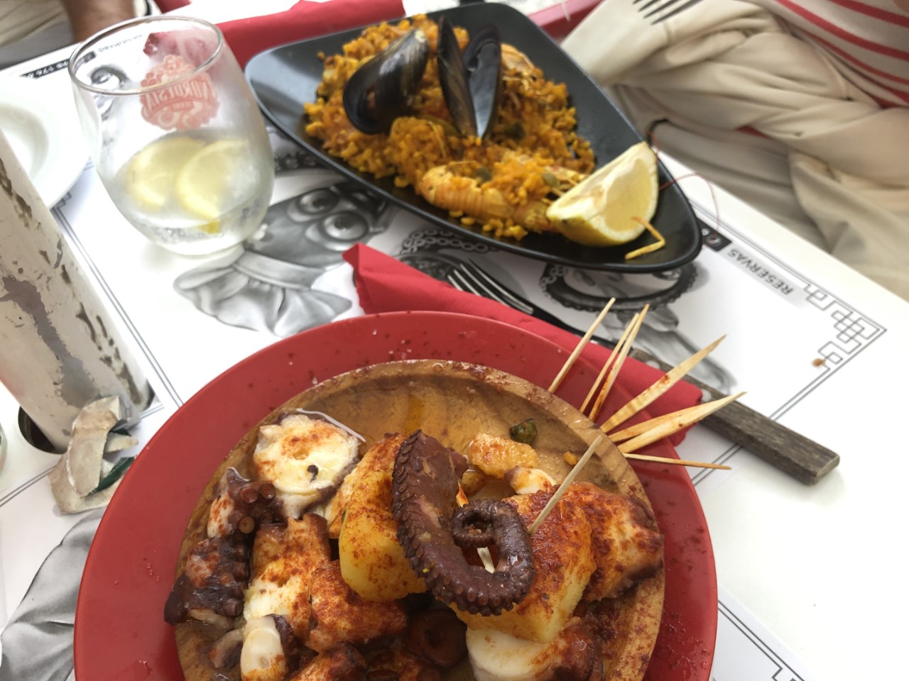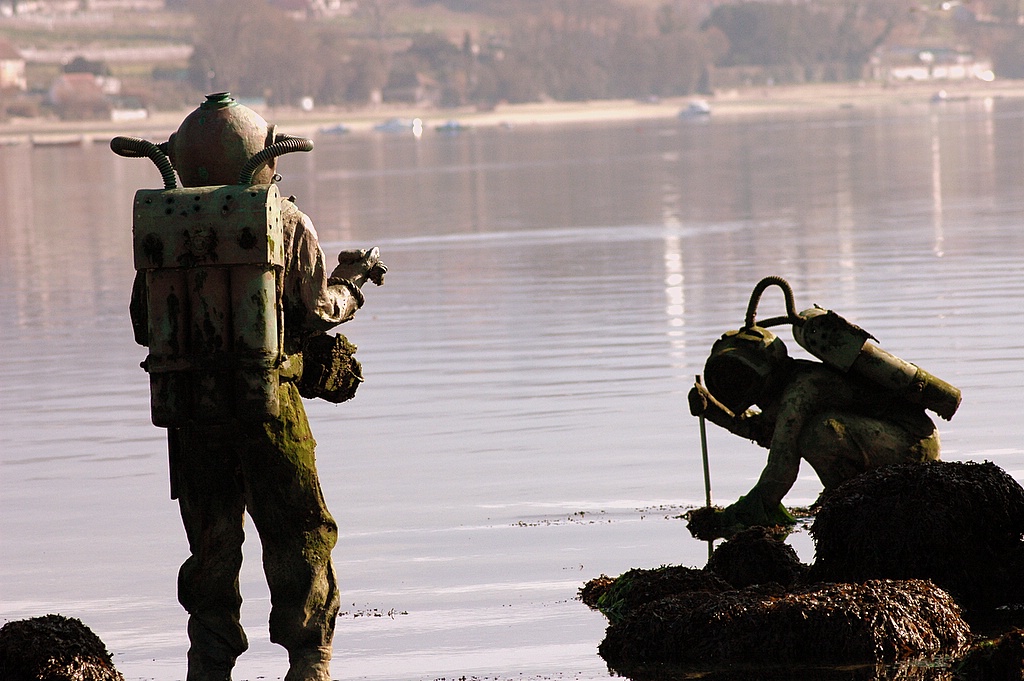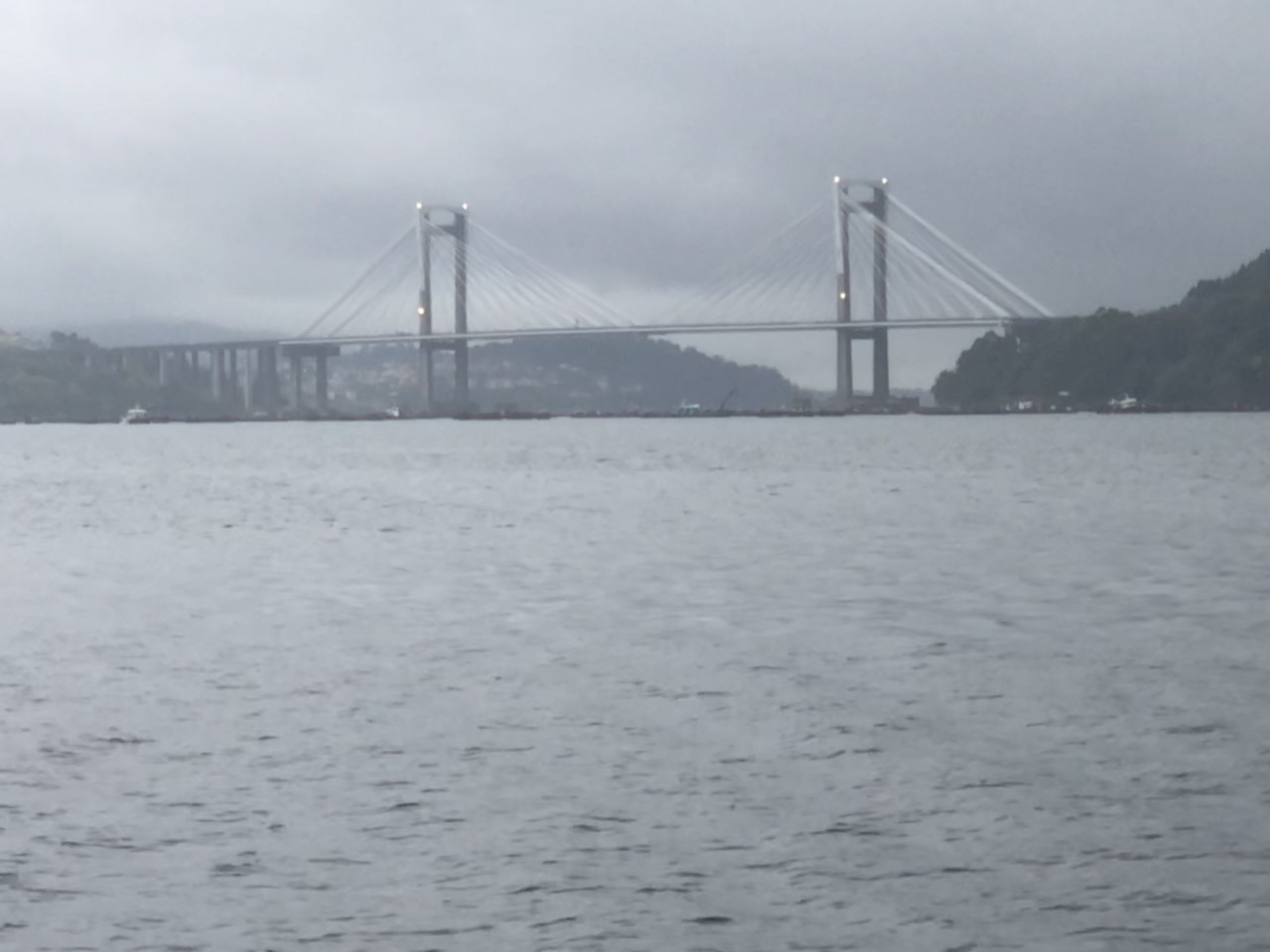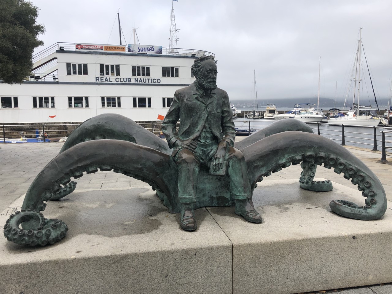 De dag begon troosteloos met regen, grijs en mistig. Maar we hadden een rustig ankerplekje, minder mooi, waarschijnlijk omdat de zon niet scheen. We keken uit op een groot strand en het was “peacefull” zoals het in onze Reeds almanak omschreven staat. Aan de andere zijde lagen we achter een eiland. Bovendien hadden we ook nog een bijzonder kunstwerk voor onze boeg, Captain Nemo, die bij laagwater boven de waterspiegel komt opduiken en daarbij Jules Verne op zijn sokkel die ook bij hoogwater nog te zien is. Er schijnt ook een beeld van Jules Verne in de haven van Vigo te staan, die we van de week op gaan zoeken. We hebben in de regen het anker gelicht en afscheid genomen van Nemo. We gingen met wind tegen richting Cangas. De bimini gaf nu bescherming tegen de regen. De grote hangbrug was bijna niet te zien in de laaghangende bewolking. Vlakbij Cangas heeft Marianne het havenkantoor gebeld om een plekje te regelen, maar helaas ze hebben geen plaats meer. We hebben een U-turn gemaakt en koers gezet naar Vigo aan de overkant van de ria. Gelukkig hadden ze daar wel plaats en nu in de andere havenkom, dan in die uithoek waar we zaterdag lagen. Maar ook hier werkte de Wifi nog steeds niet, jammer, het zit ons niet mee in de Ria van Vigo. Maar de winkels zijn deze keer wel open en we zijn door de regen naar het grote shoppingcentre gelopen. Even zijn we bij de Media Markt binnengelopen en dat was bijna de enige winkel in heel het centre, want er was veel leegstand. De koffie was slecht en duur, €1,55 voor een kopje, een koopje voor Nederlandse begrippen. We vonden het beeld van Jules Verne met een grote octopus. We hebben voor vanavond een restaurantje gereserveerd en omdat het na 14:00 uur is en de siësta uitbreekt in Spanje, zijn we terug naar de Just gegaan om een filmpje te kijken. Rond 17:30 uur zijn de winkels weer open en dan zijn we eindelijk een bruisend wakker Vigo uitgebreid gaan bezoeken. Gelukkig was het ook nog droog geworden. De oude stad heeft hoge statige gebouwen met prachtige balkons en pilaren. Er staan antieke lantaarnpalen langs brede avenues en bovendien was er een concert op straat. We hebben heerlijk gegeten, allemaal Spaanse specialiteiten voor een redelijke prijs.