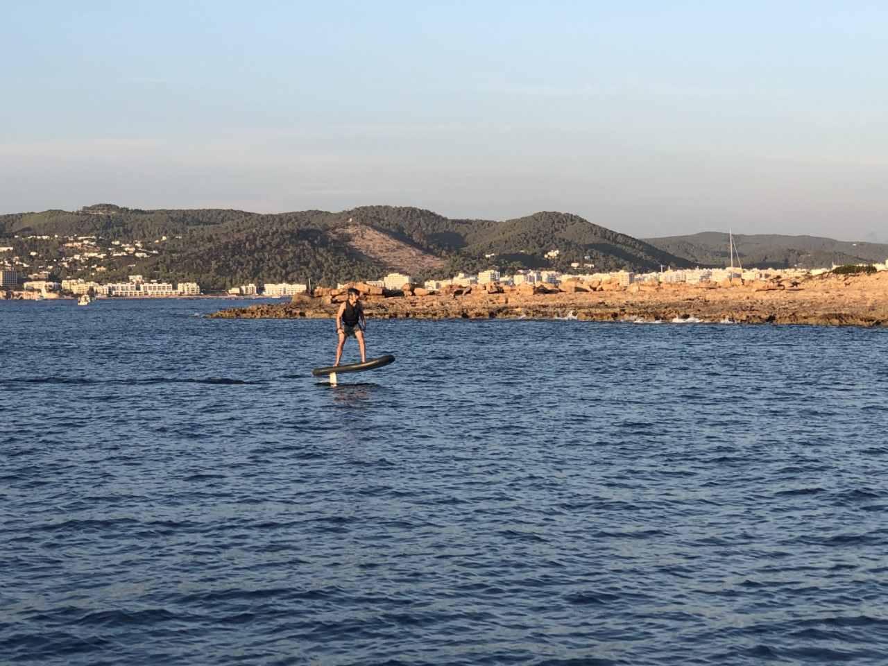 De rest van de middag hebben we niet veel gedaan. Er komen wat meer bootjes en we verbazen ons over de verschillende ankertechnieken, maar iedereen mag zijn voorkeuren hebben. Tegen de avond zijn ze in de Cala met een foilingboard bezig. Dat is een korte surfplank, die hoog uit het water komt door middel van een elektramotor, ook leuk om te zien.