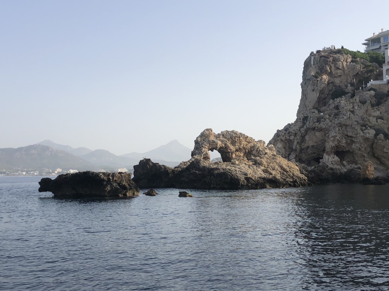 We varen in het begin langs een mooie kustlijn met apart gevormde rotsen, maar als we de baai van Palma de Mallorca oversteken is het saai. De eerste twee uurtjes kunnen we lekker zeilen. Maar de wind is plotseling weg en we varen nog maar 2 knopen, dus de motor kan z’n werk weer doen. De laatste tien mijl steekt de wind weer op en kunnen we weer zeilen.
