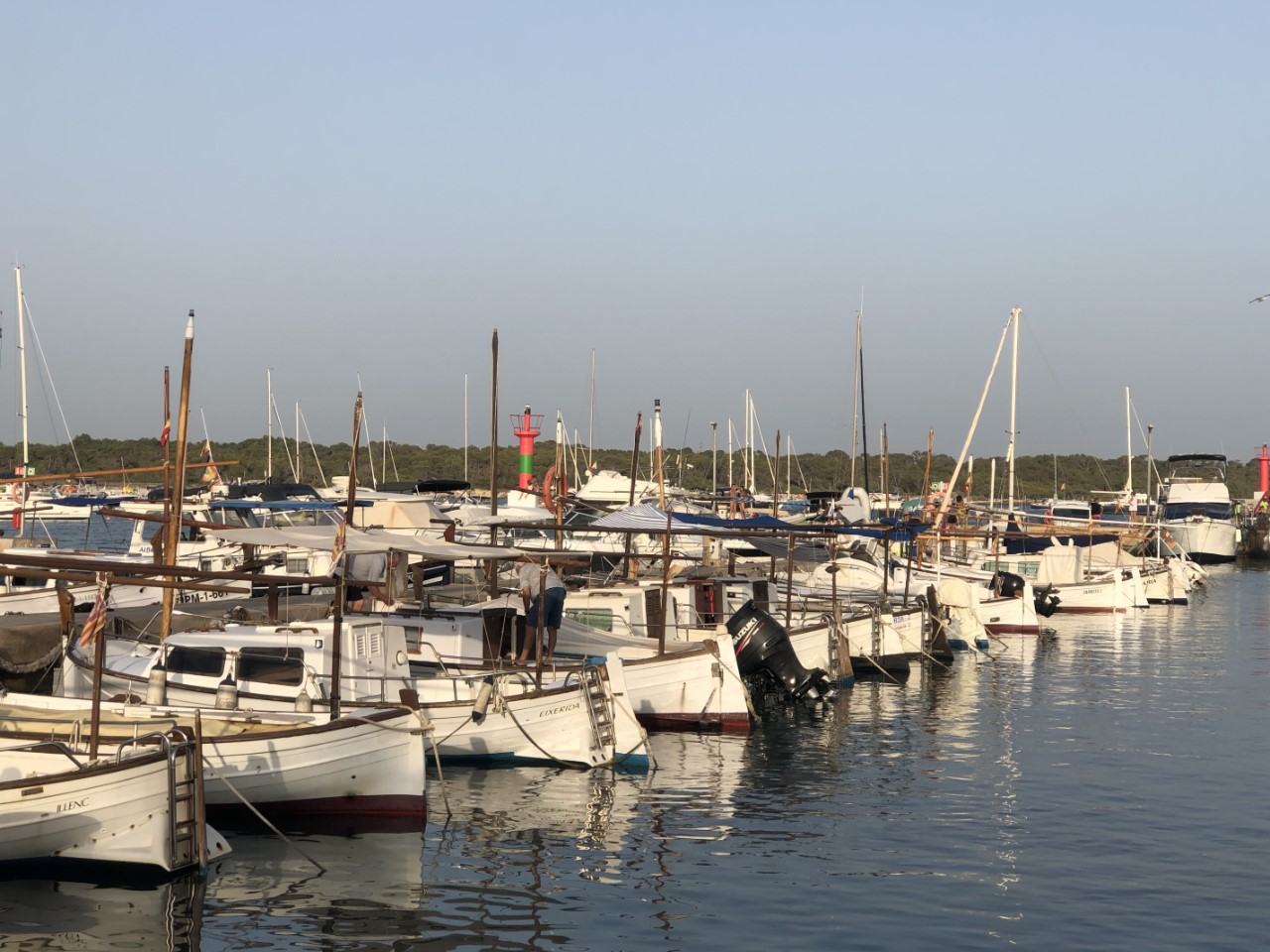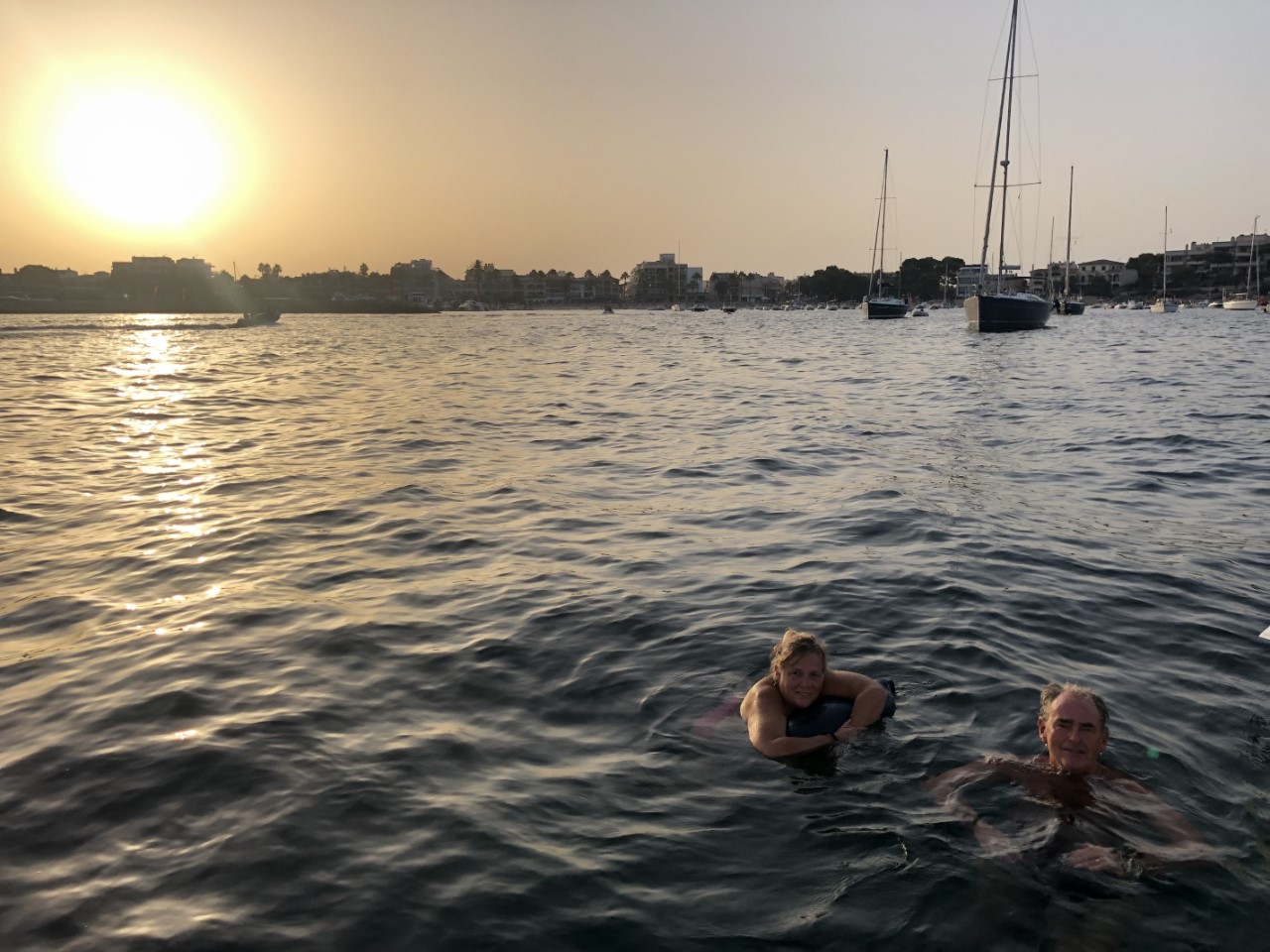 We sturen aan op een ankerplekje bij Illa Gavina, maar daar kunnen we geen boodschappen halen. Dan maar naar San Jordi, daar is een steigertje voor de bijboot en een supermarkt. Er liggen in deze baai veel boten aan een mooring en maar een enkeling ligt voor anker. Wij zoeken een mooi ankerplekje uit in een zandbodem bezaaid met rotsen. Als we ons anker laten zakken in nog geen vijf meter diep helder water en we langzaam achteruit varen, gelijktijdig met het geven van voldoende ketting, liggen we snel als een huis verankerd. Als we een kijkje nemen in het water om te controleren hoe het anker ligt, zijn we verdeeld tevreden. Het anker ligt in het zand deels ingegraven omringd door platte rotsen. We vertrouwen er op, dat het goed genoeg is.