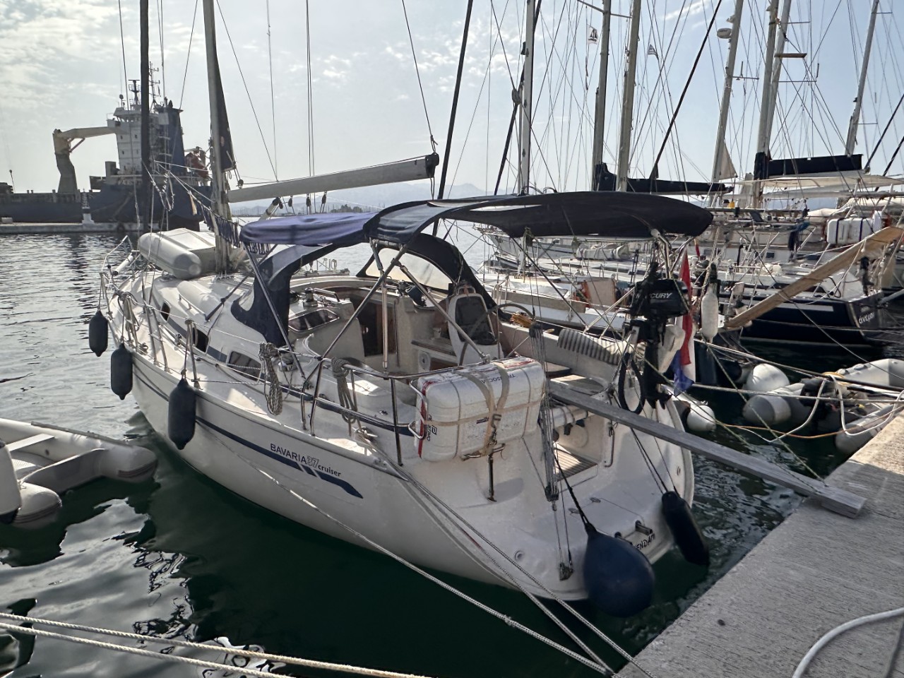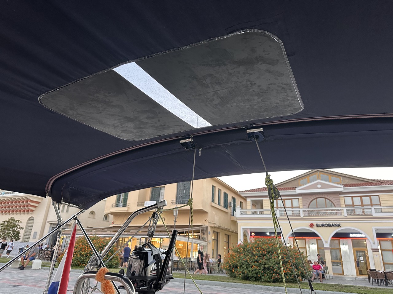 De buitenkant hebben we schoongespoten en de watertanks gevuld. We zochten nog steeds iets van plakfolie voor ons verloren zonnescherm-bimini-lapje, die in de storm verloren is gegaan. Ik vind al vrij snel een doe-het-zelf zaakje in de hoofdstraat. Die heeft de plakfolie die ik nodig heb. Terug op de Just hebben we met uiterste precisie de folie geplakt en we zijn zeer tevreden over het resultaat.