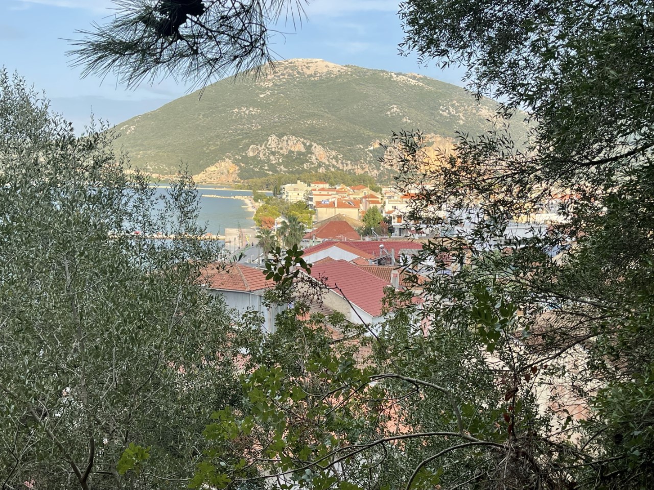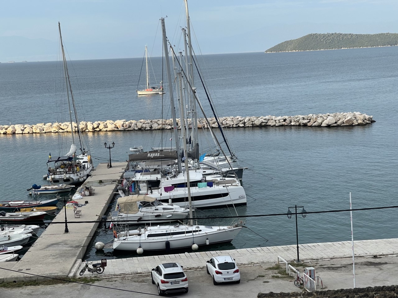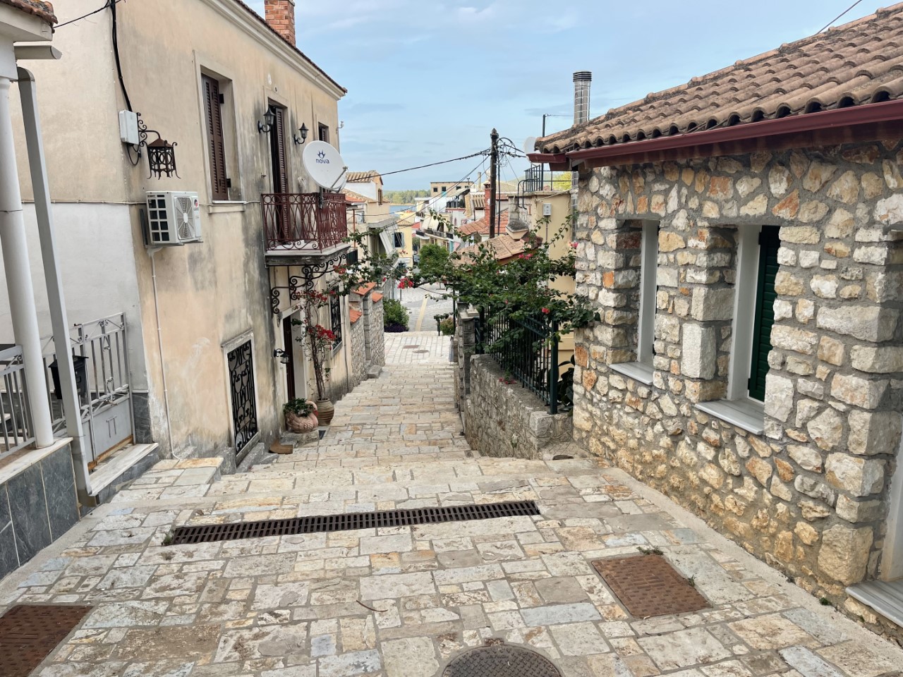 Dan gaan we maar wandelen langs de restaurantjes op de kade. Echt heel ver is dat niet. We werpen een blik op de menukaarten en krijgen zelfs een kijkje in de keuken. Dat trok ons niet echt over de streep. We kiezen toch maar een restaurantje vlakbij de Just, waar we heerlijk hebben gegeten. Het restaurantje ligt ook aan de kade en er komt nog even een grote schildpad buurten. Ook de poezen van Vonitsas komen wat mee-eten.