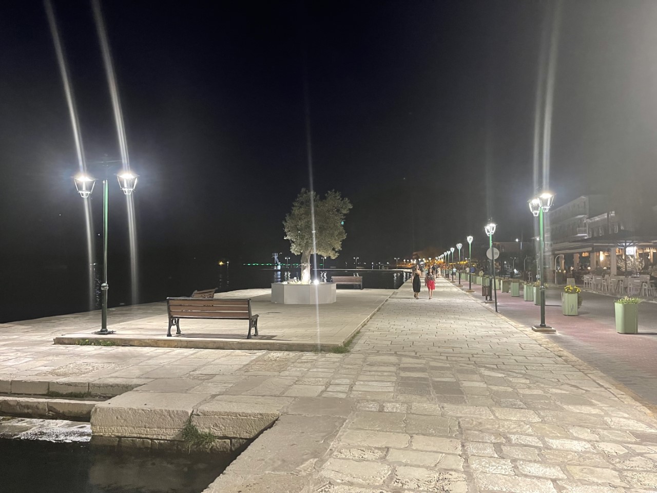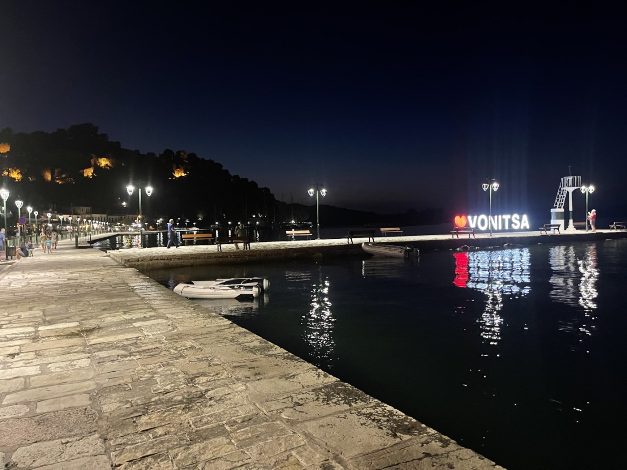 Na afloop wandelen we voor de spijsvertering nog langs de gezellig verlichte boulevard met het Vonitsa logo en dan gaan we terug naar de Just.