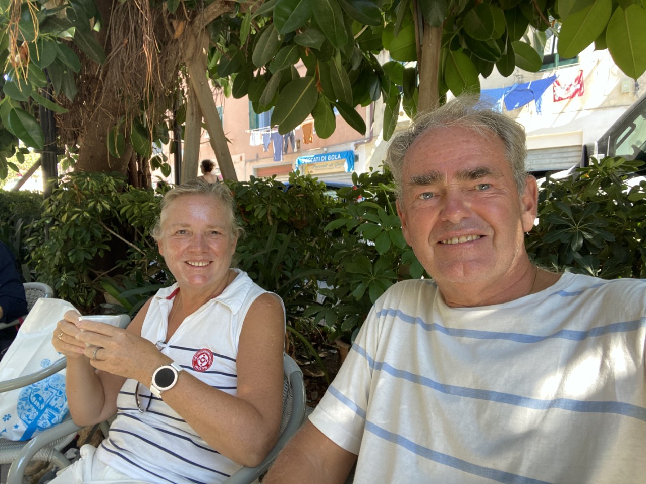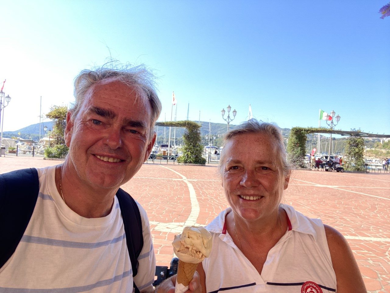 We vinden het gelijk al een gezellig en schoon stadje, beter dan de plaatsen waar we waren in Sardinië en Corsica. We hebben nog geen meter gelopen of we zien al de eerste Gelateria. Helaas gesloten, maar twee huizen verder is al de volgende. Marianne vindt het aan de vroege kant, iets voor 10:00 uur, maar het ijsje smaakte mij heerlijk.