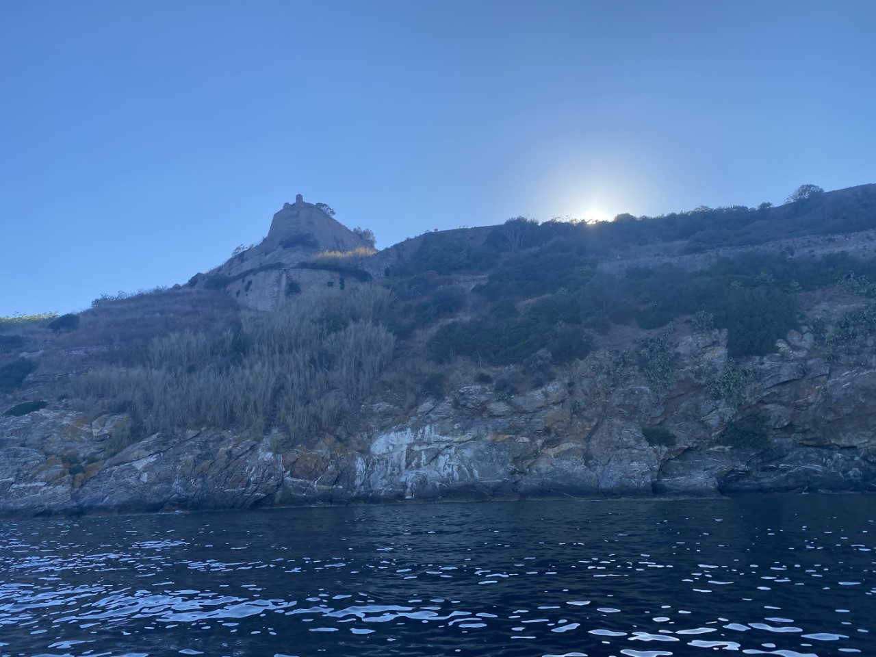 Vanmorgen zijn we helemaal gereed om naar Porto Azzurro te varen met het bijbootje, als er een zeilboot z’n anker gaat ophalen. Wij vinden dat een nog betere plek, dan waar we nu liggen. We verplaatsen dan ook de Just naar een plekje, pal onder een groot fort hoog op de rots. Zo… we liggen, driemaal is scheepsrecht, zeggen ze.