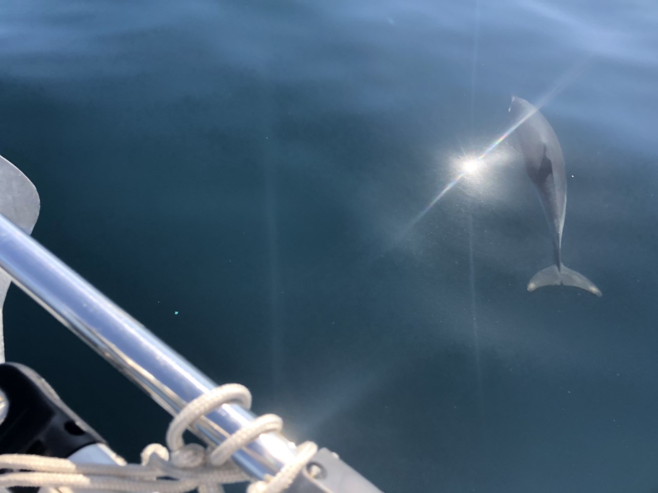 Dus iets later dan de bedoeling gooiden we de landvasten los. De tocht was zoals laatste tijd windstil, motor aan, windje steekt op, grootzeil bij, fokje bij, windstil, fokje in en grootzeil in. Het houd je wel bezig op zo’n tochtje. Tweemaal kwamen heel even dolfijnen rond de Just spelen, maar het ging wat te langzaam voor ze en ze gingen hun eigen weg.