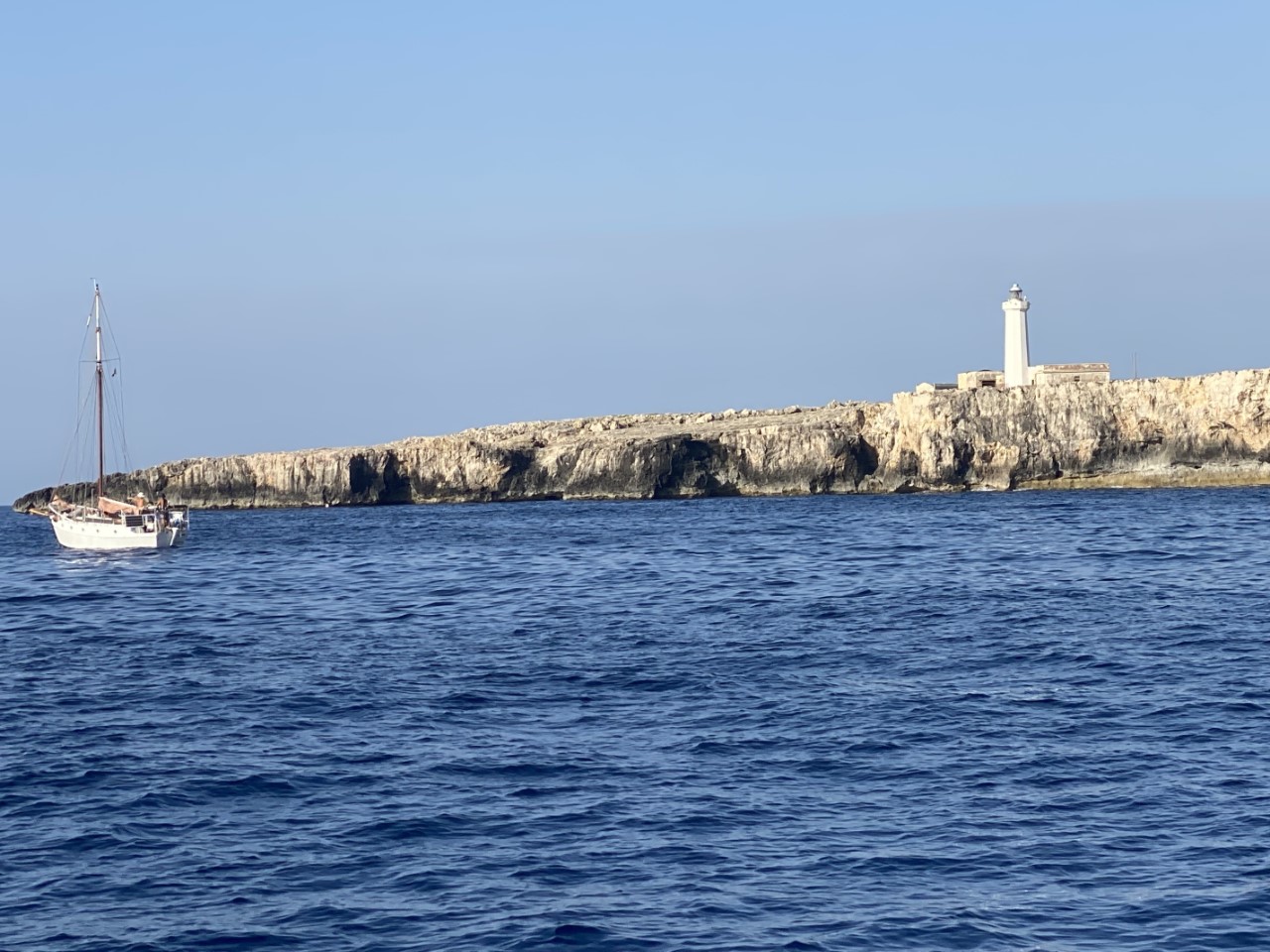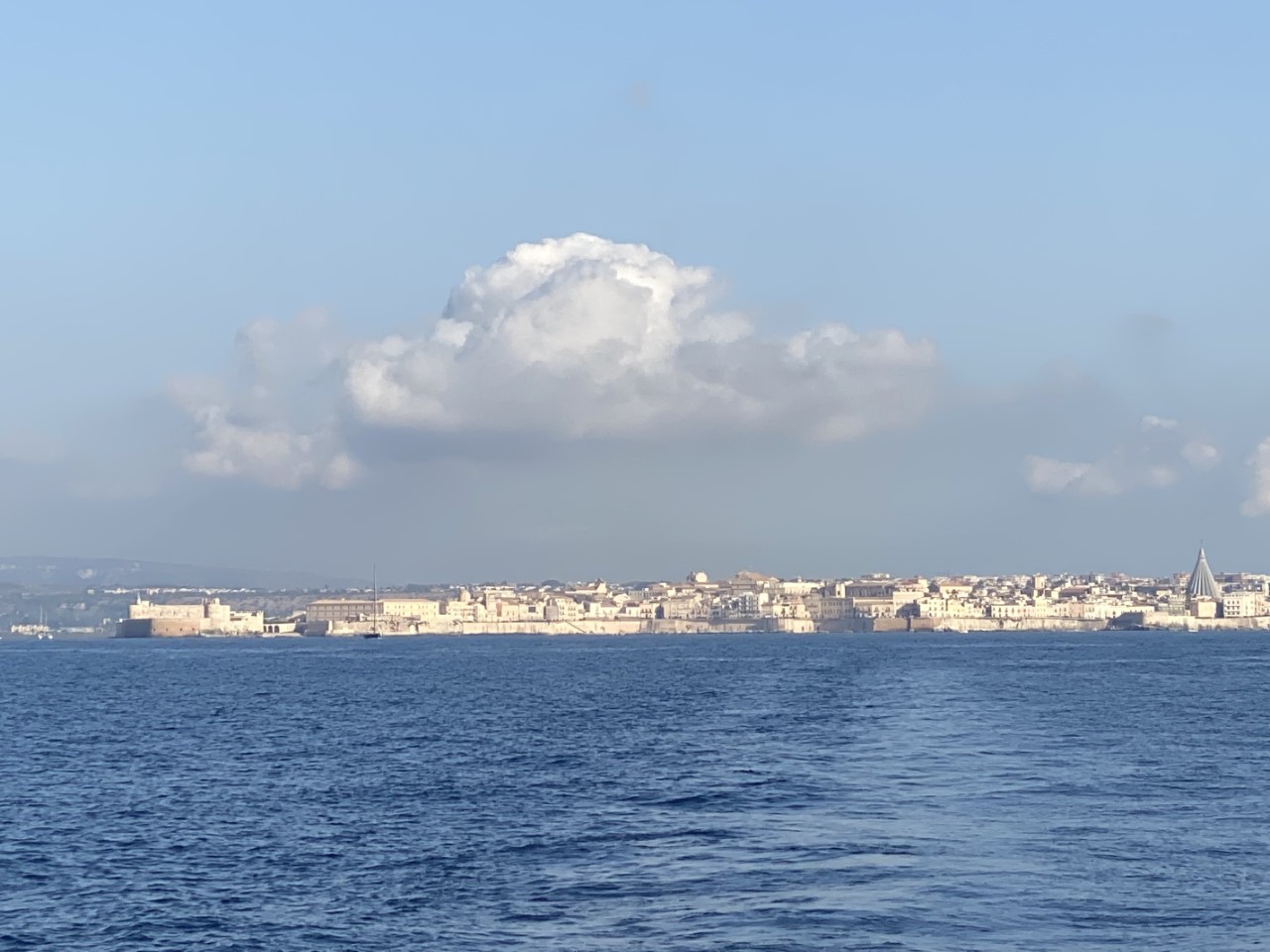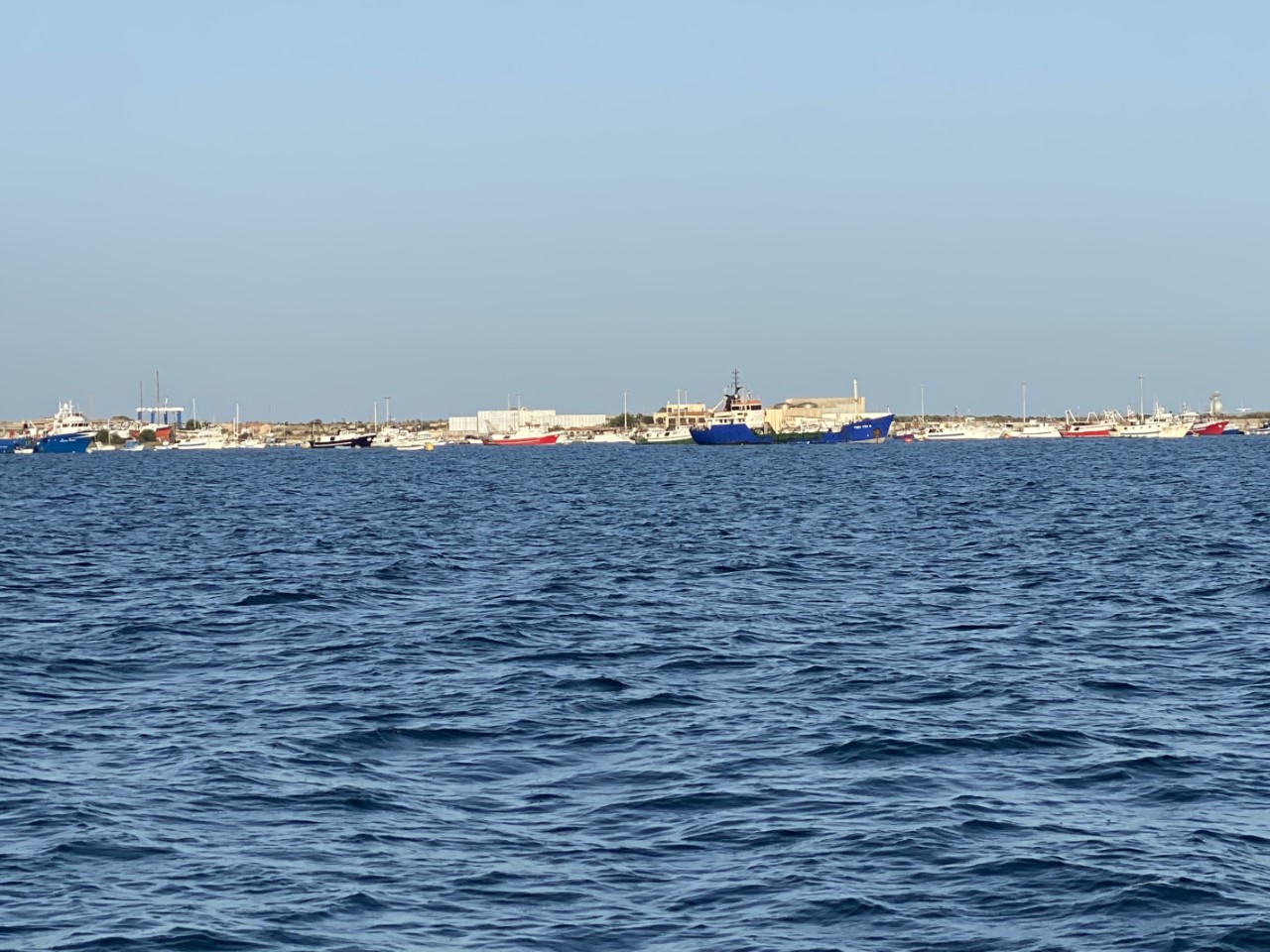 We zetten onze koers naar ons laatste ankerplekje voor dit jaar. We steken weer een diepe, lange baai over met geen wind, dus weer een beetje een saai tochtje. We passeren het kleine eilandje “Capo Passerro” en twijfelen daar een klein beetje om er te ankeren. Op de Navily-app staan wat vreemde berichten, dat de Guardia Costiera je daar weg kan sturen, omdat het gevaarlijk zou zijn. Beetje raar, want we tellen snel een twintigtal andere ankeraars. We hebben ons gehouden aan ons eigen plan en hebben een plekje uitgezocht in de rustige baai van Portopalo. Er liggen veel vissersboten aan moorings aan de oostzijde en aan de westzijde slechts twee andere zeilboten. We hebben ruime keus.