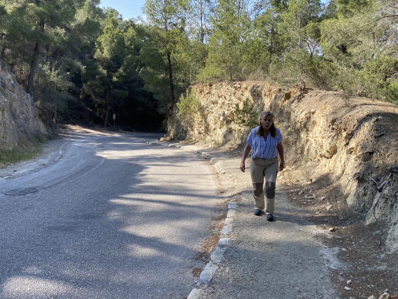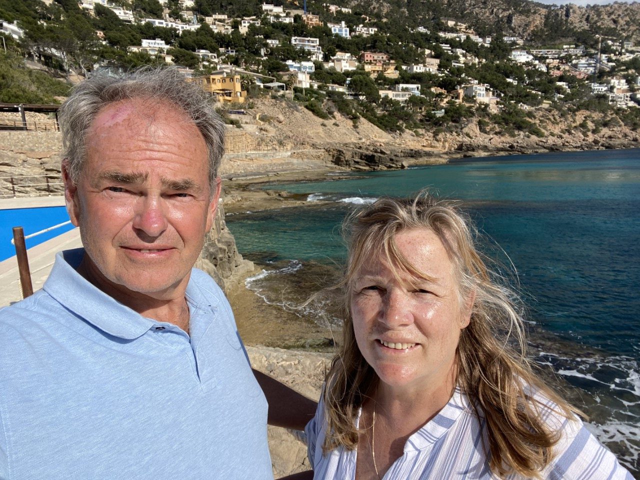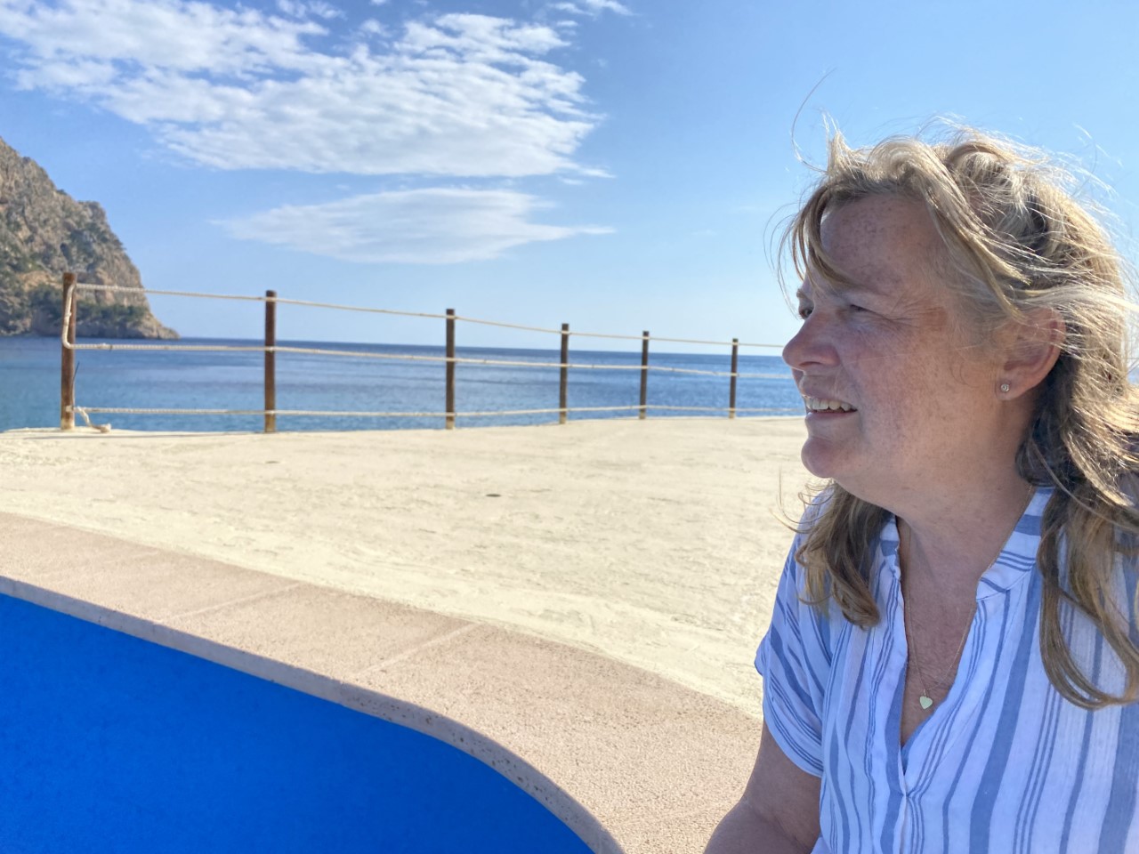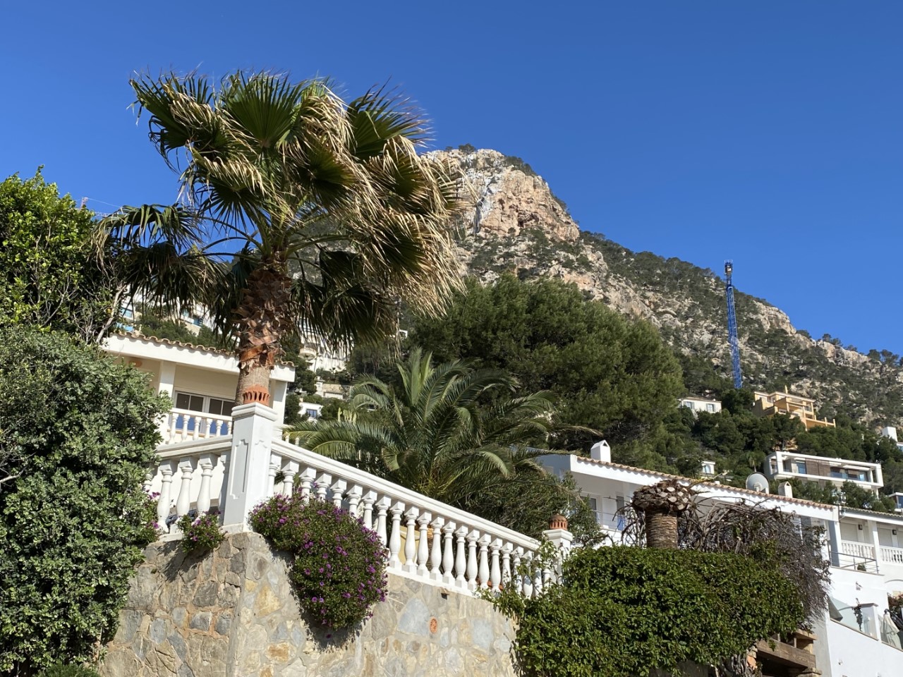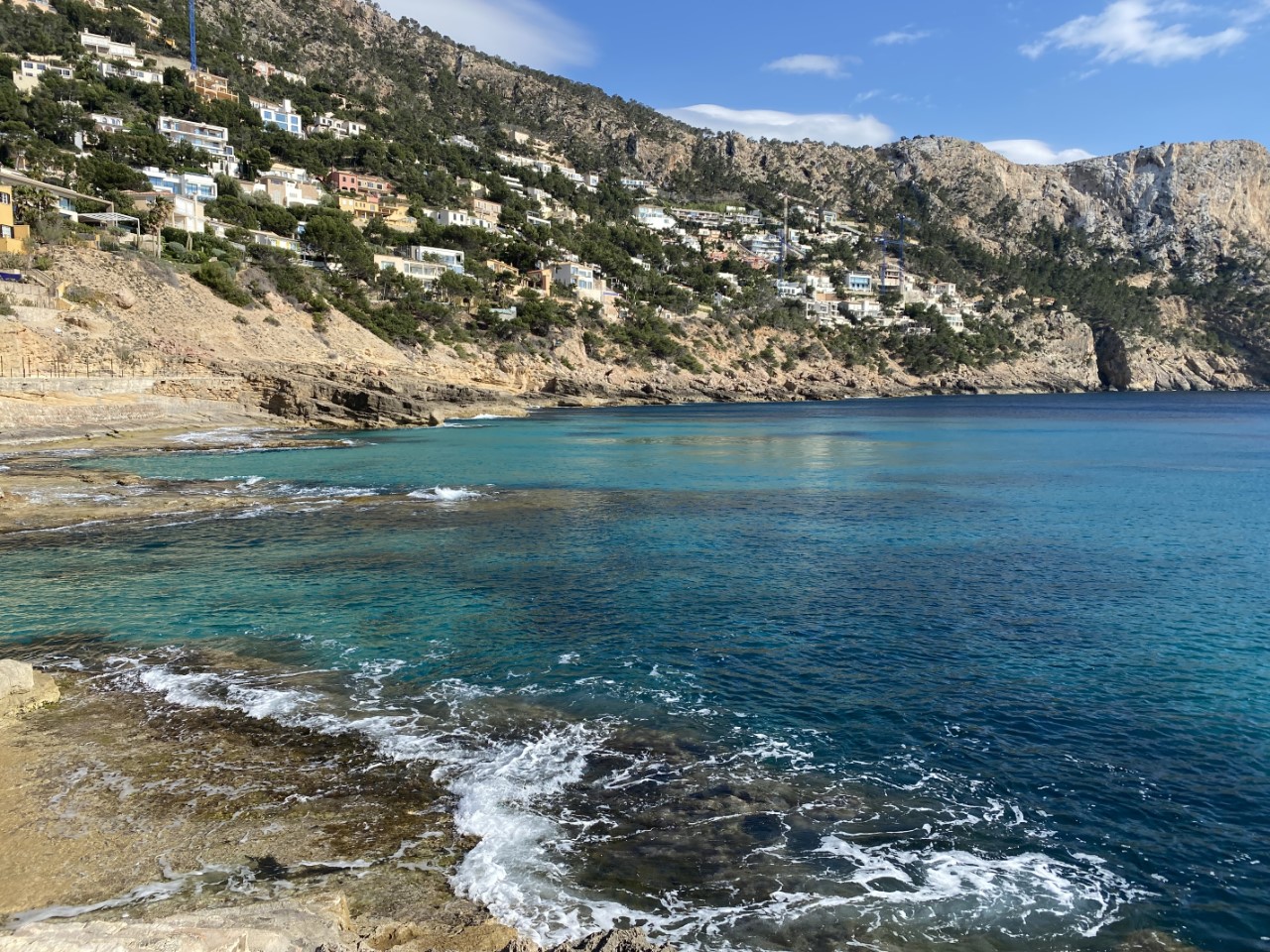 Na een kleine siësta aan boord zijn we dan toch aan de wandeling begonnen. Een stevige klim van 2 km op steile wegen langs grote villa’s. Als we de 100 meter hoogte bereiken, mogen we beginnen aan de afdaling. Bij een verlaten beachclub met leeg zwembad nemen we bij Cala Llamp een kleine picknick in de vorm van een lekker vers gebakken rum-cakeje. We hebben weer extra energie voor de terugweg, die weer 100 meter steil omhoog gaat.