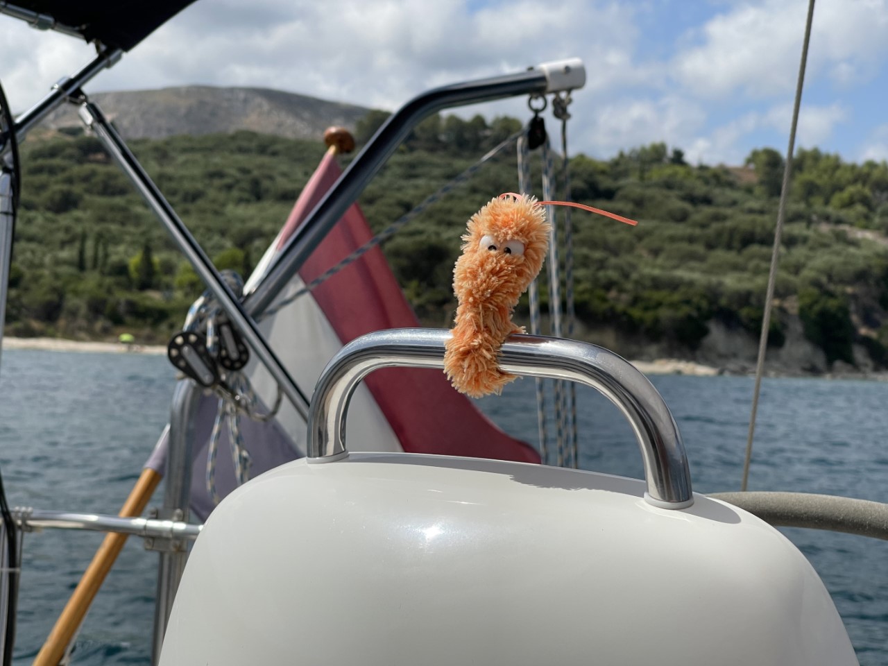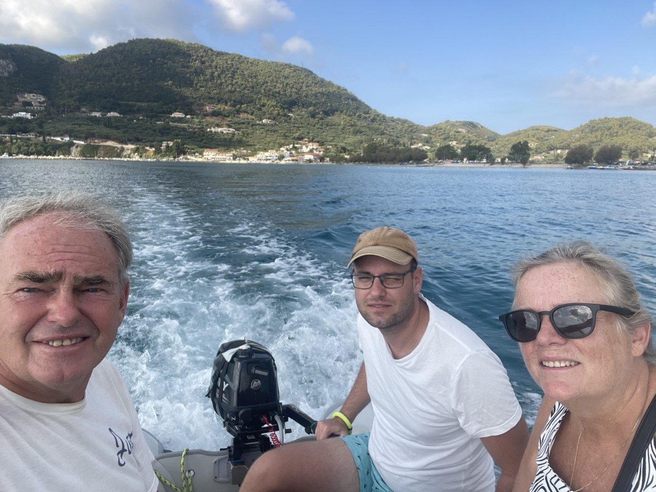 Wij gaan met z’n drietjes op pad en Daniel blijft bij het bijbootje aan de buitenzijde van het haventje, als wij even naar de supermarkt lopen. Zowel de heen- als terugtocht met het bijbootje is op een spiegelgladde zee. Is dit stilte voor de storm?