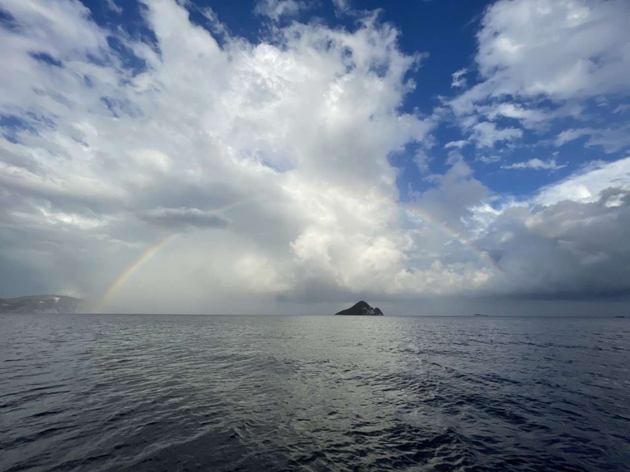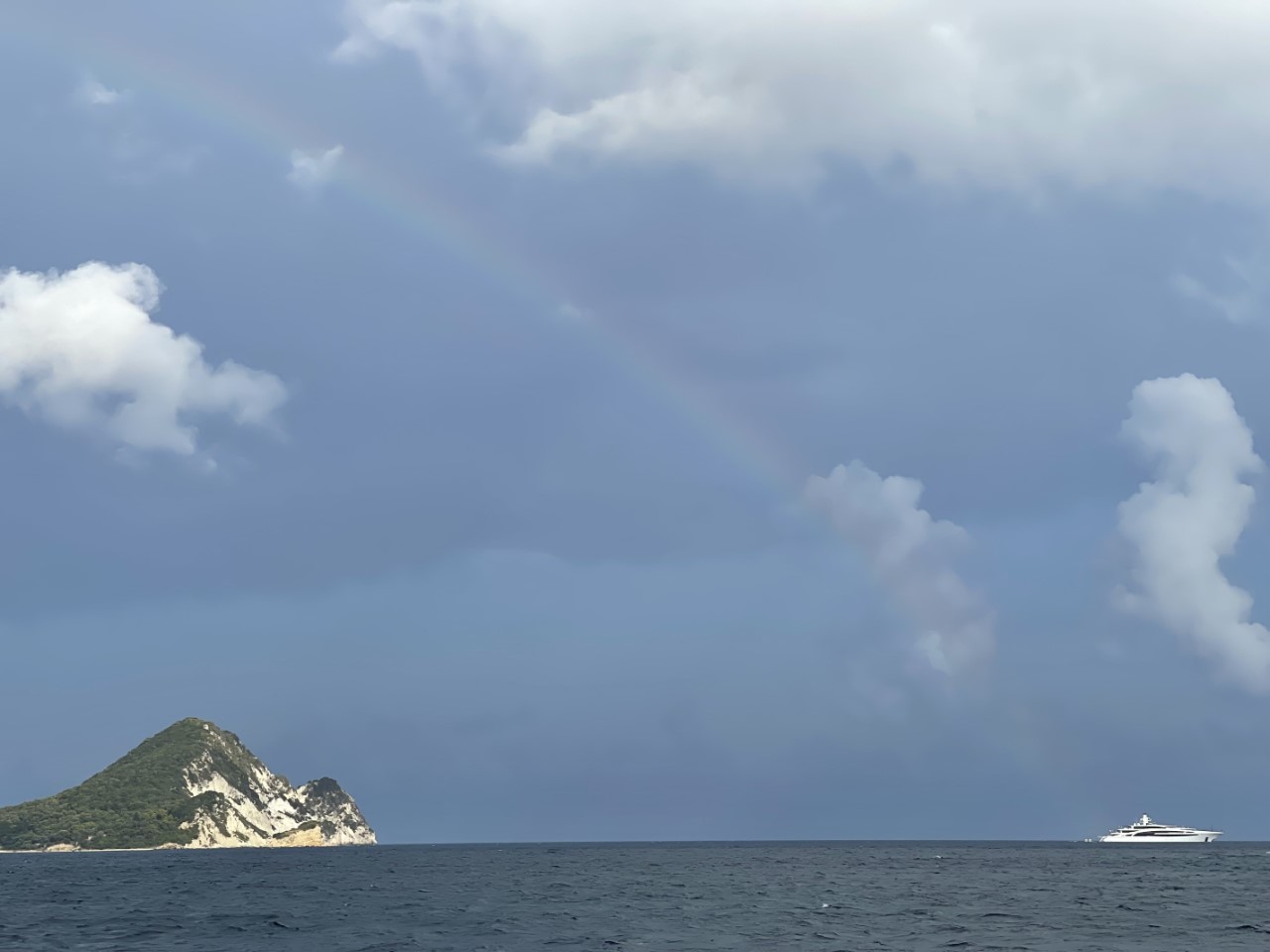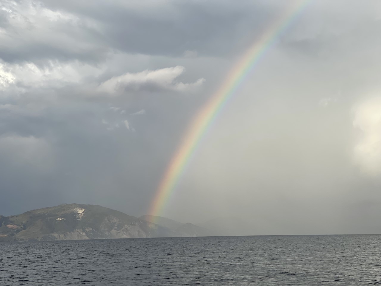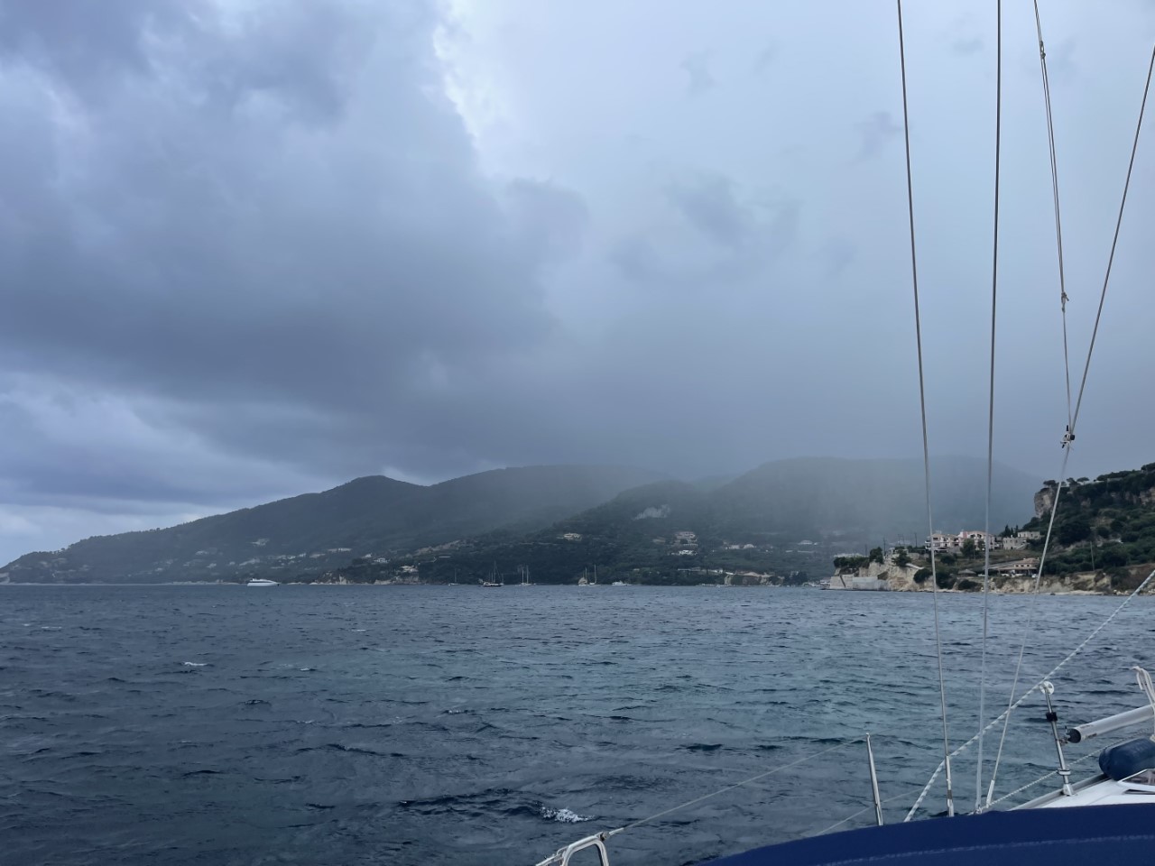 Om 19:30 uur is het gedaan met de storm en is alles alweer rustig. Misschien dat we nog een klein regenbuitje over ons heen krijgen, maar zoals het er nu uitziet vertrekken we morgen richting Zakynthos-stad.