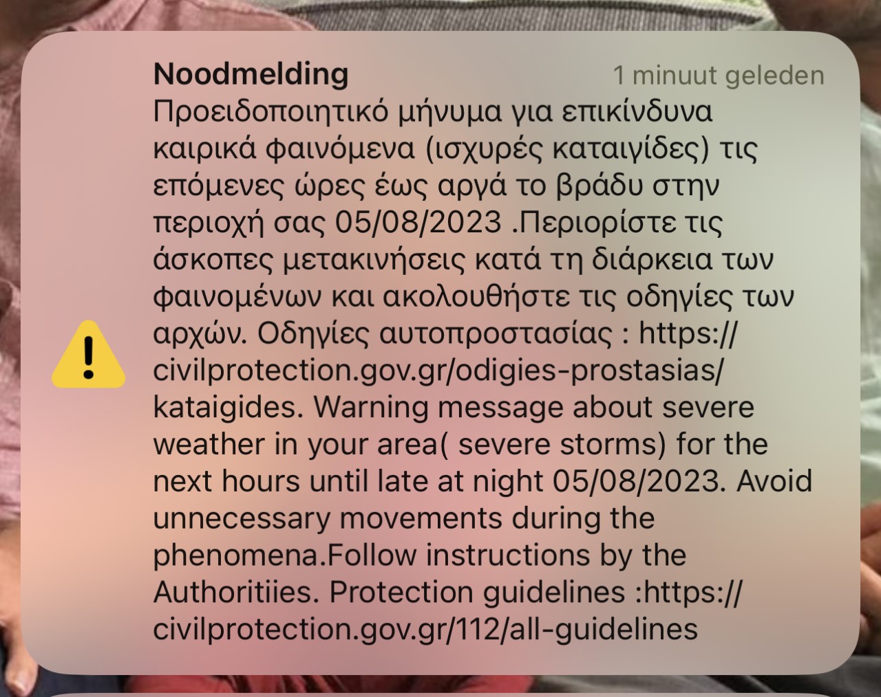 Eindelijk 18:30 uur begint de wind aan te wakkeren en er drijven donkere wolken richting de Just. De voorspelde wind van 35 knopen hebben we niet gehaald. Wel de 30 knopen en even een fikse regenbui van 10 minuten. Voor dit alles kregen we wel van de Griekse Meteo een pushbericht. Dat hadden we nog niet eerder meegemaakt.
