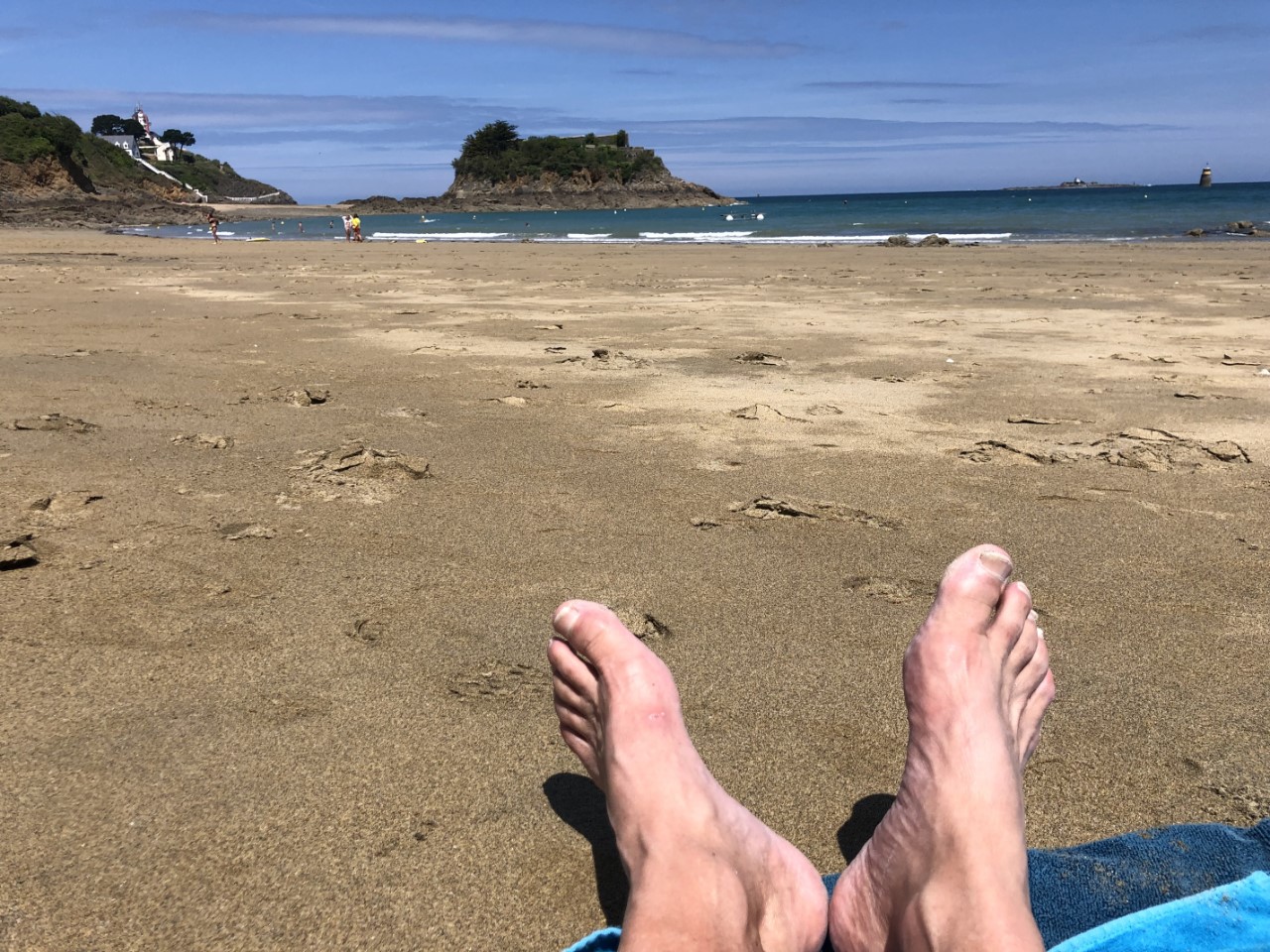 Na een hele luie ochtend heb ik uitgebreid inkopen gedaan bij de Lidl en bij terugkomst gebruncht. En toen kwam de discussie wat doen we morgen tijdens de nationale feestdag van Frankrijk ”Quatorze Juillet” hier blijven of vertrekken? Waar zijn de leukste feestelijkheden? We hebben besloten om naar Paimpol te varen. Reserveren lukte niet (siesta). Dat proberen we dan maar na 14:00 uur. Nu naar het strand. Marianne was zo stoer om gelijk een duik te nemen. Ik was iets kouwelijker en liet m’n tenen badderen. Langzaam werd het hoogwater en we moesten vluchten anders hadden we weggespoeld geworden. Langs de rotsen konden we nog net de kortste route nemen naar de Just en ik moest iets dieper badderen. M’n knieën werden nu ook nat, Brrrrr. Aan boord hebben we eindelijk het havenkantoor van Paimpol kunnen bereiken, zodat we een haventje op kunnen schuiven. Er was plek in de haven en we liggen daar midden in het centrum, wat ons wel gezellig lijkt. Één probleempje, de vertrektijd is 4:00 uur zondagmorgen, om daar aan te komen met voldoende water onder onze kiel. Marianne heb ik een zondags ontbijtje beloofd, zodra we aan zijn gekomen rond 7:30 uur. Wij zetten vandaag onze luie dag voort in de kuip met een glaasje Bretonse Cider en stukjes brie. De Saucisse de Toulouse die we bij ons avondmaaltje hadden, was niet meer dan een braadworst met een dure naam. Maar met een lekkere Frans broodje en Oignons smaakte het best. Nu nog wat spulletje klaar leggen voor ons vroege vertrek en dan snel naar bed.