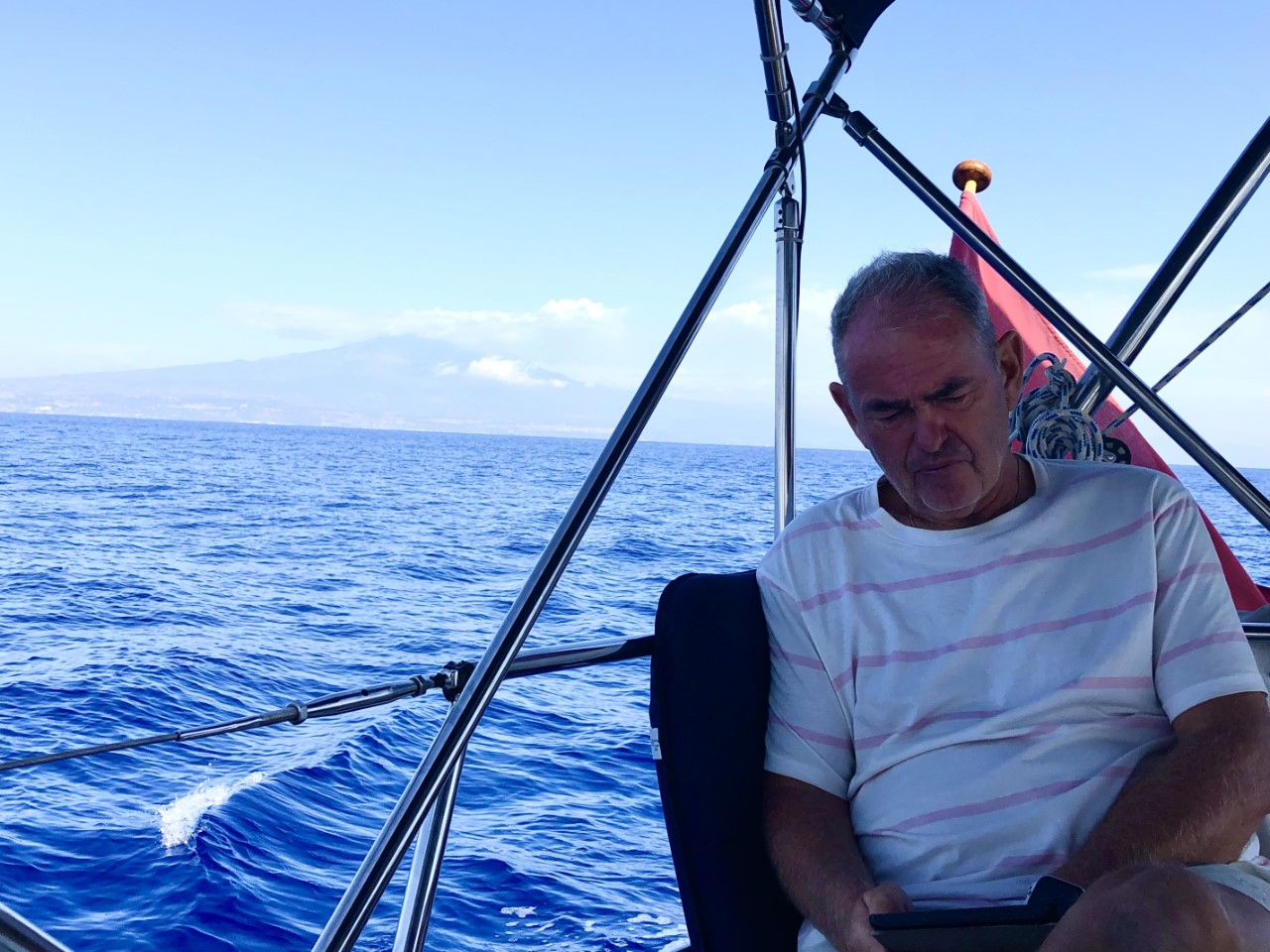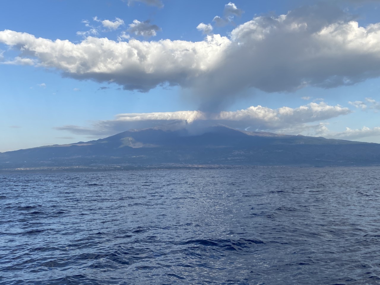 We hoeven geen rekening te houden met stroming en we moeten vandaag bijna 50 mijl, dus haal ik het anker vroeg op in een nog slapend ankerveld. Het enige spannende op deze tocht is het passeren van de Etna, die ook nog in diepe slaap is, gelukkig. De rest van het tochtje is alweer saai, te weinig wind om te zeilen, het grootzeil staat wel bij voor de stabiliteit.