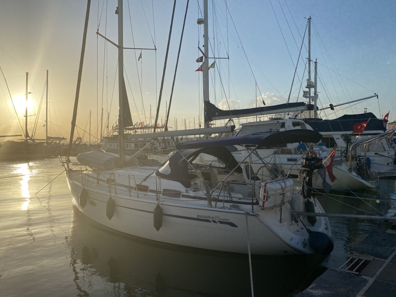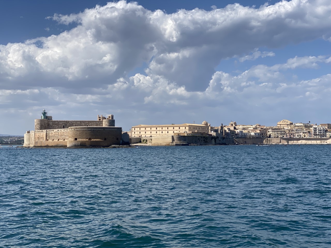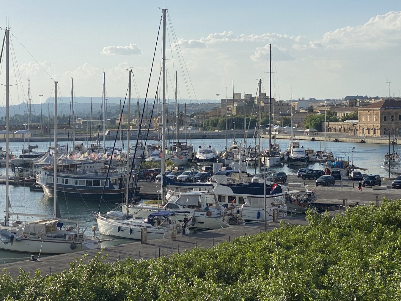 Bij aankomst in de baai van Siracusa moet je je aanmelden en toestemming vragen om te ankeren. Marianne doet dat dan ook netjes, alleen worden we verwezen naar de publieke kade. Beetje onduidelijk waar dat is, maar we gaan het maar proberen. Op de vraag is het gratis, krijgen we als antwoord “Si”. We krijgen een plaatsje toegewezen tussen 2 en 3. De lange kade voorafgaand aan de jachthaven zien wij aan voor de publieke kade. Wij er langzaam op achteruit varen, krijgen we van de buren te horen, dat we het anker moeten gebruiken als mooringlijn. Dat is nieuw voor ons. Met wat instructies van de inmiddels helpende Nederlandse en Turkse buren hebben we het anker op de juiste plaats gedropt en zijn we langzaam achteruitgevaren. Het is even wennen, maar volgend jaar in Griekenland is dat de manier om aan te leggen. We hebben nu een kleine workshop gehad met weinig wind.