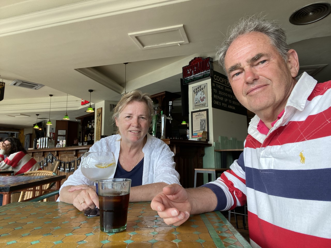 In de vooravond gingen we nogmaals langs de bar om ergens een cocktail te scoren, bij Mambo en Cafe del Mar. Maar daar stond de wind op het terras en de paar mensen, die er zaten hadden winterjassen aan. Dan maar een andere bar zoeken. Al wandelend zijn we beland bij een Engelse Pub. Na de lijst met cocktails te hebben bekeken, kiezen we toch maar voor een Gin Tonic en een Rum Cola. Heel licht aangeschoten hebben we nog wat geflaneerd over de boulevard.