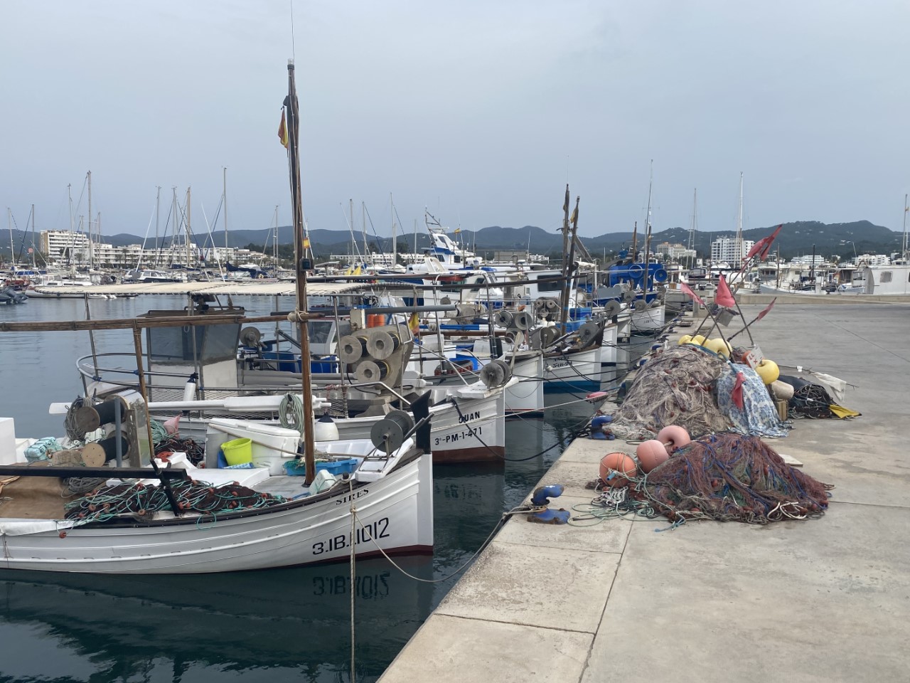De voorspellingen zijn weer wisselvallig, zoals de hele maand april. Er is weer veel wind in het vooruitzicht voor vannacht en morgen, dus besluiten we maar om lekker in de haven te blijven. In de ochtend maken we een lange wandeling en we zitten even bij een lokaal koffietentje. Vlakbij is de Mercadona supermarkt en omdat er gisteren bij de Lidl geen bak aardbeien te koop was, gaan we even kijken of die er misschien hier wel is. Ja hoor, een heel kilo voor maar € 2,49. Met nog wat boodschapjes lopen we terug langs de andere boulevard, waar de grote Ibiza clubs zijn, zoals Mambo en Café del Mar. Maar ook die zijn nog gesloten. We verbazen ons toch over hoeveel bars en restaurants gesloten zijn of verbouwd worden.