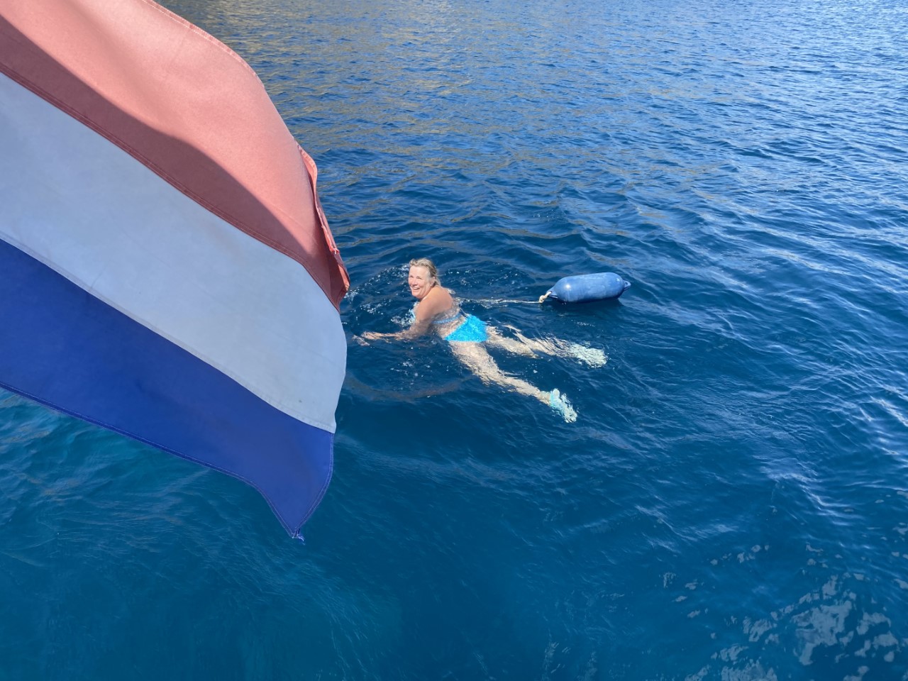 Wij gaan in de relaxstand, Marianne gaat wat schilderen en ik lees een boekje. In de namiddag moet het er toch van komen, we zijn flink opgewarmd en het water lonkt aantrekkelijk. Marianne neemt de eerste duik, brrrrr, een stuk frisser dan vorig jaar. Marianne heeft als doel het strandje. Ik heb een plamuurmes aan een lange stok gebonden en ga daarmee de kokkels op het onderwaterschip te lijf. De vissen waren er blij mee. Bijna 2 uur later zijn we allebei tevreden met onze bereikte doelen. Marianne naar het strandje en ik met een bijna kokkelloze romp. We zijn wel flink afgekoeld, maar achter het buiskapje en de zon zijn we snel weer op temperatuur.