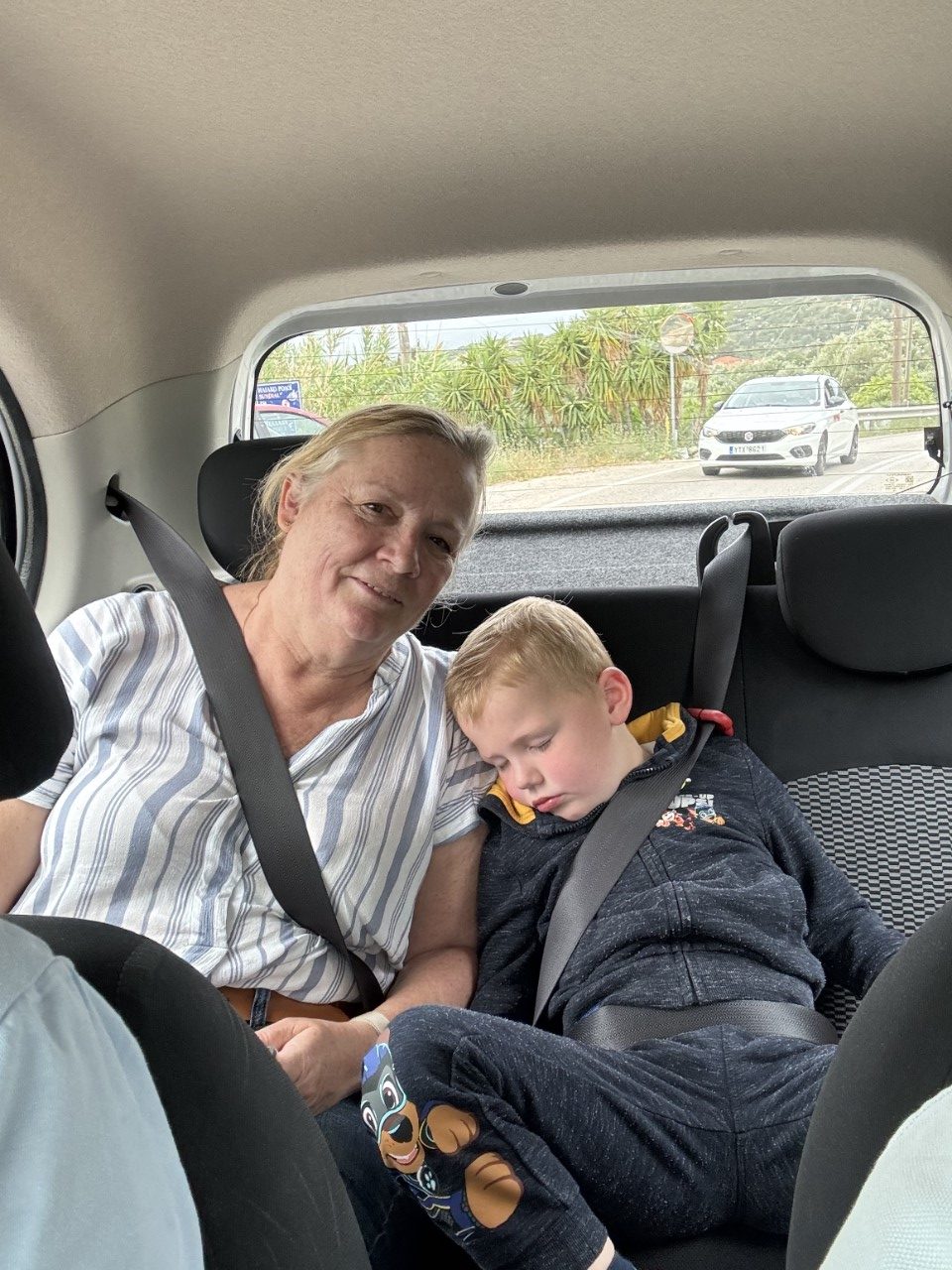 Wat een avond en nacht, tot ruim middernacht was het een wasmachine aan boord van de Just. We zijn blij, dat we vanmorgen in onze huurauto kunnen stappen. De Just laten we achter aan de kade in een nog steeds golvende havenkom. De autorit is mooi, hoog door de bergen met veel vergezichten. We vinden het veel fijner en veiliger rijden dan in Sicilië. Als we vlakbij Argostoli zijn, zoeken we de Lidl op en vullen een volle boodschappenkar. We laden de kleine achterbak van ons kleine huurautootje vol. Zo… Dat is klaar. Nu via een kronkelweg naar het vliegveld van Kefalonia, waar we aankomen als Mark net is geland. Het parkeerterreintje is vol, zodat ik dubbel geparkeerd in de auto blijf wachten.