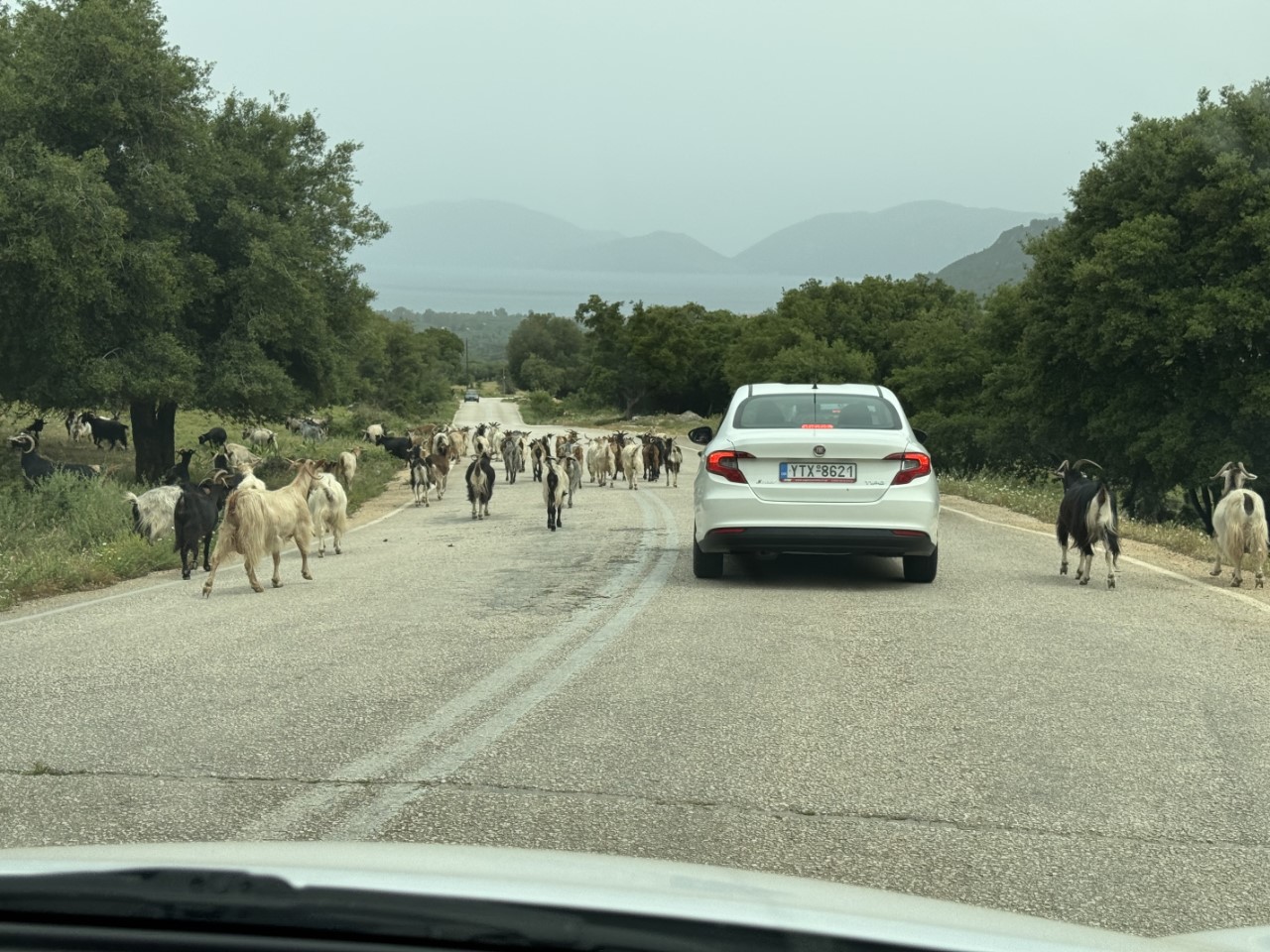 Marianne gaat de aankomsthal in om Mark tegemoet te lopen en krijgt daar de leukste verrassing. Dezelfde die ik op de parkeerplaats kreeg. Niet alleen Mark is geland, maar ook Marnix! We zijn blij verrast, dat Marnix ook een weekje mee gaat varen met ons. De terugweg naar Agia Euphimia is net zo mooi. Eerst door het drukke Argostoli, waar heel weinig zeilboten aan de kade liggen (de voorspelde golfhoogte was daar gisteren twee meter). We rijden door de bergen en een kudde geiten, via Sami, waar de havenkom er heel vredig uitziet, terug naar onze haven in Euphimia. De golven stromen nog steeds binnen. Mark vindt het maar niks om via ons loopplankje op een hobbelende Just te stappen. We besluiten om snel te vertrekken naar Sami, waar het er zo vredig uitziet.