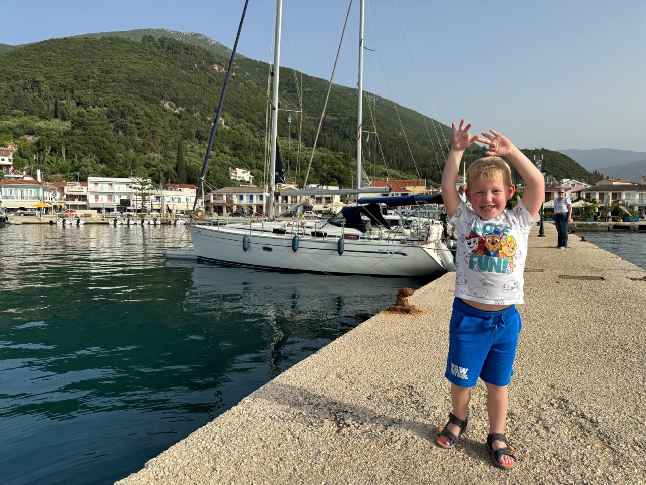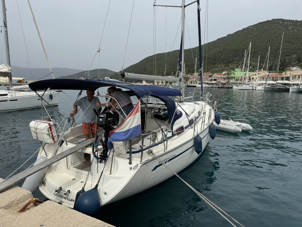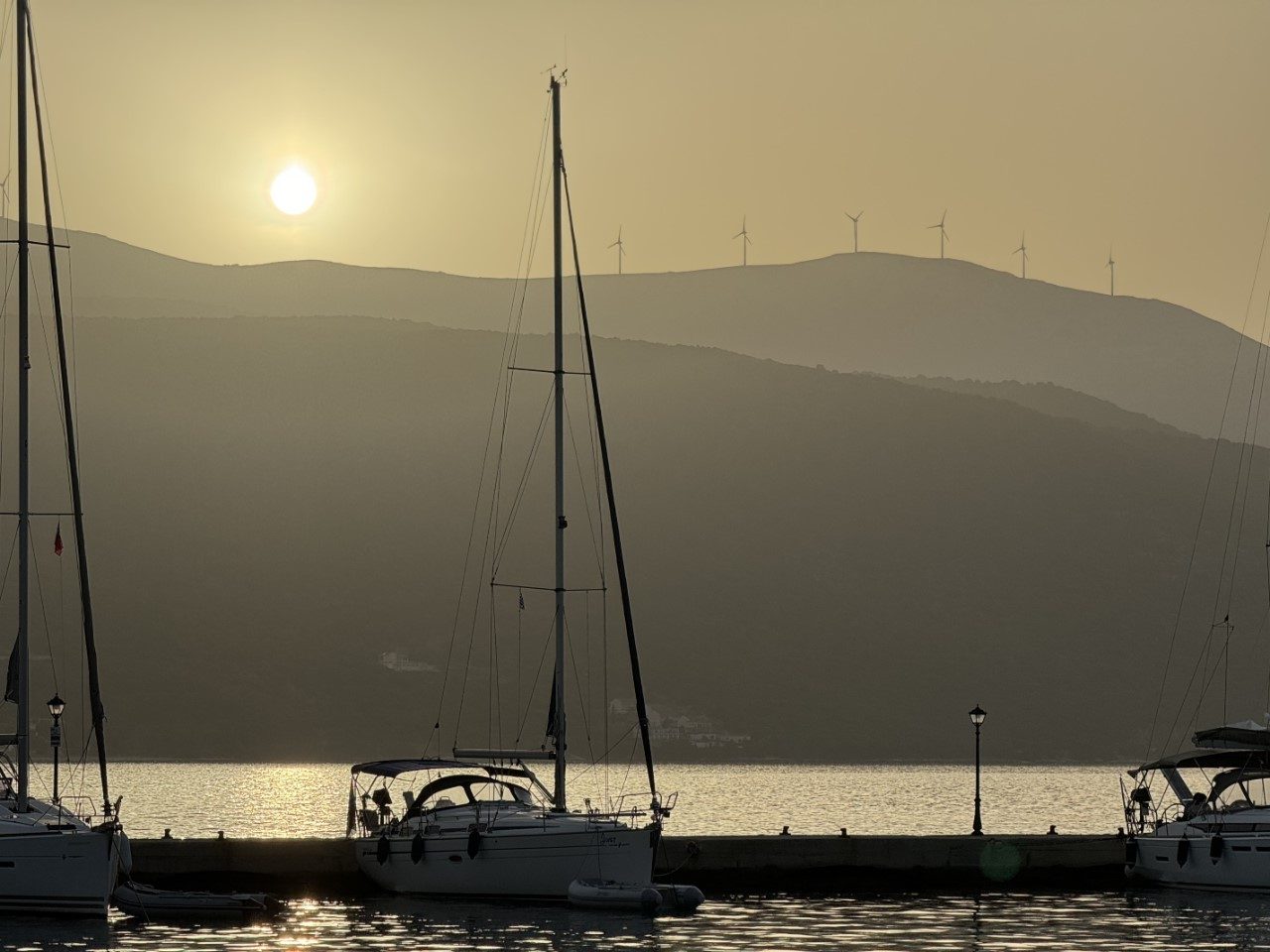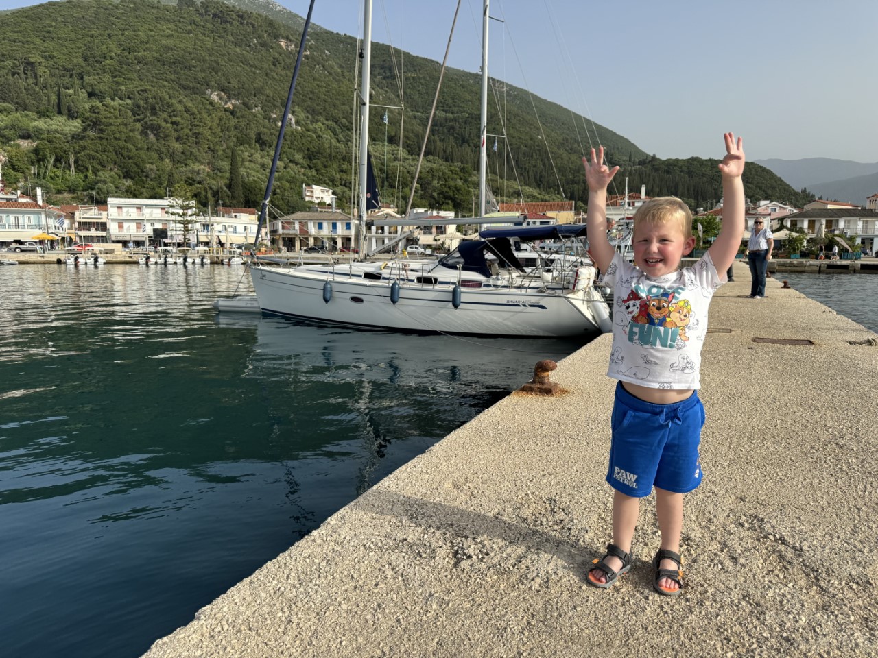 Het 4 mijls-tochtje naar Sami valt best tegen. Er zijn hoge golven en ruim 30 knopen wind op de kop. We maken ons al zorgen, dat het in Sami niet veel beter zal zijn. Gelukkig valt het mee. Er zijn geen golven en een beetje wind. Voor Mark is het de eerste keer aanleggen op z’n Middellandse zee’s met ons anker 40 meter voor de Just en lijnen achter naar de kade. Voor de eerste keer gaat het best goed. We maken gelijk een wandelingetje langs de haven en winkeltjes om weer te eindigen op de Just voor een rustmomentje.