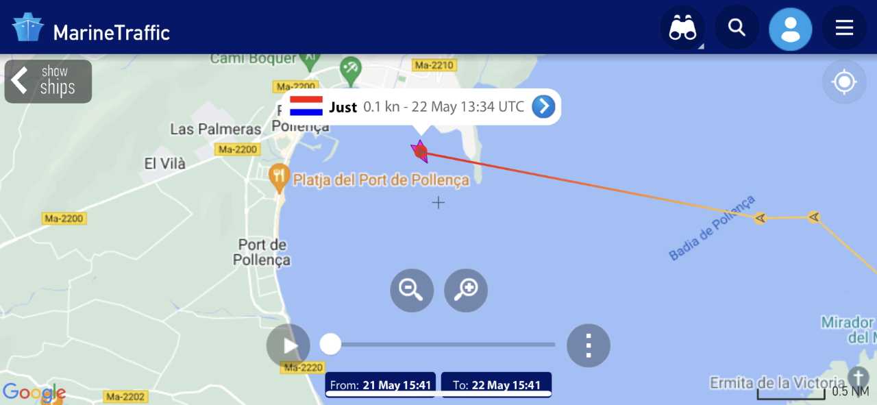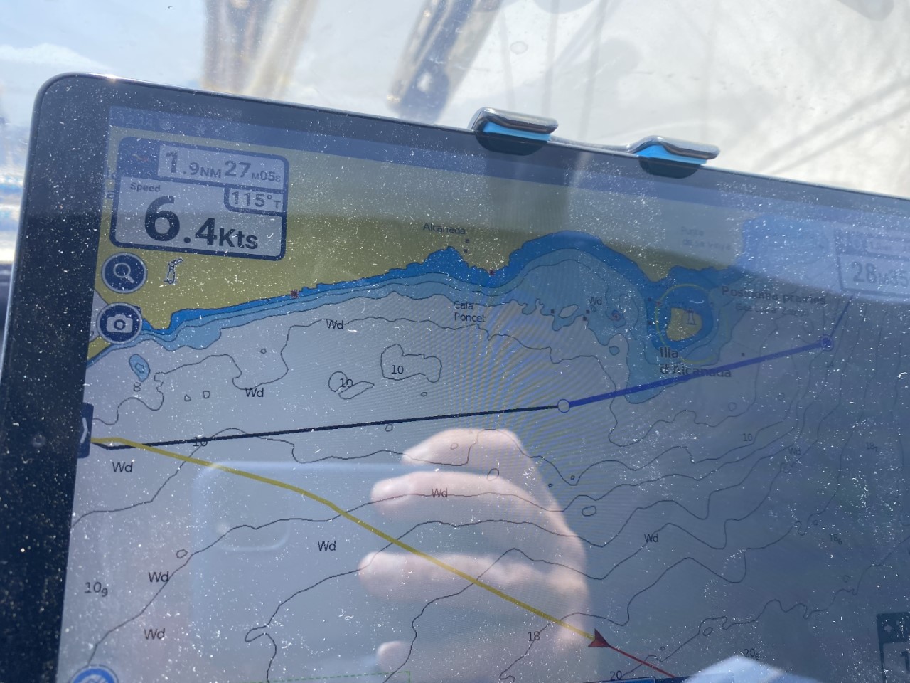 We belanden nog in een zeilwedstrijd, maar met wat bijsturen zijn we daarin geen spelbreker. We dachten iets meer richting Pollensa voor anker te zijn gegaan, maar op de track van het navigatieprogramma liggen we bijna op precies dezelfde ankerspot.