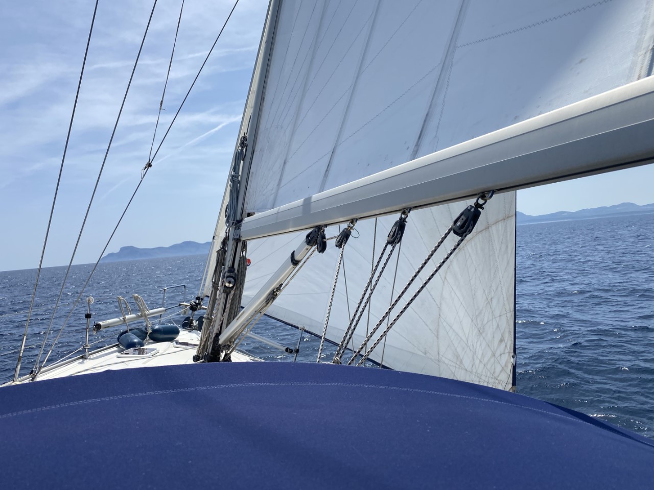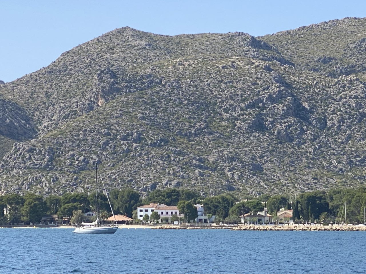 Maar we moeten verder. Even voor 12 uur varen we de havenkom uit. Direct kunnen de zeilen uitgerold en met een ruime 6 knopen gaan we de verkeerde kant op, maar dat noemen ze laveren. Alleen het stukje langs de Cap de Menorca en Cap de Pinar is niet bezeild of we hebben er geen zin in om al te lange slagen te maken. Dat stukje doen we op de motor. Mede omdat de wind daar van allerlei richtingen komt door de Caps die we moeten ronden. Eenmaal in de Badia de Pollensa rollen we het fokje uit en gaan we voor de wind naar ons ankerplekje.