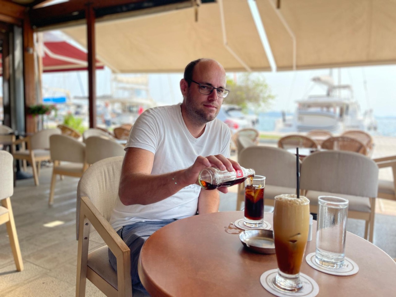 We zijn met de taxi snel bij de Just, die meer bruin is, dan het stralend wit, dat we achterlieten. Marianne en Daniel gaan met het haven-shuttelbusje naar Preveza voor wat proviand. Ik ga ondertussen met veel water en een borstel aan de gang om de Just weer wit te krijgen. Als Marianne en Daniel terug komen is het meeste werk op de Just gedaan op een paar kleine klusjes na.