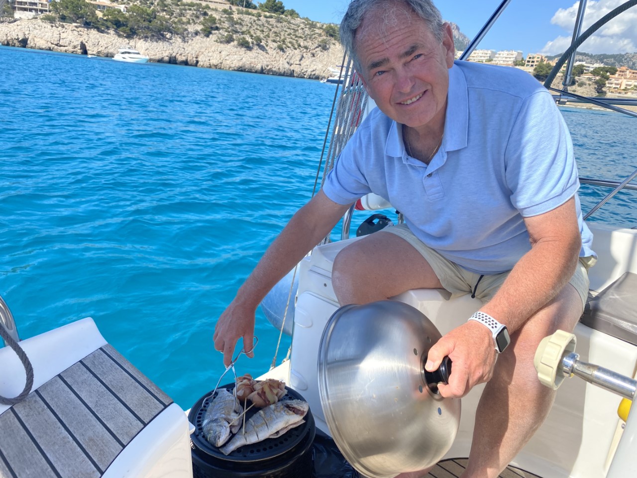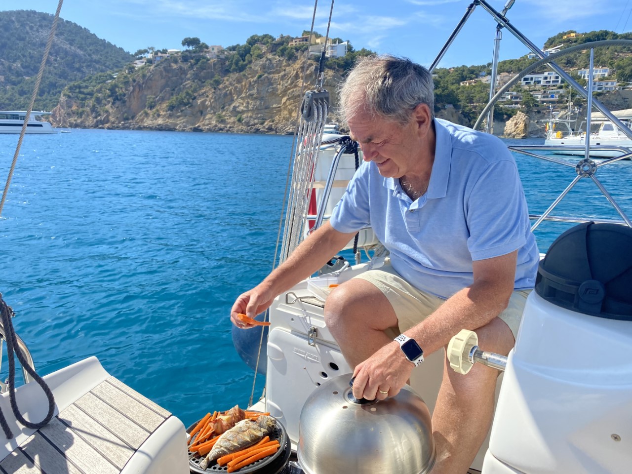 Na een stuk overheerlijke rumcake is het tijd voor een klein dutje. We hadden toch een hele tocht gemaakt van ruim een uur. Tegen de avond begint Marianne met het avondmaaltje. Ik haal de Cobb tevoorschijn voor de Dorade met aardappel-spekspiesjes en voor een beetje gezondheid gaan er ook wat worteltjes op de Cobb.