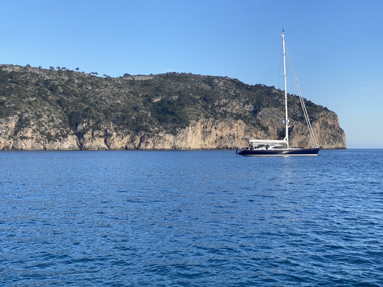Om de steiger te verlaten hebben we even de motor aangehad en voor de rest van de tocht hebben we het fokje uitgedraaid. Met het windje in de rug dobberen we langs de mooie rotswanden naar Cala del Camp. Er staat veel meer wind dan dat we hadden verwacht. Maar dichter bij de kust worden de golfjes minder en daar vinden we een mooi ankerplekje.