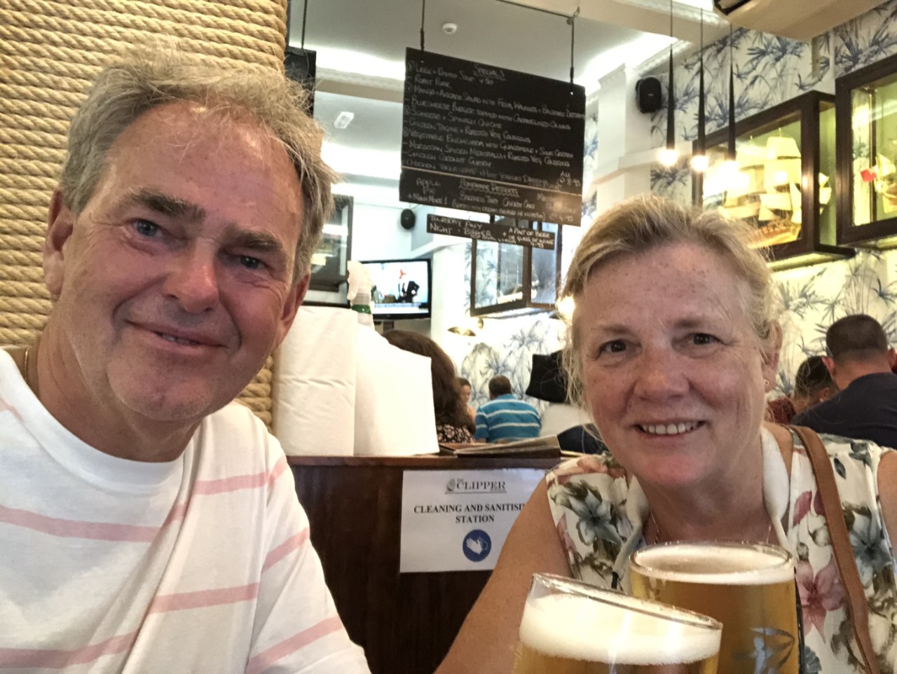 Na wat boodschappen hebben we ook maar siësta gehouden. Bij de supermarkt hebben we een kilo grote langoustines gekocht, waar we een lekkere pastamaaltijd van gemaakt hebben. We hadden op Nederlandse tijd gegeten en gingen nog even naar Engeland. Eerst langs de grenscontrole en dan over de landings-/startbaan op zoek naar een Engelse Pub voor een pint bier. Nog nuchter kwamen we aan op de Just en zijn in de relaxstand gegaan.
