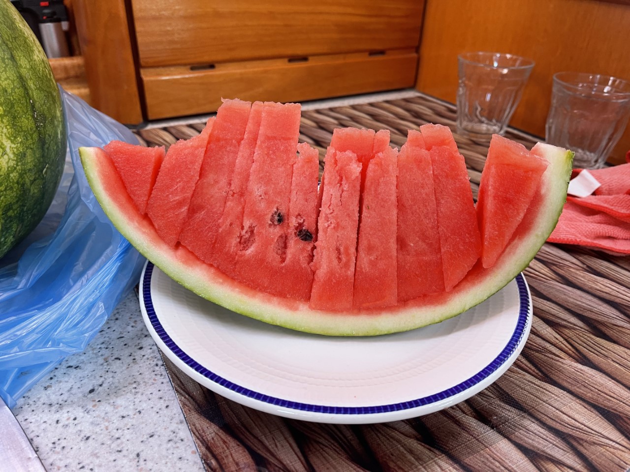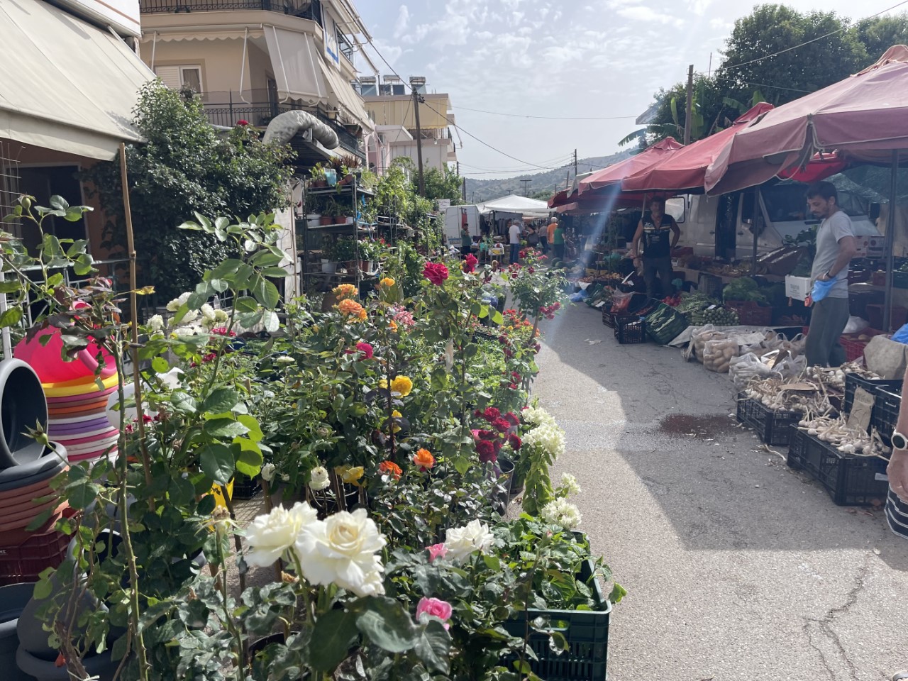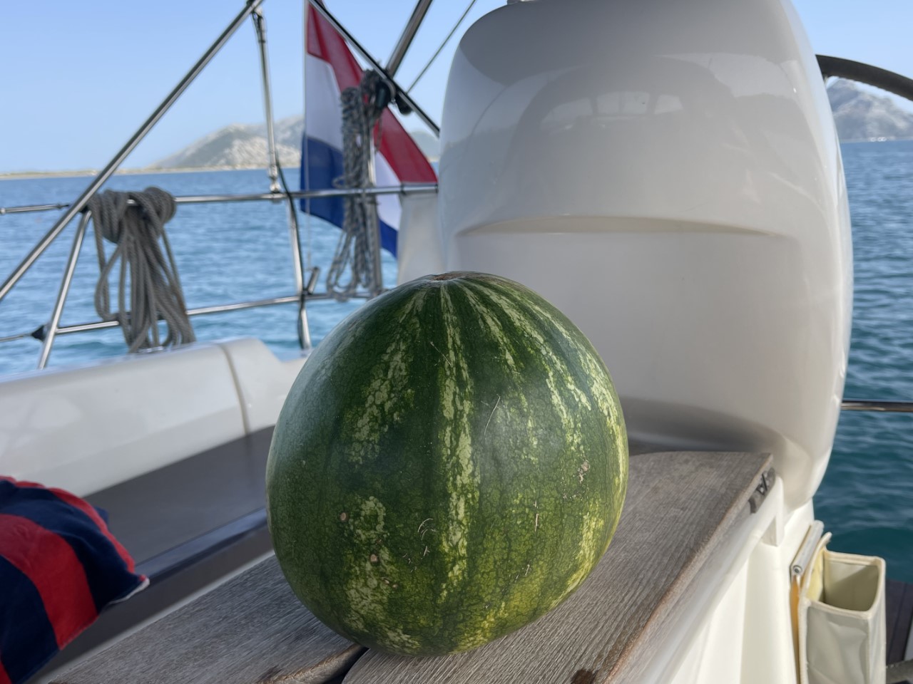 Voordat we naar de markt gaan spoelen we de Just maar weer eens schoon. De paar druppels regen van gisteren hebben een hoop zand meegebracht. We toppen de watertanks vol en gaan op zoek naar de markt. Waar we denken dat de markt is, op een centraal plein, vinden we niks. We wandelen nog wat door de winkelstraatjes en ineens zien we een paar kraampjes veel verder van de haven dan we hadden verwacht. We slenteren wat langs de kraampjes en kopen wat lekkere kersen, pruimen, een iets te grote watermeloen en een knoflook.