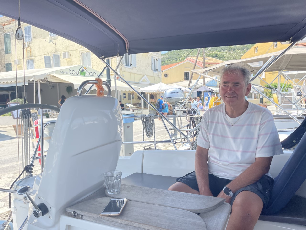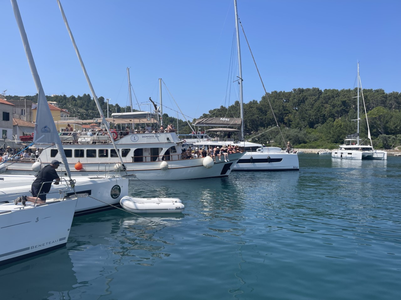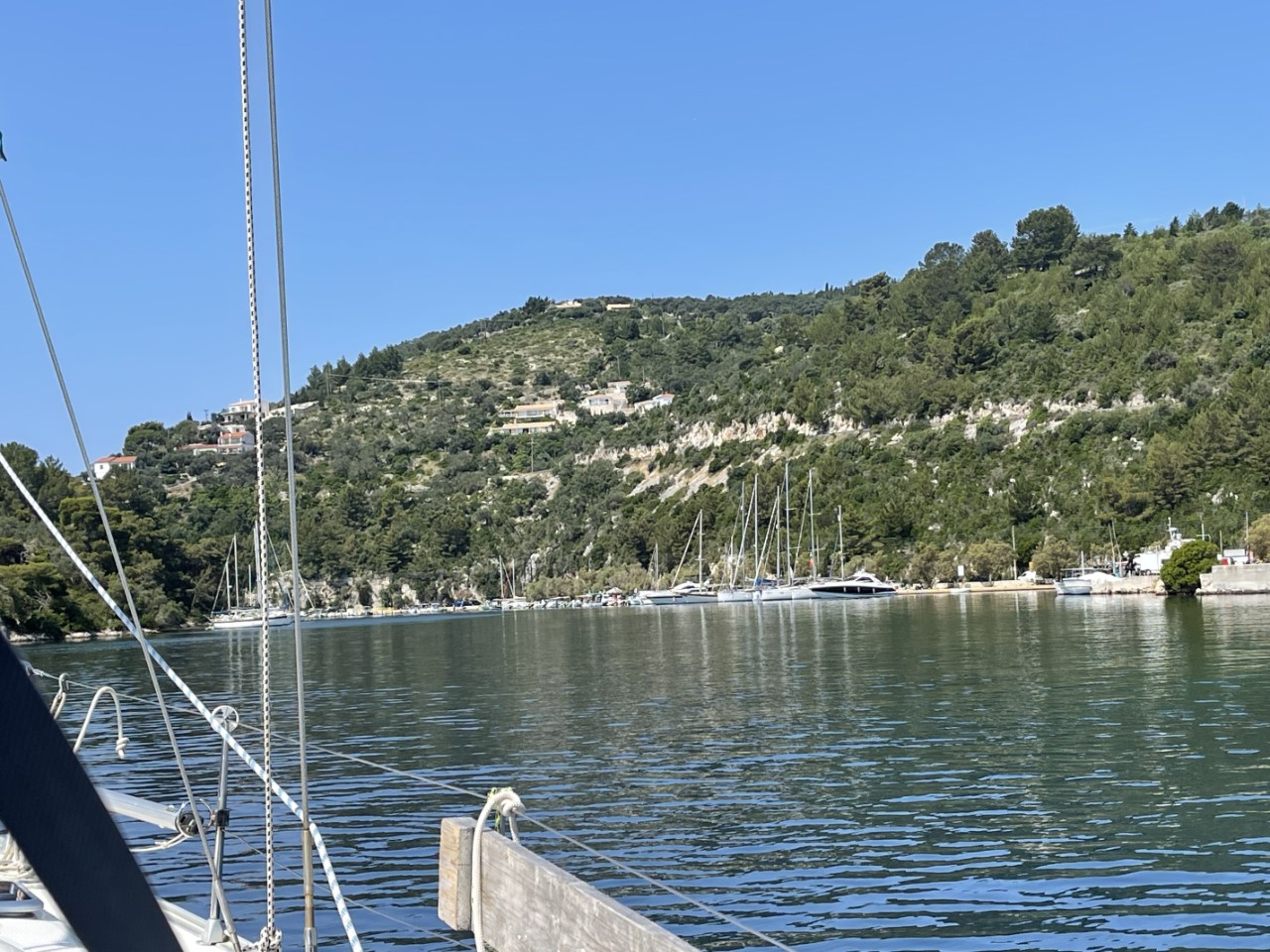 Het blijkt een leuke kade met een heleboel terrasjes. Het water is er smal en slingert rond een eiland. Volgens de verhalen is het er erg druk, dus we hebben een plan B: ergens vlakbij ons anker droppen. We vinden het binnenvaren al mooi. Via een flauwe bocht zien we al de eerste boten afgemeerd. Voor ons is het extra spannend, omdat we voor de tweede keer op z’n Grieks gaan afmeren (anker uit, naar achteren varen, lijnen naar de kant). De eerste keer was vorig jaar geweest in Syracusa op Sicilië.