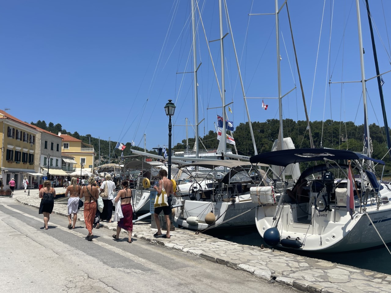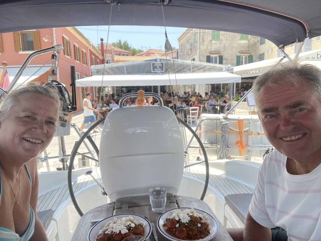 Al snel gaan we een stukje wandelen en op zoek naar een supermarkt. Sivota vonden we al een Griekse sfeer hebben, maar hier in Gaios voelen we ons echt in Griekenland. Hoewel de verhouding toerist-Griek 10:1 is. Waarvan geen Nederlanders. De voorraden zijn weer aangevuld en wij zakken met een drankje onderuit in de kuip. Er flaneert een constante stroom toeristen langs de kade. Voor de maaltijd maken we Griekse balletjes met rijst, tomatensaus en feta.