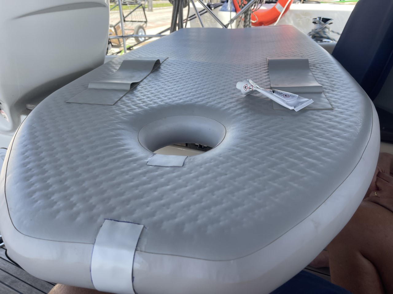 We halen een paar verse boodschapjes voor de maaltijd van vandaag en wat later haal ik wat plakspullen voor de bodem van het bijbootje, dat heel langzaam leegloopt. De bodem haal ik eruit en ik maak het bijbootje verder zoutvrij. Even goed laten drogen en ik heb hem opgevouwen en in een achterkajuit gepropt. De lekjes in de bodem zijn gelokaliseerd en het plakken kan beginnen. Als het goed is, moet de bodem morgen nog vol met lucht zitten.