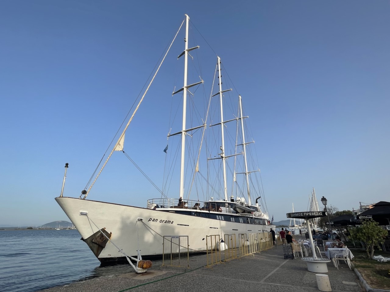 Zonder ankerlier hijs ik het anker vlotjes los uit de bodem. Aangekomen bij de kade van Preveza hebben we niet veel keus. Mede omdat de mooringlijnen kriskras door elkaar liggen. Gelukkig vinden een goed plekje, met mooringlijn, we liggen.