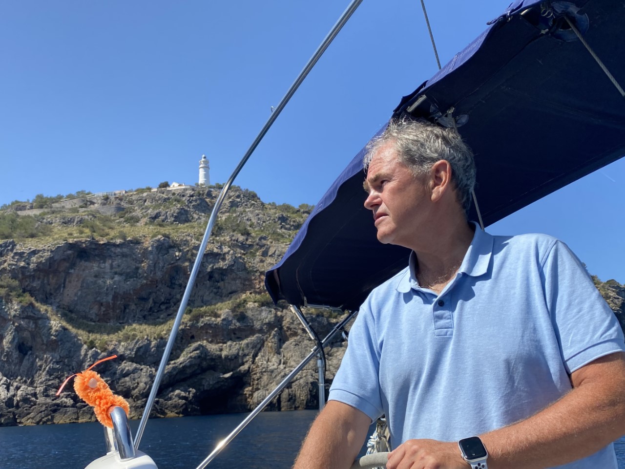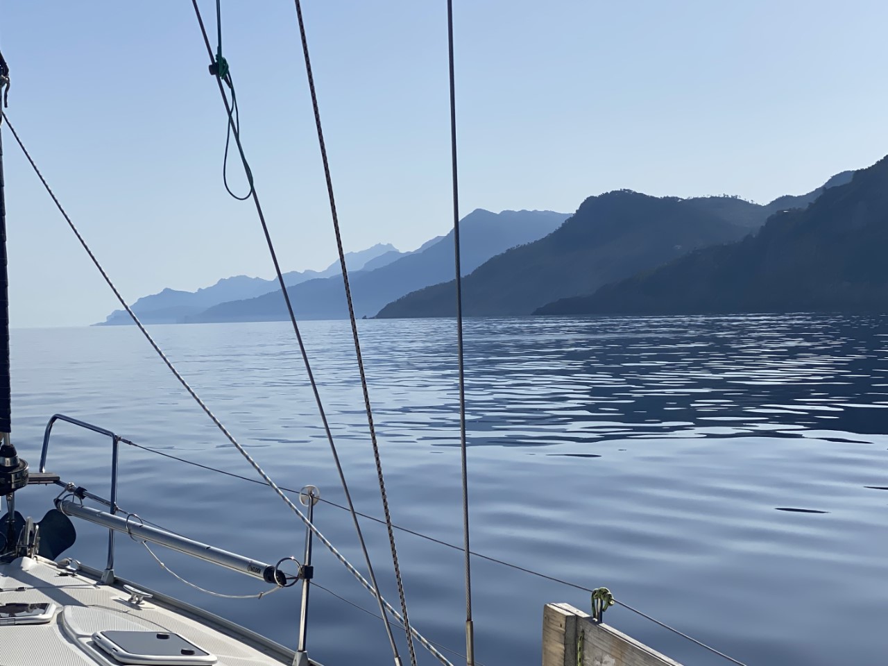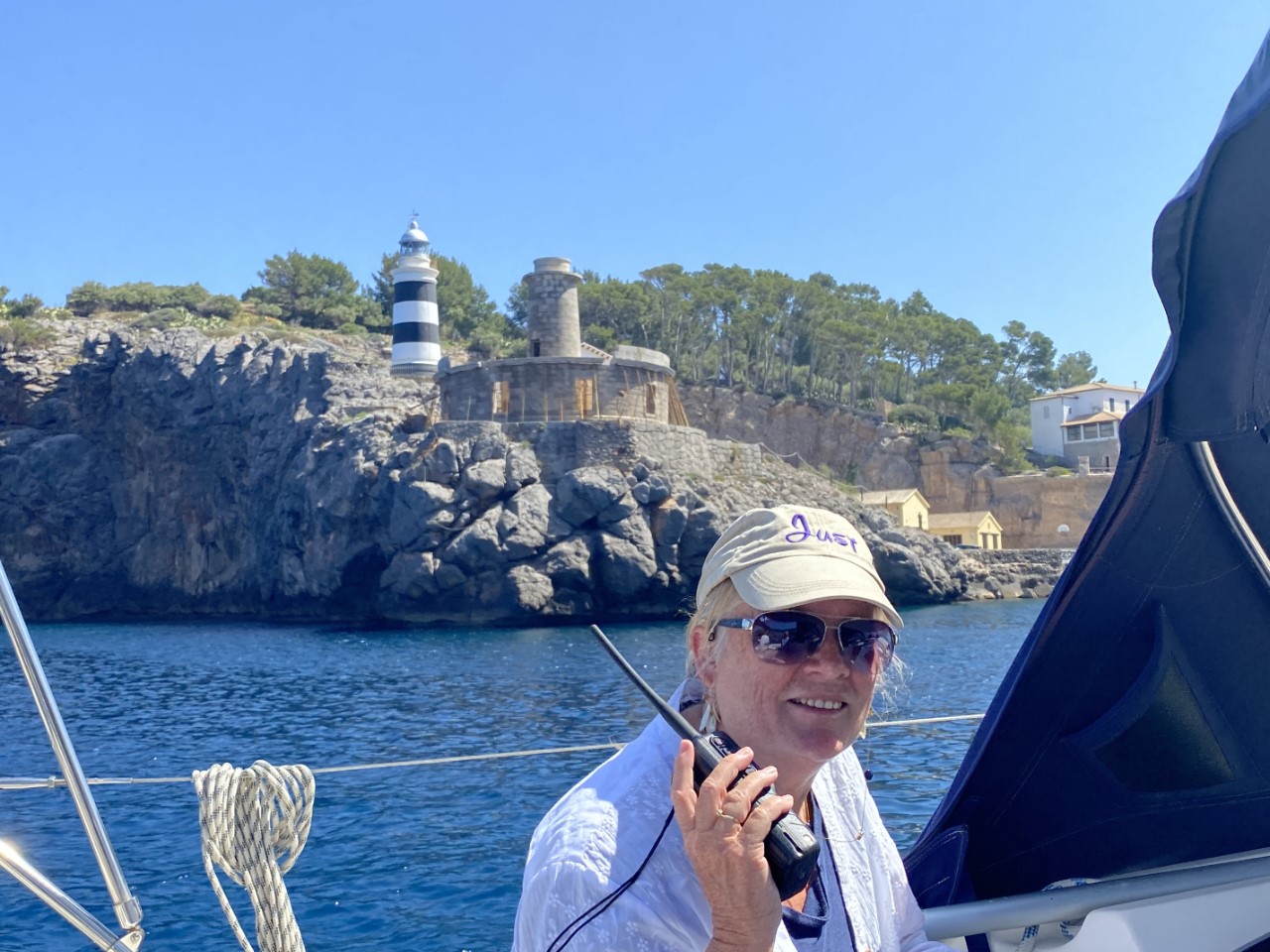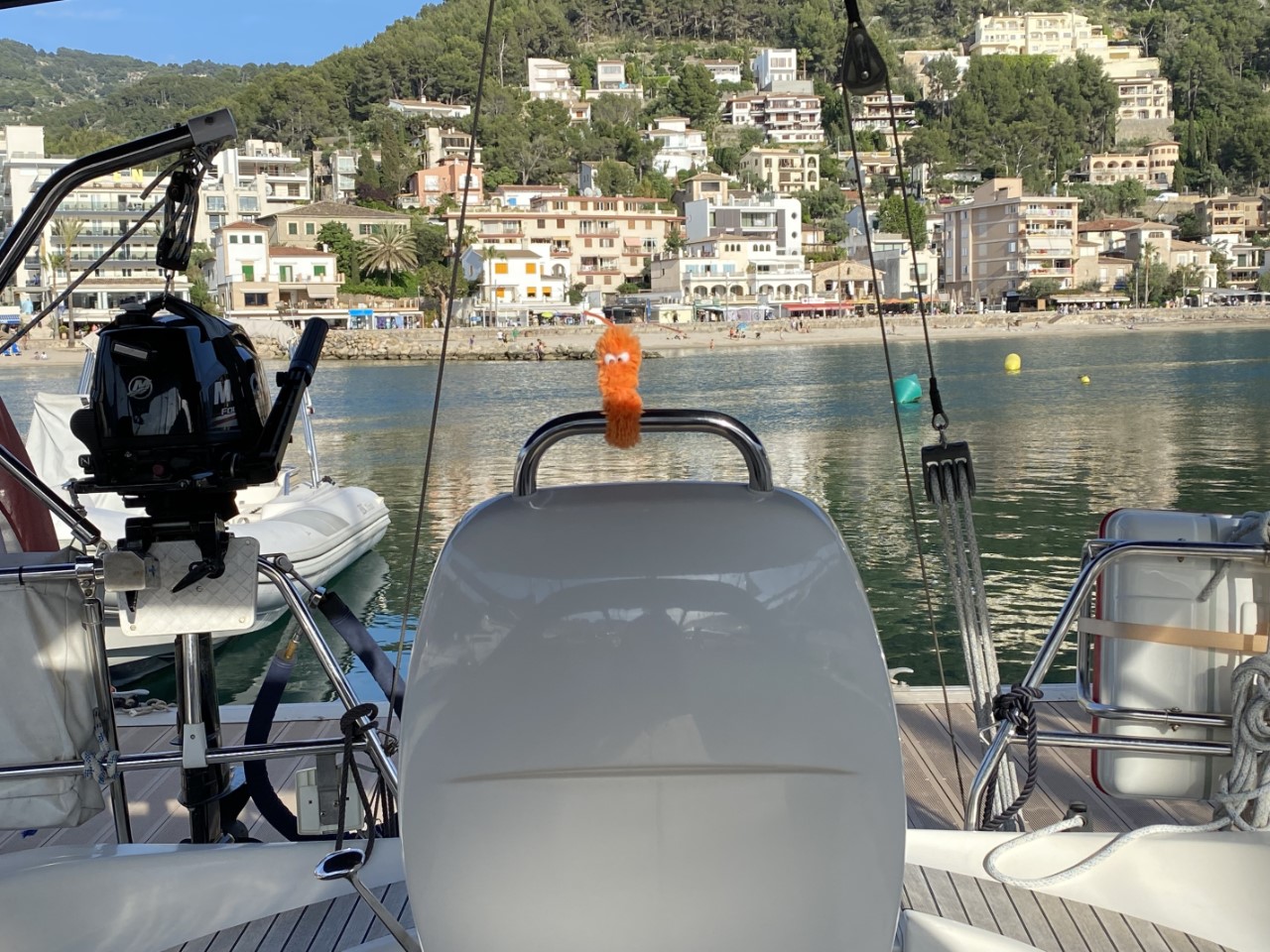 Ik was vroeg wakker en zei tegen Marianne: ik ga alvast varen, blijf jij nog even lekker dommelen. Na een klein uurtje meldt Marianne zich ook in de kuip. Inmiddels zijn we vlakbij Sant Elm en is ze net op tijd om de mooie kustlijn mee te maken tot Soller. Het is een ongerepte natuur en we zien slechts een stuk of drie dorpjes tegen de berghellingen. Er staan maar een paar huisjes, wat terrassen met druivenranken en verder zien we tot tweemaal toe dolfijnen. Jammer genoeg op ruime afstand. We hebben genoten van deze schitterende tocht op een spiegelgladde zee en geen zuchtje wind.