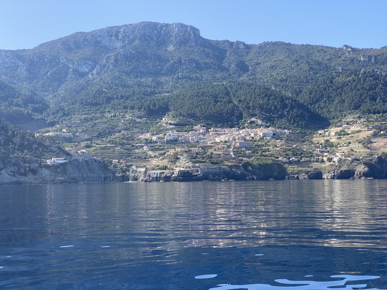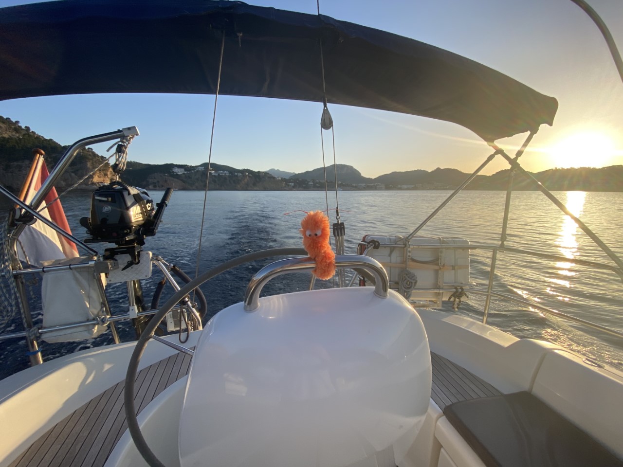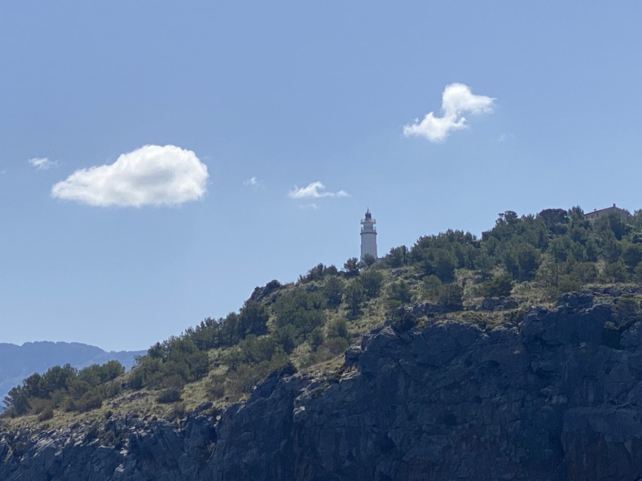 Ik was vroeg wakker en zei tegen Marianne: ik ga alvast varen, blijf jij nog even lekker dommelen. Na een klein uurtje meldt Marianne zich ook in de kuip. Inmiddels zijn we vlakbij Sant Elm en is ze net op tijd om de mooie kustlijn mee te maken tot Soller. Het is een ongerepte natuur en we zien slechts een stuk of drie dorpjes tegen de berghellingen. Er staan maar een paar huisjes, wat terrassen met druivenranken en verder zien we tot tweemaal toe dolfijnen. Jammer genoeg op ruime afstand. We hebben genoten van deze schitterende tocht op een spiegelgladde zee en geen zuchtje wind.