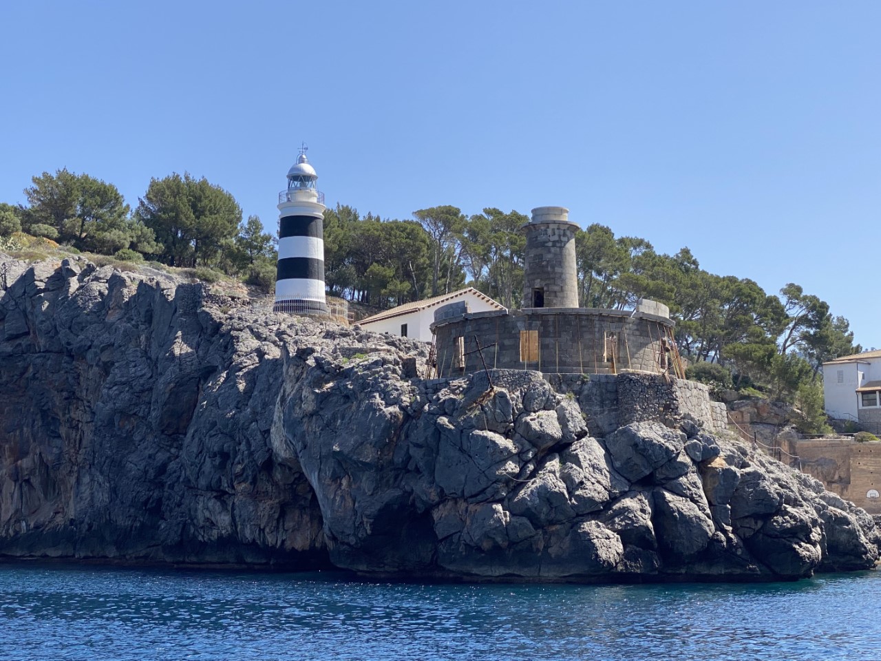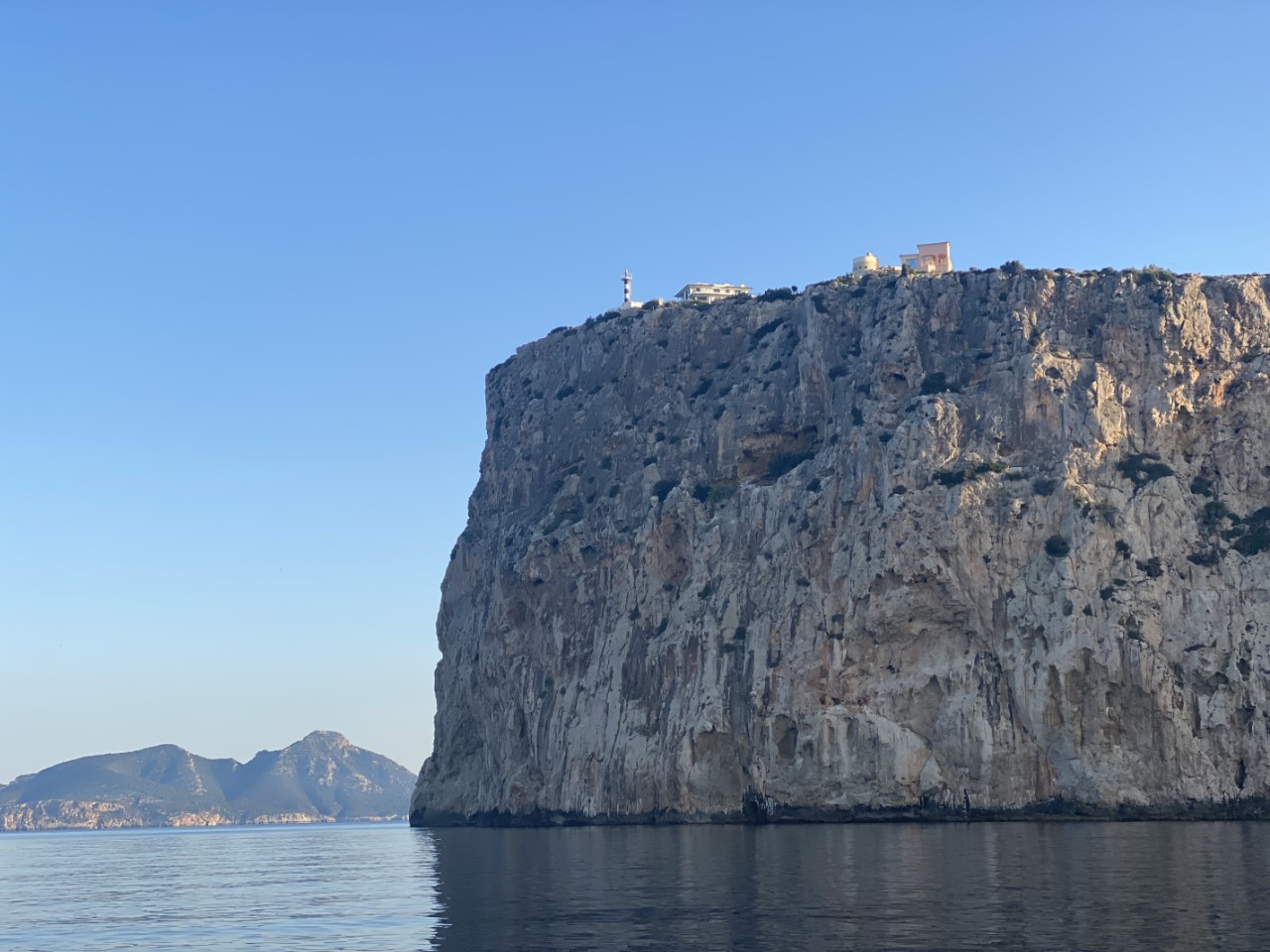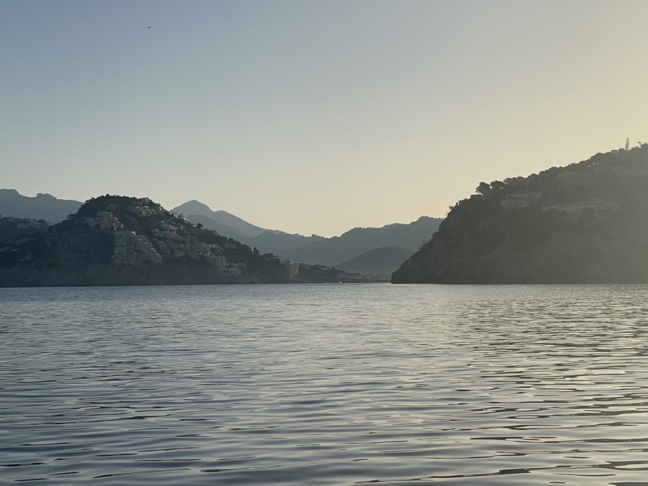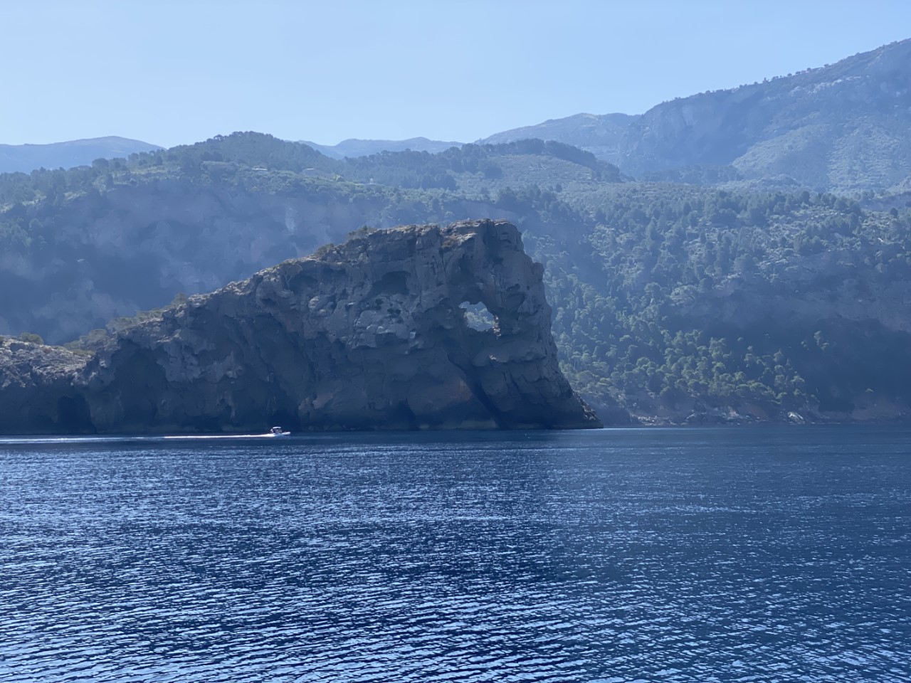 Ik was vroeg wakker en zei tegen Marianne: ik ga alvast varen, blijf jij nog even lekker dommelen. Na een klein uurtje meldt Marianne zich ook in de kuip. Inmiddels zijn we vlakbij Sant Elm en is ze net op tijd om de mooie kustlijn mee te maken tot Soller. Het is een ongerepte natuur en we zien slechts een stuk of drie dorpjes tegen de berghellingen. Er staan maar een paar huisjes, wat terrassen met druivenranken en verder zien we tot tweemaal toe dolfijnen. Jammer genoeg op ruime afstand. We hebben genoten van deze schitterende tocht op een spiegelgladde zee en geen zuchtje wind.
