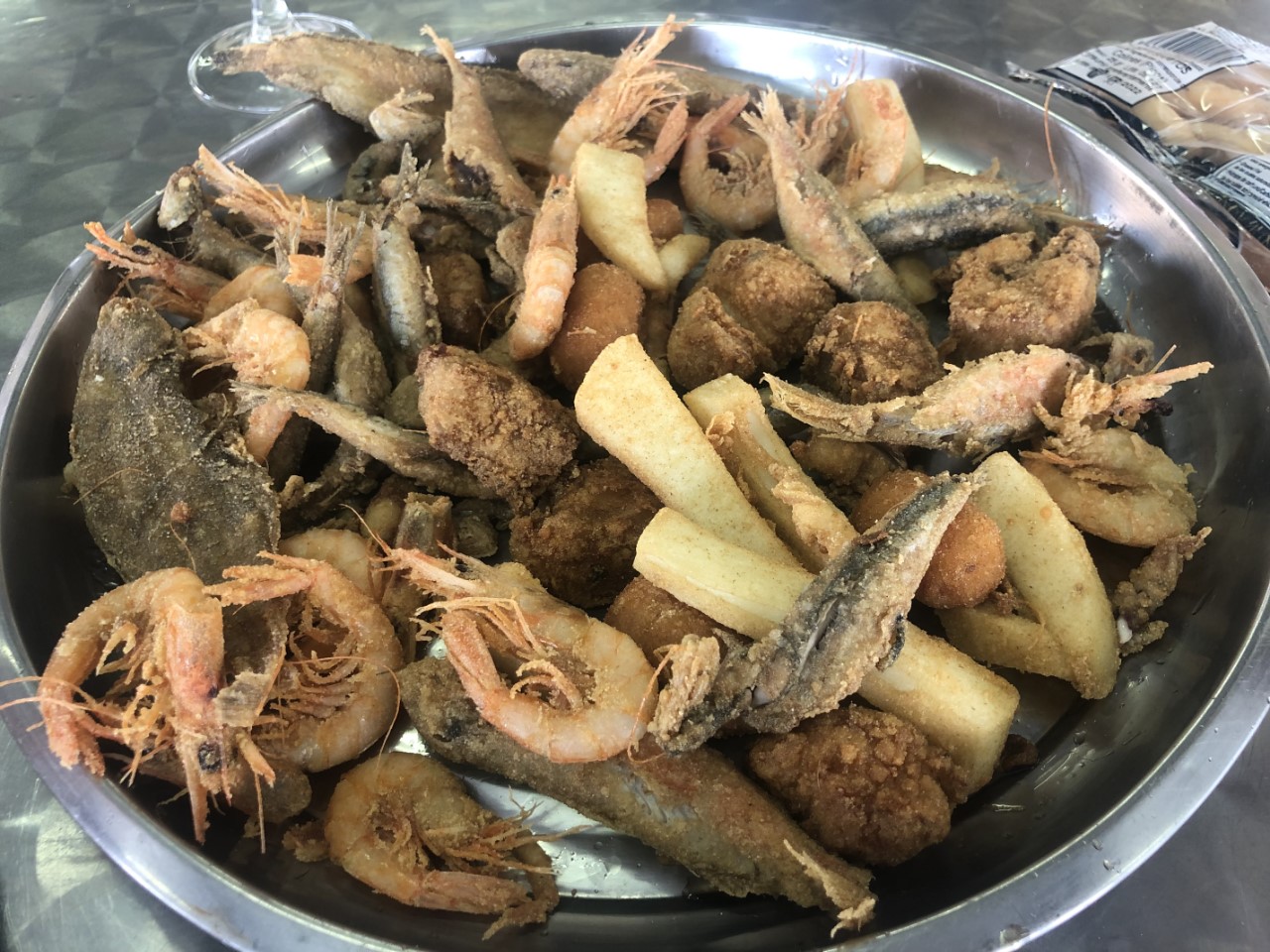 Borreltijd op de Primevere, ook daar twijfels over de komende dagen en ook daar kwamen we niet tot een oplossing. Wij hebben vanmiddag een leuk shabby, echt Spaans vissersrestaurantje gezien. Daar hebben we een half kilo frito variado, salpicon de marisco, ensaladilla en anillas genomen, alles smaakte heerlijk.