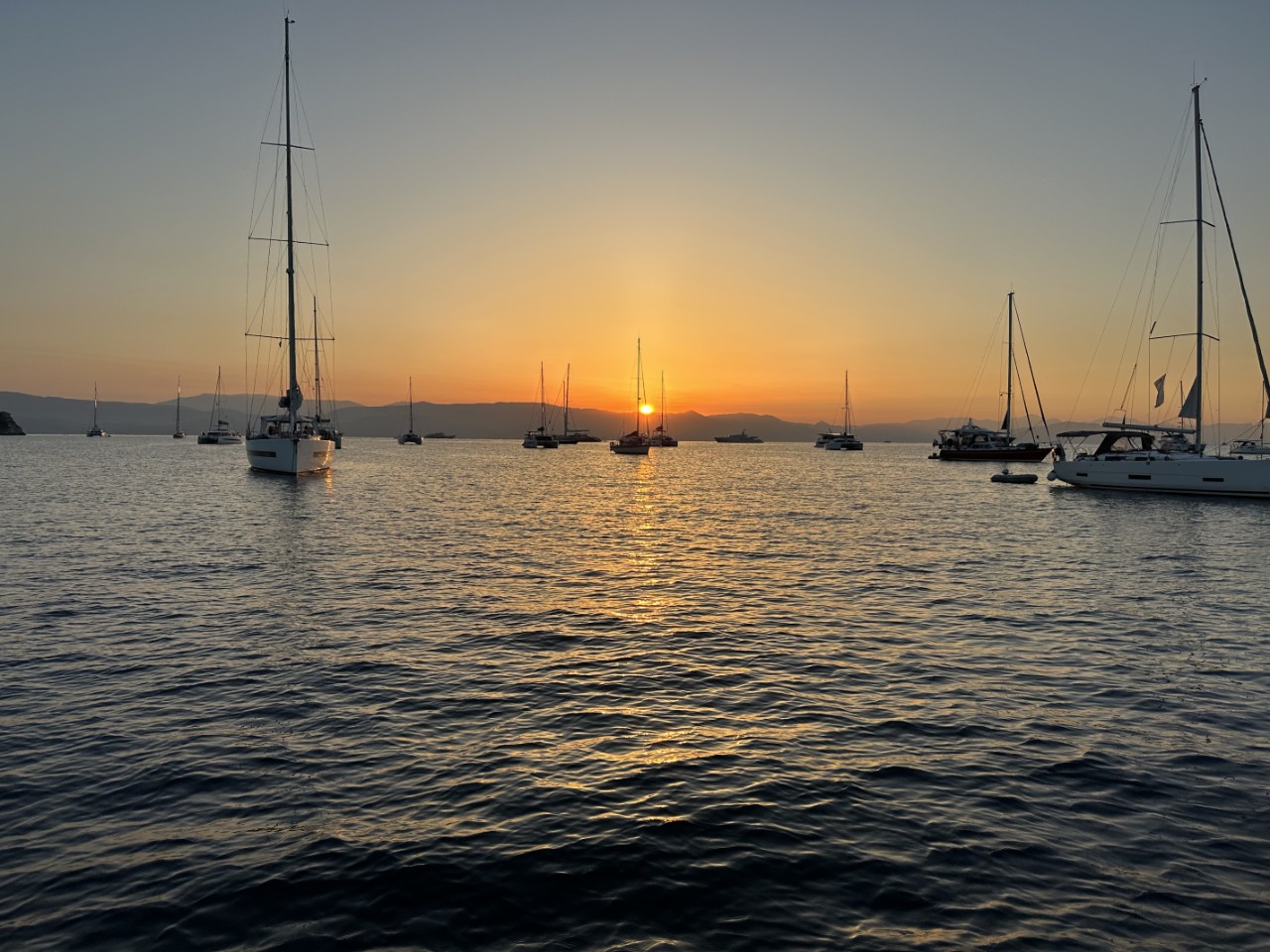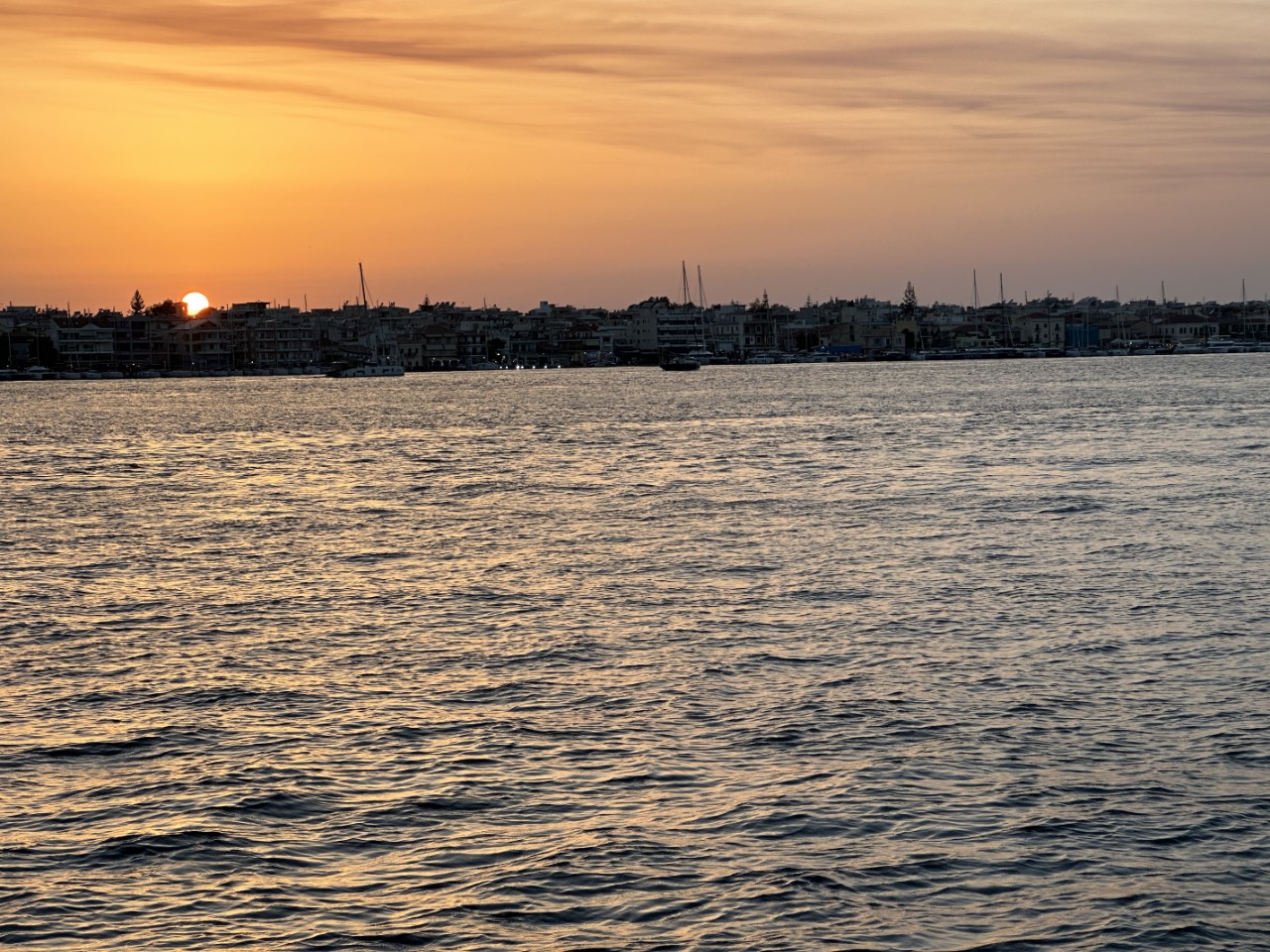 Met een mooie opkomende zon verlaten we Corfu-stad voor een lange tocht naar Preveza. We hebben de vaarplannen moeten wijzigen, omdat er een flinke storm voorspeld wordt. Niet op alle weersites, maar we houden het slechtste scenario maar aan.