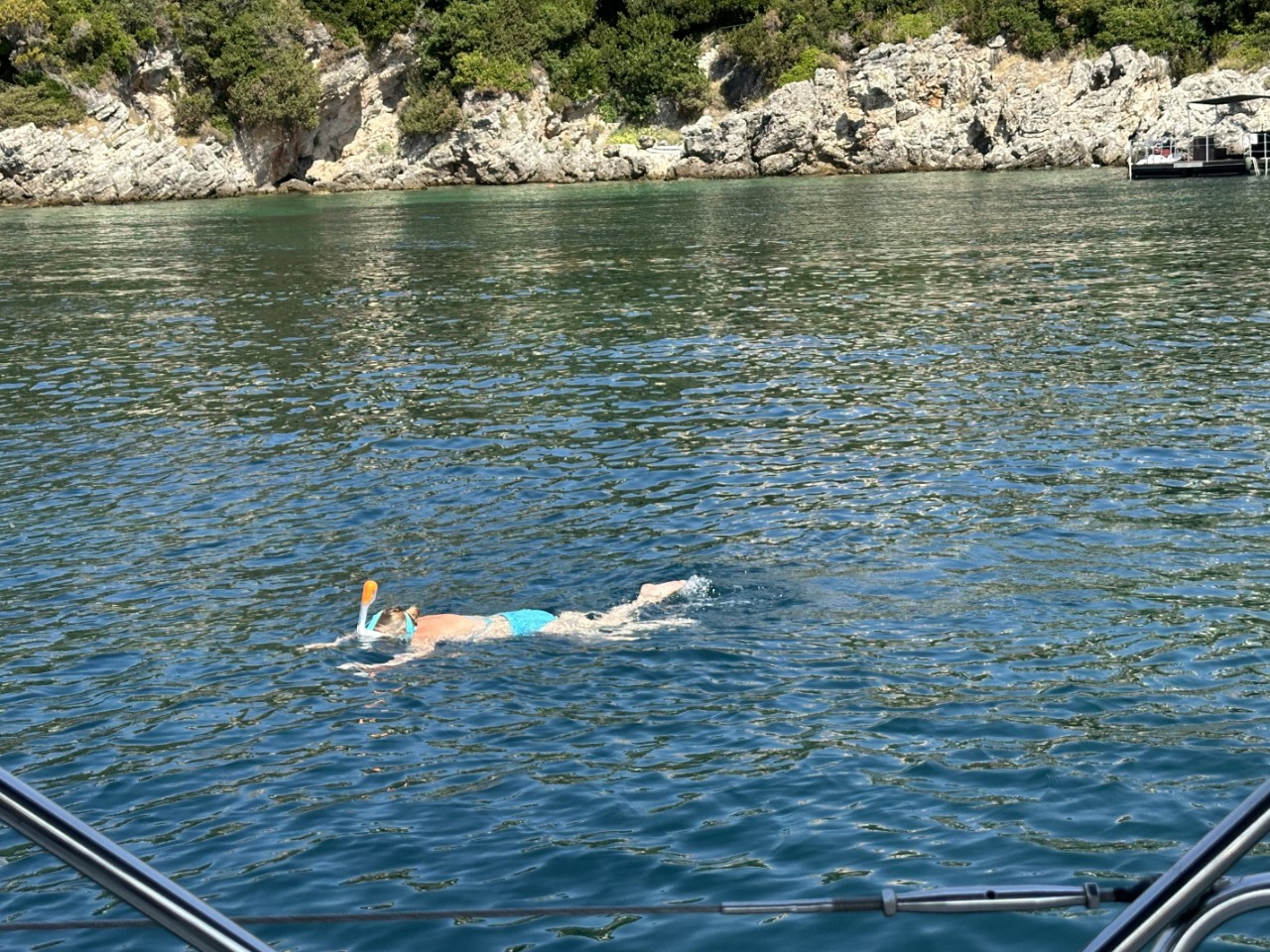 De hele weg is er tegenwind van 3-5 knopen. Dat is gelukkig niet veel. Het is een hele relaxte tocht en we zijn veel eerder dan verwacht bij Béla Vraka baai (Syvota). Ik stel voor om een klein uurtje te ankeren, omdat het daar zo mooi is. We willen even snorkelen. Daniel ziet een rode zeester en duizendpoten.