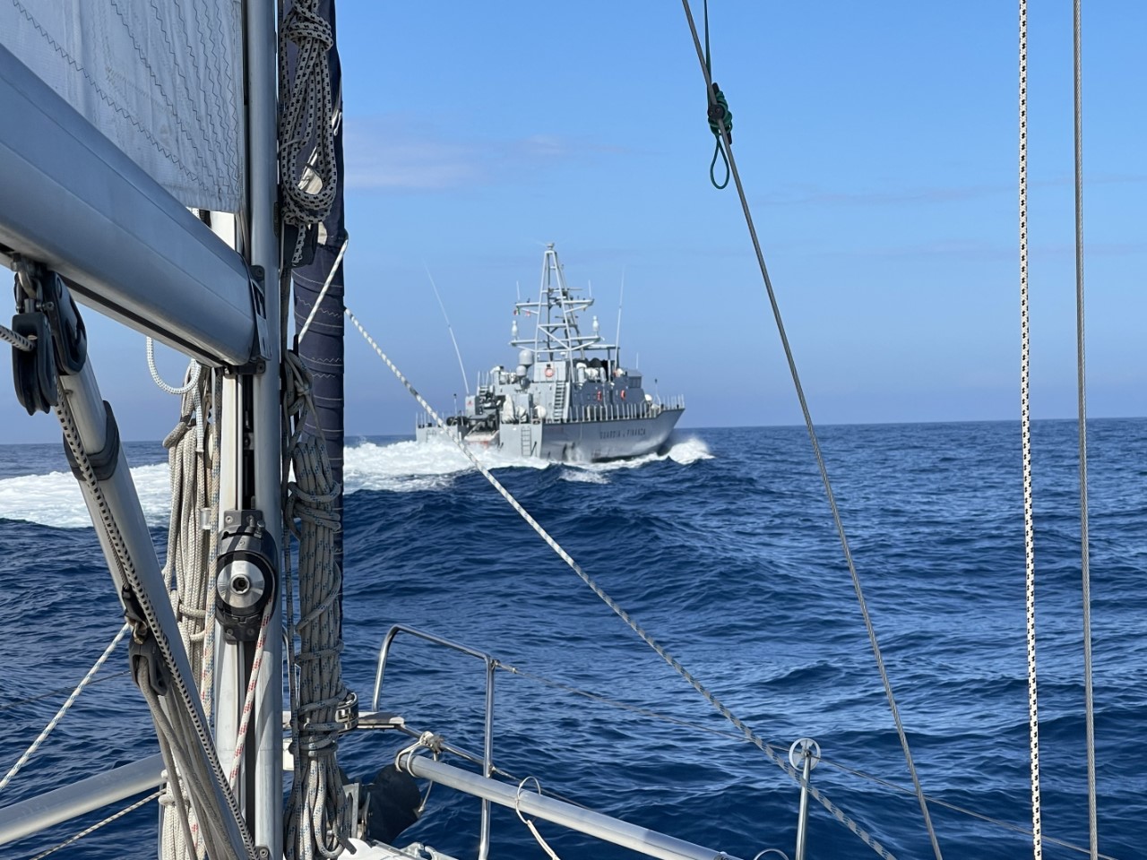 In de verte zien we een marineschip varen, die niet veel later z’n koers verlegt en recht op ons af komt varen. Als die vlakbij ons is, worden we opgeroepen via de marifoon. “Sailingvessel Just, this is Italian Warcraft”. We dachten even, dat we geënterd zouden worden, maar ze vragen van welke haven we zijn vertrokken, wat de bestemming gaat worden en met hoeveel personen we aan boord zijn. Ze zijn tevreden met onze antwoorden en zetten koers naar een andere zeilboot.