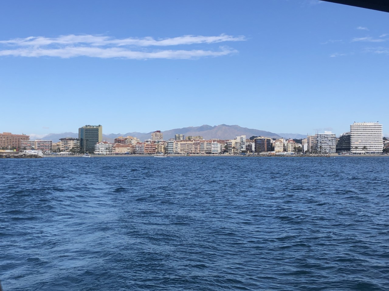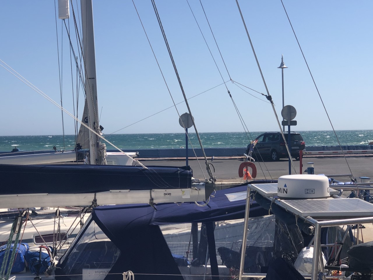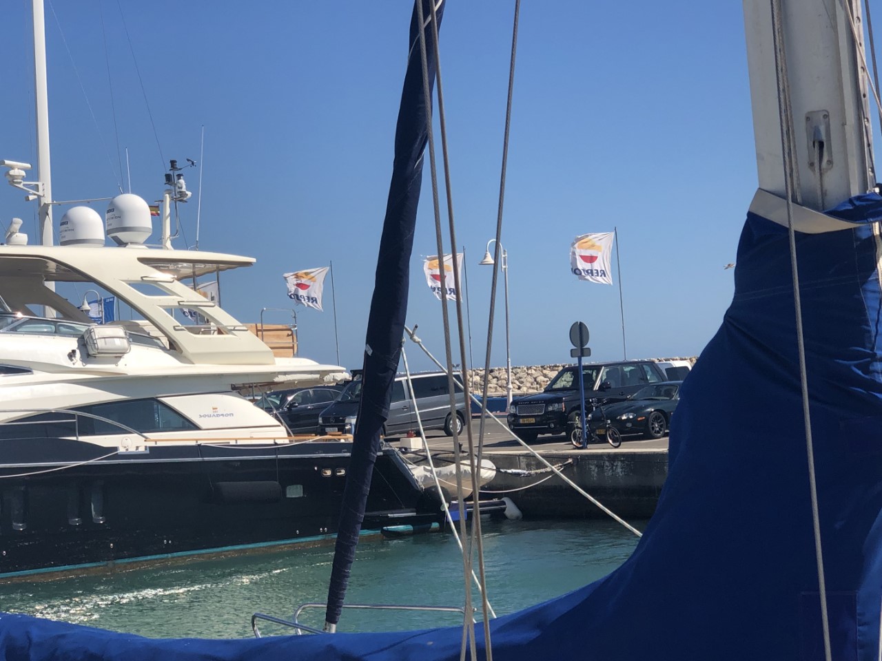 Na ons ontbijtje zijn we vertrokken voor een heel klein tochtje. We hebben direct na het verlaten van Fuengirola de fok uitgerold. De motor kon uit en met een ruime 5 knopen hadden we een voor-de-windse koers naar Benalmádema. De wind ging van 11 knopen naar ruim 20 knopen. En dat merkten we met aanleggen. Bij de meldsteiger ging het perfect, al hadden we daar last van de flinke golfslag die de havenkom inrolde. We kregen een smal plekje tussen 2 boten op de eerste steiger pal voor de haveningang. De bijna 20 knopen wind kwam bij het aanleggen van stuurboordkant, de eerste aanlegpoging hebben we afgebroken en de tweede poging ging van een leien dakje. We hebben nog een ruime tijd besteed aan het goed vastleggen van de achterlijnen, om vrij te blijven van de kade. Voor de loopplank hebben we een hele constructie bedacht, zodat die ook vrij blijft van de kade.