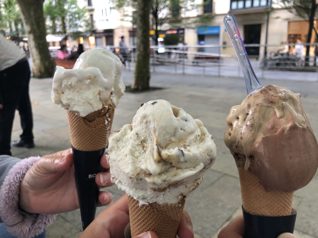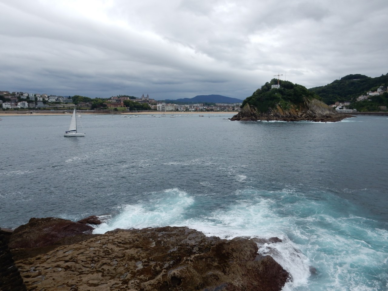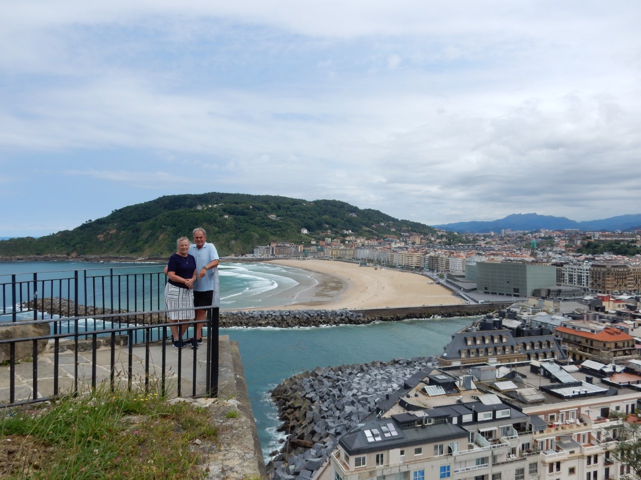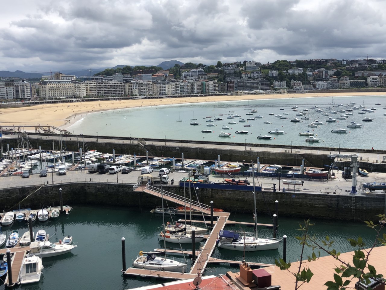 We waren weer eens vroeg vertrokken voor een heel kort tochtje naar San Sebastian. De kustlijn is echt schitterend, rotsen met hoge bomen en alles zomers groen, de bergen van de Pyreneeën op de achtergrond. Halverwege de tocht hing er voor ons een dreigende donkere wolk met wat bliksem en wat donderslag. Iets later begon het ook flink te plenzen, maar er was geen extra wind, al hadden we wel de zeilen opgerold. Op de motor hebben we de laatste paar mijl afgelegd. De binnenkomst was heel erg mooi aan beide kanten een flinke berg met volop bebossing en voor ons een lang gestrekt strand. De haveningang was heel erg smal en het haventje niet veel groter met een stuk of 10 ligplaatsen voor bezoekers. Het was even een probleem om van de steigers af te komen. Er stond een groot hek op met een betaalautomaat, waar je na betaling een barcode krijgt om de deur te ontgrendelen. Maar wij met ons Passeport Escale kaart liggen hier gratis en die optie had de automaat niet. Gelukkig kwam er iemand naar binnen, zodat wij naar buiten konden om de havenmeester te zoeken. Pfff, de administratie is geregeld en de ontvangst met de passeport weer uitermate vriendelijk. In de Reeds Almanak was te lezen, dat de faciliteiten “don’t match up the elegance of the city”, maar dat was juist het tegenovergestelde. Een mooie douchegelegenheid met een grote regendouche. Wij liggen met het haventje vlak bij het oude centrum met smalle straatjes, veel pinxos tentjes en leuke kleine winkeltjes. Het ontbijt was er vanmorgen een beetje bij ingeschoten (oud brood), dus hebben we een stokbrood meegenomen en gebruncht op de Just. In de middag hebben we de Urgellberg beklommen. Het was een flinke klim met steile hellingen en veel traptreden, maar we hadden een mooi uitzicht over San Sebastián. Via de Mercado en de Lidl, waar we wat boodschappen hebben gehaald, zijn we terug gekropen naar de Just. We hebben snel een maaltje bereid en voor een ijsje gingen we nog even een wandeling maken door een heel gezellig San Sebastian.