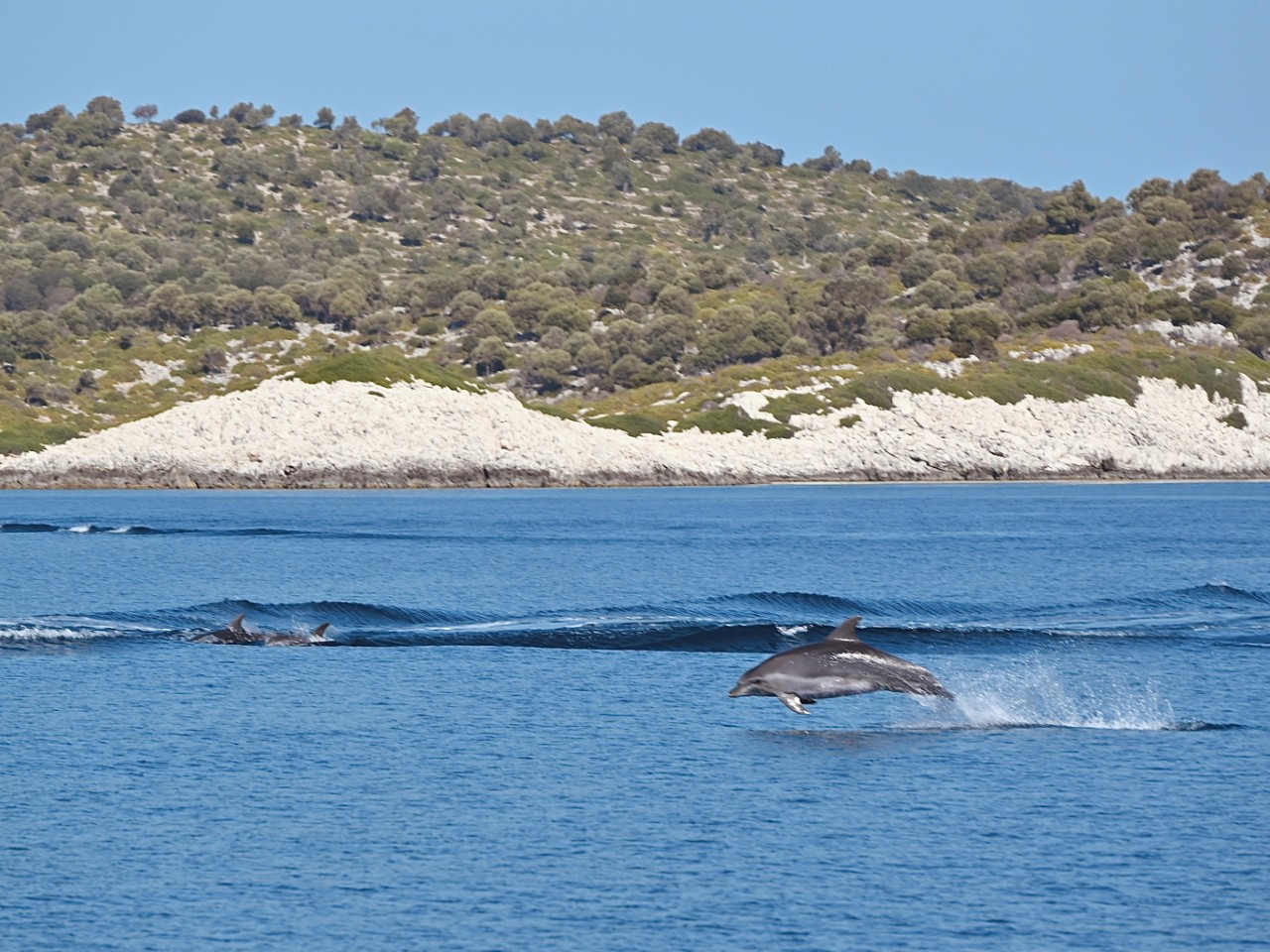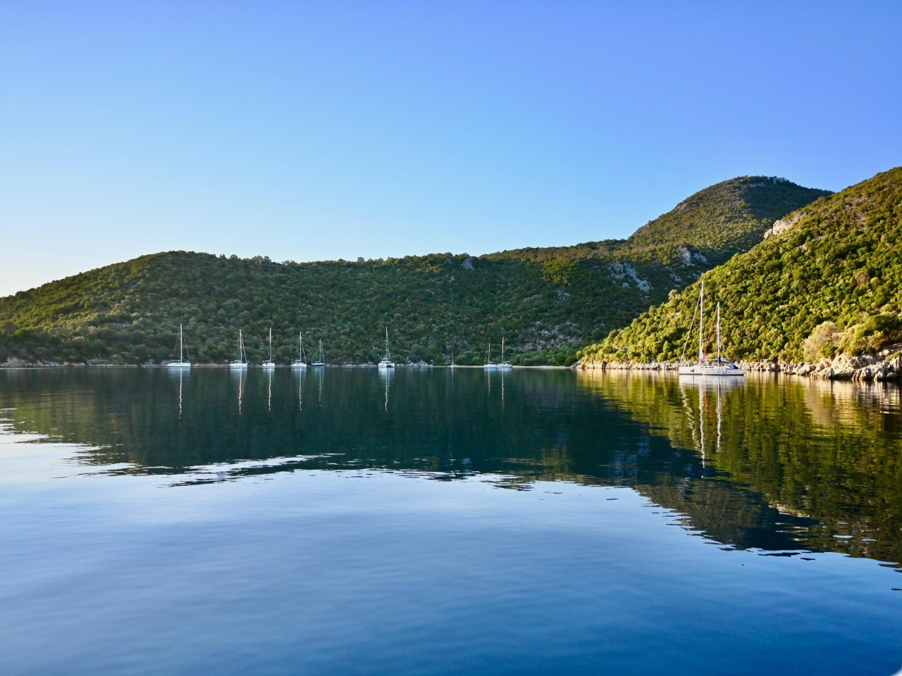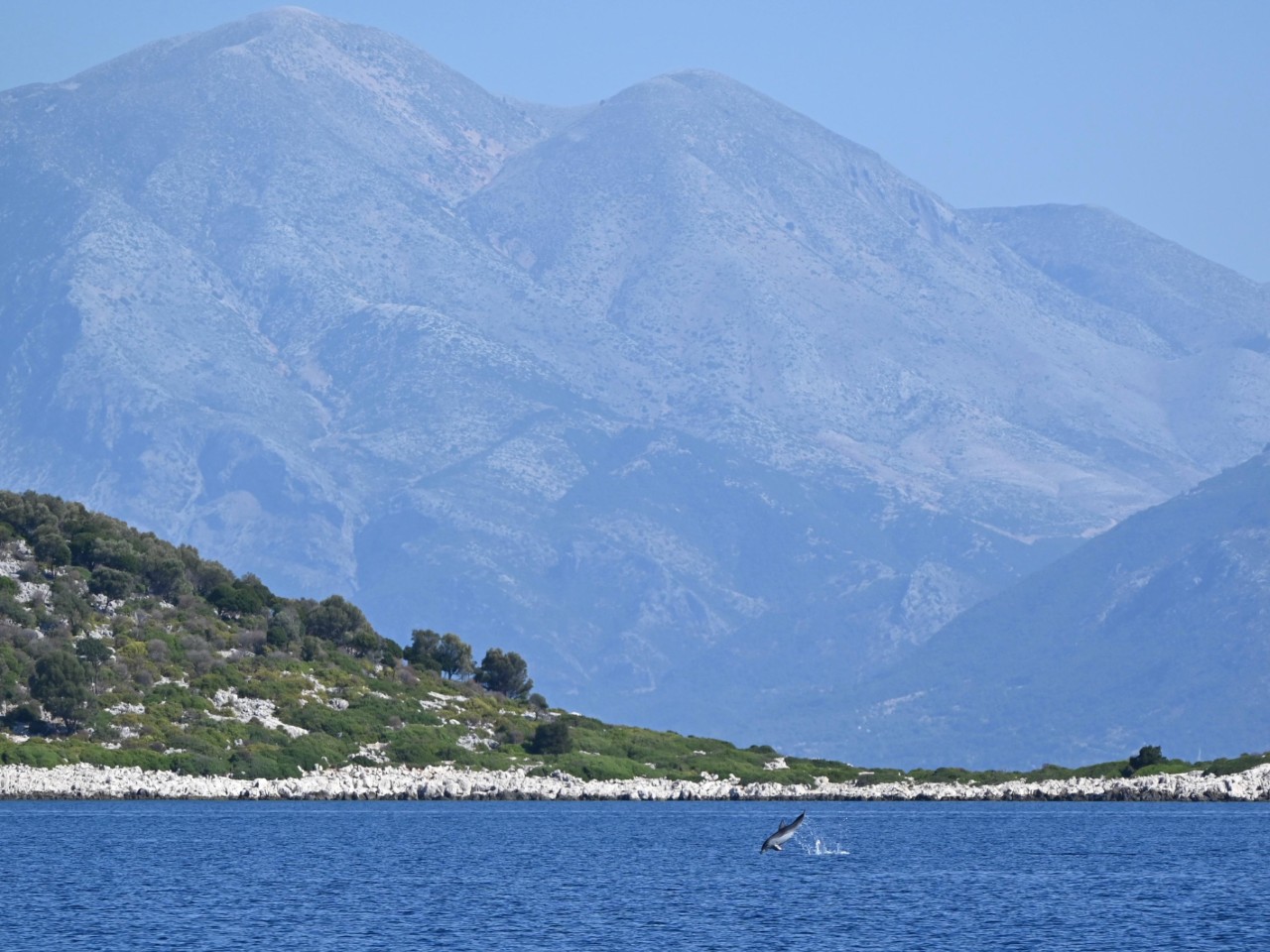 We verlaten de baai van Kalamos en varen langs nog een paar hele mooie baaien, voordat we de oversteek maken naar het eiland Kastos. Ook daar varen we langs verschillende baaien om een kijkje te nemen. We varen verder naar een verboden eiland, Atakos. Waarom het verboden is, is een raadsel. Dan spot Marianne aan bakboord dolfijnen. Mark stuurt snel naar bakboord en we laveren iets later tussen tien5tallen dolfijnen. Heel mooi en we maken dan ook veel foto’s en filmpjes. Na dit mooie natuurfestijn maken we de oversteek naar Atakos, waar we bij diverse baaien volop zeil- en toeristenboten zien liggen achter hun anker. Voor ons een vrijbrief om ook een mooie baai uit te zoeken. Dat wordt de Atoka Cliff Bay, waar we het anker op een mooie zandplaat droppen. We houden er even een snorkel- en lunchpauze. We hebben echt genoten daar van het heldere water, de vele visjes en natuurlijk de lunch.