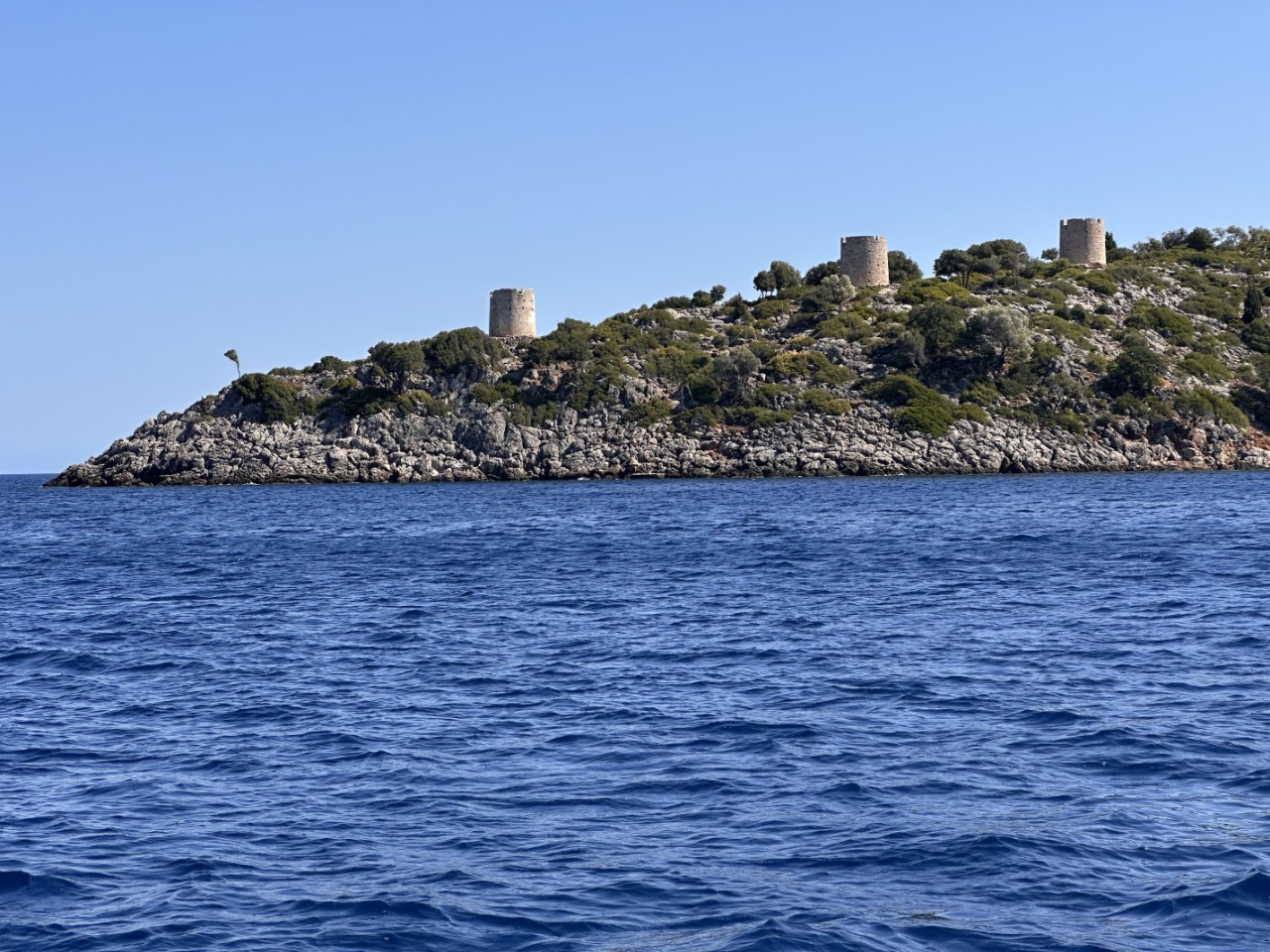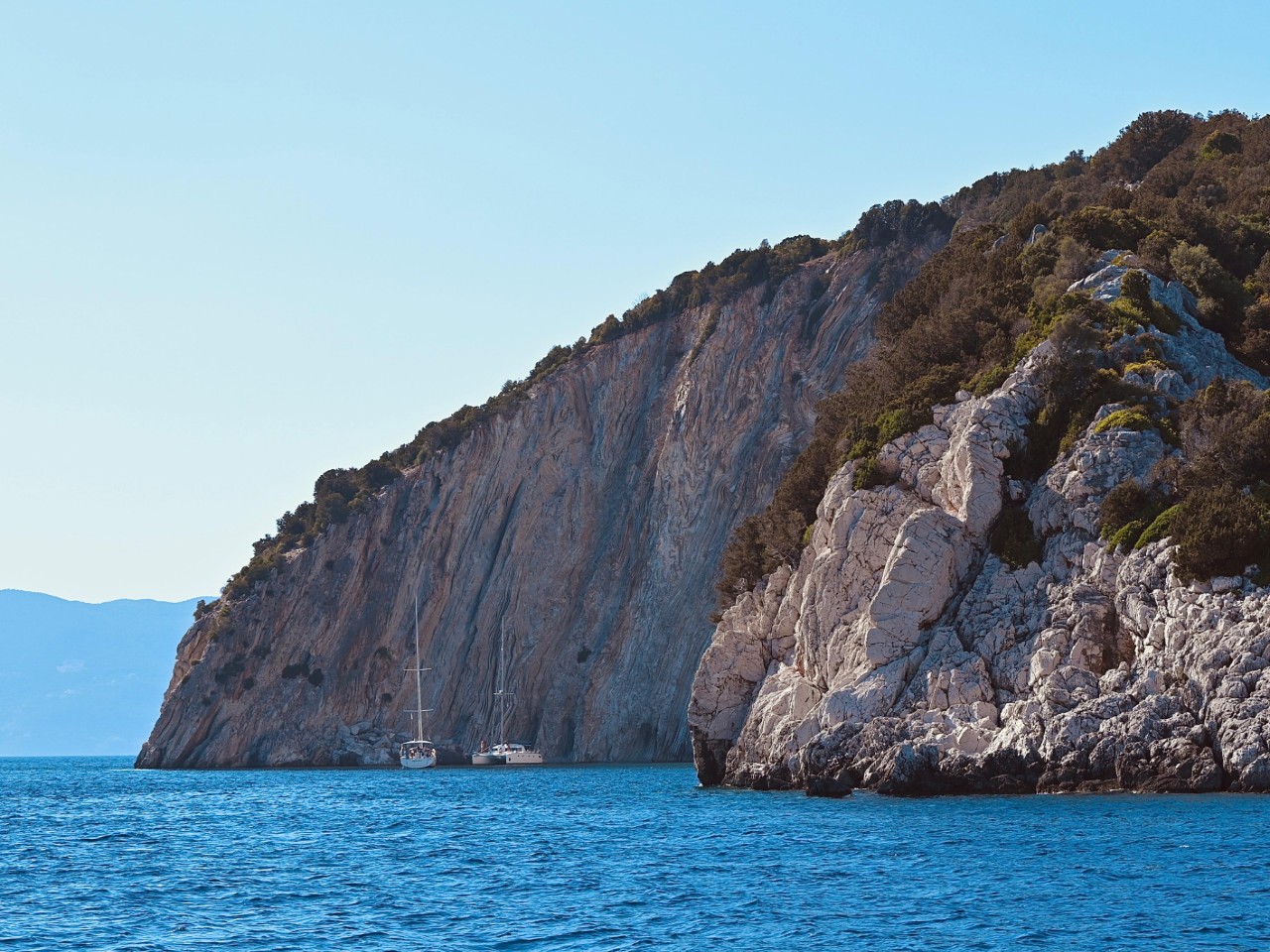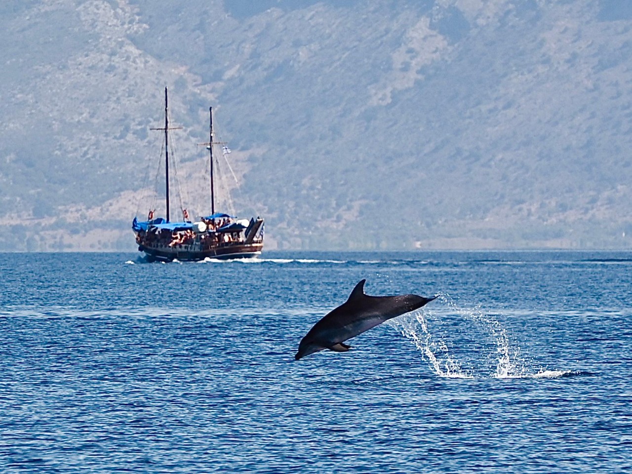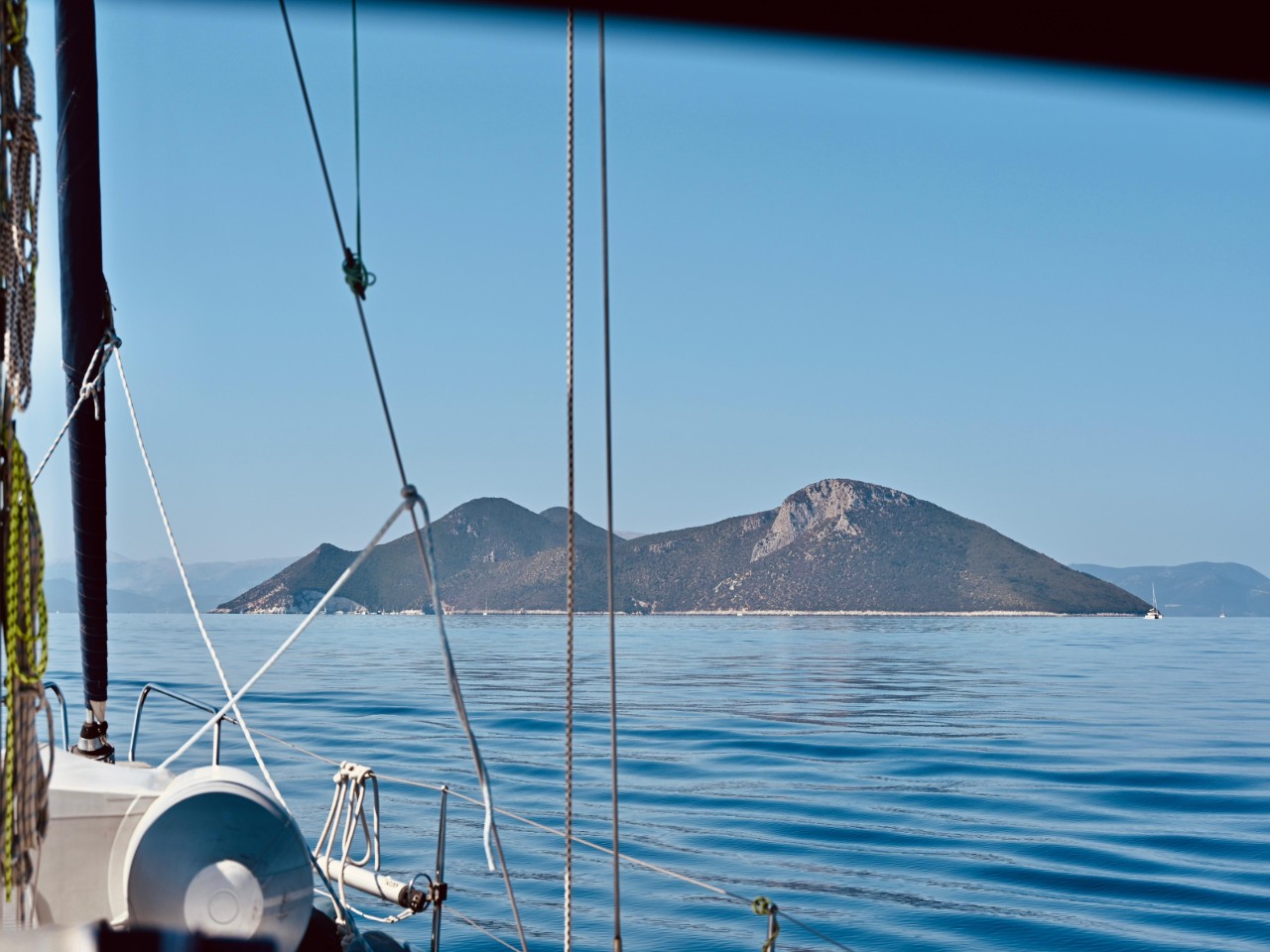 We verlaten de baai van Kalamos en varen langs nog een paar hele mooie baaien, voordat we de oversteek maken naar het eiland Kastos. Ook daar varen we langs verschillende baaien om een kijkje te nemen. We varen verder naar een verboden eiland, Atakos. Waarom het verboden is, is een raadsel. Dan spot Marianne aan bakboord dolfijnen. Mark stuurt snel naar bakboord en we laveren iets later tussen tien5tallen dolfijnen. Heel mooi en we maken dan ook veel foto’s en filmpjes. Na dit mooie natuurfestijn maken we de oversteek naar Atakos, waar we bij diverse baaien volop zeil- en toeristenboten zien liggen achter hun anker. Voor ons een vrijbrief om ook een mooie baai uit te zoeken. Dat wordt de Atoka Cliff Bay, waar we het anker op een mooie zandplaat droppen. We houden er even een snorkel- en lunchpauze. We hebben echt genoten daar van het heldere water, de vele visjes en natuurlijk de lunch.