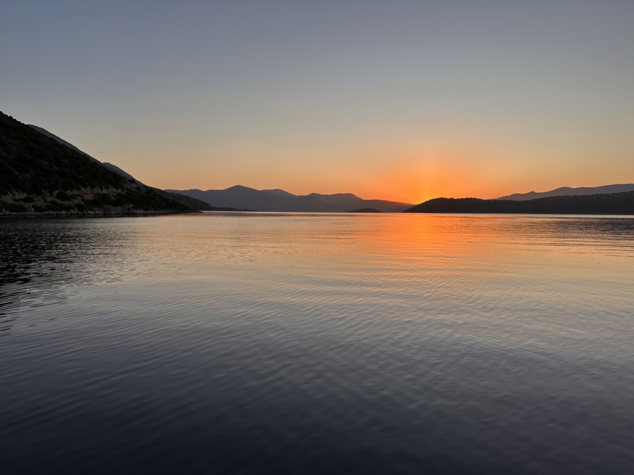 Het is een super mooie zonsopkomst in deze baai. Ik heb er dan ook een serie foto’s van gemaakt (leuk voor Facebook). Terwijl ik zit te genieten, wordt er op het grote jacht hard gewerkt om het jacht weer spik en span te maken, verschil moet er wezen.