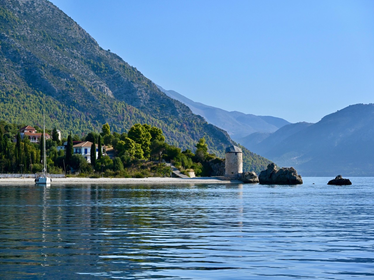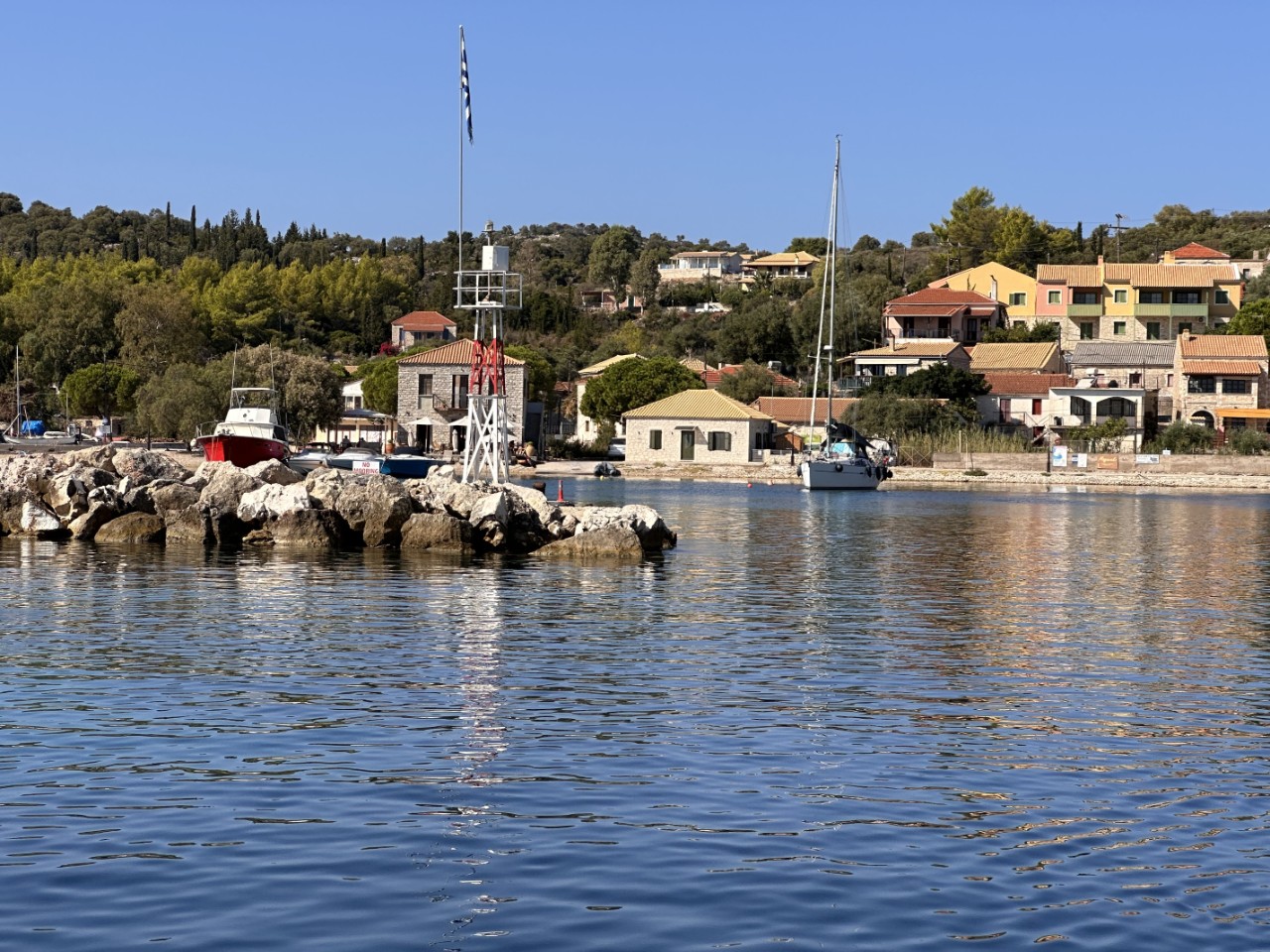 Na de lunch zeilen we met bijna 6 knopen naar het eiland Ithaka. Ons einddoel hebben we nog niet echt bepaald, maar er zijn aan boord wat voorkeuren. Bij de drie Genuese torentjes van Kioni zijn we noordelijker gaan varen langs de kustlijn van Ithaka. Bij Frikes steekt er weer een vervelend windje op van wel ruim 25 knopen pal op de boeg, gepaard gaande met hoge golven met witte kopjes. Ook bij aankomst in de favoriete baai van Marmagkas is het qua wind en golven niet veel beter. Een beetje vergelijkbaar met de aankomst van gisteren. Toen zwakte de wind bij schemering af en we verwachten vandaag hetzelfde. Het is nu nog even afzien, mede omdat we veel liggen te zwieren achter ons anker. Ook zijn er altijd zeilboten die onder deze omstandigheden te dicht bij ons willen ankeren. We genieten wel van sommige ankercapriolen. Een grote Hanze gooit z’n anker uit, niet met z’n boeg in de wind maar met z’n achtersteven. Zo laat hij vooruitvarend het anker zakken, dat dan ook flink langs de romp schuurt. Heel apart deze techniek. Wij bereiden ondertussen een heerlijke Spaanse tortilla in deze Griekse baai, moet kunnen.